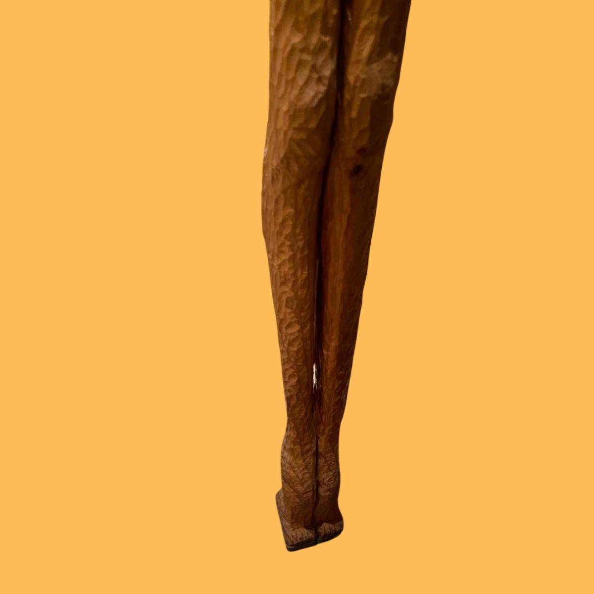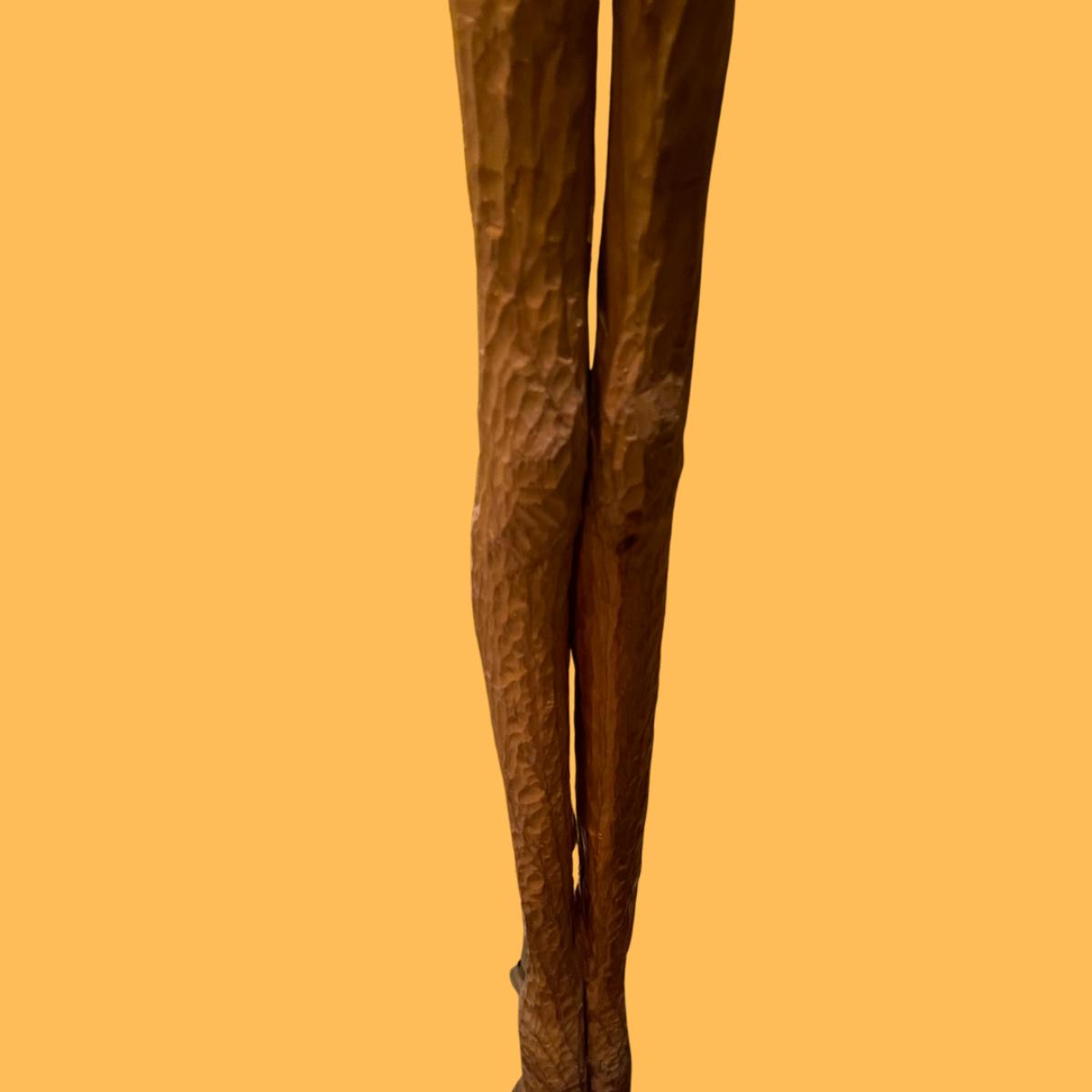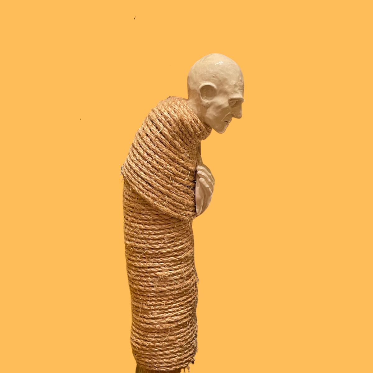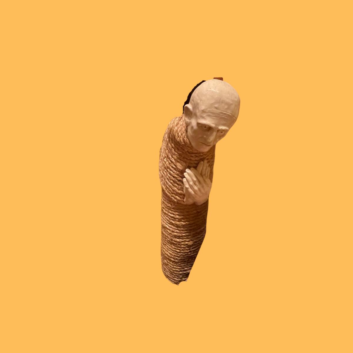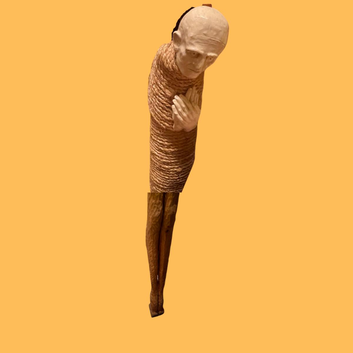 Gary Oaks is a local artist who has his work in numerous galleries in NOLA including Inferno. This piece was specifically made for the owner and is a one of a kind. Gary Oaks' bound and predetermined pilloried male figures tower above. The aging faces, betraying, betrayed or regretful, perch atop vulnerable, malnourished legs that are both formed and immobilized by the same wrapped material from the neck to the waist. Oaks has released only their legs from the rope wrapping to permit them a stance of meditative repose. Priceless piece.