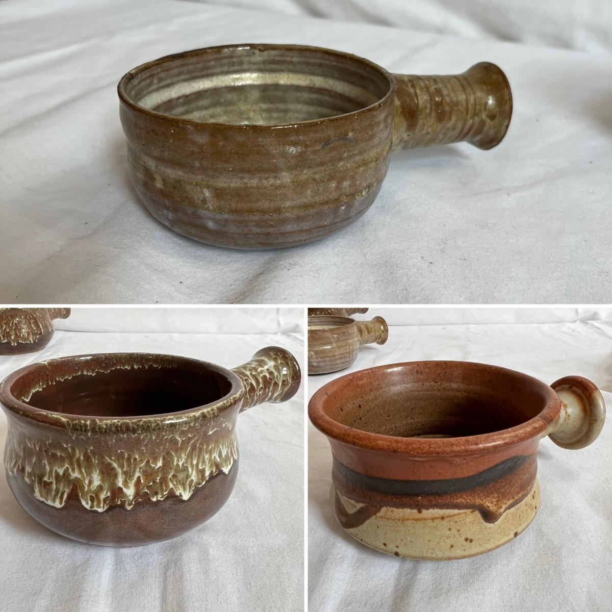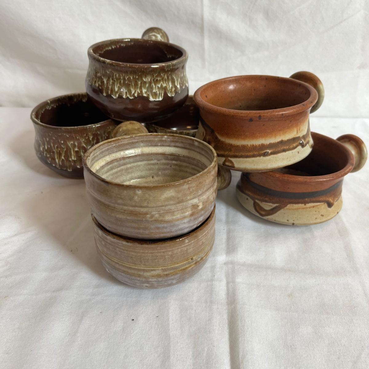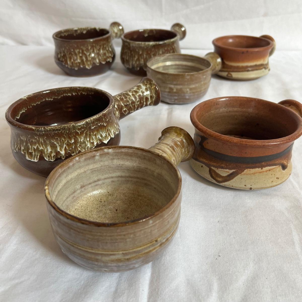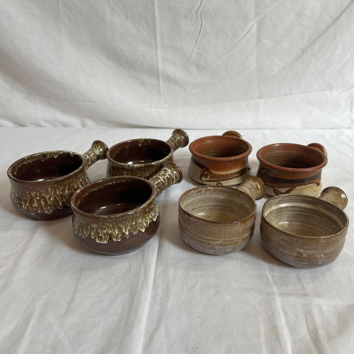 Seven pottery handled soup bowls includes pairs that are matching for two pairs and a set of three. See photos for measurements. There is one chip on one of the handles - see picture included. Shipping Available