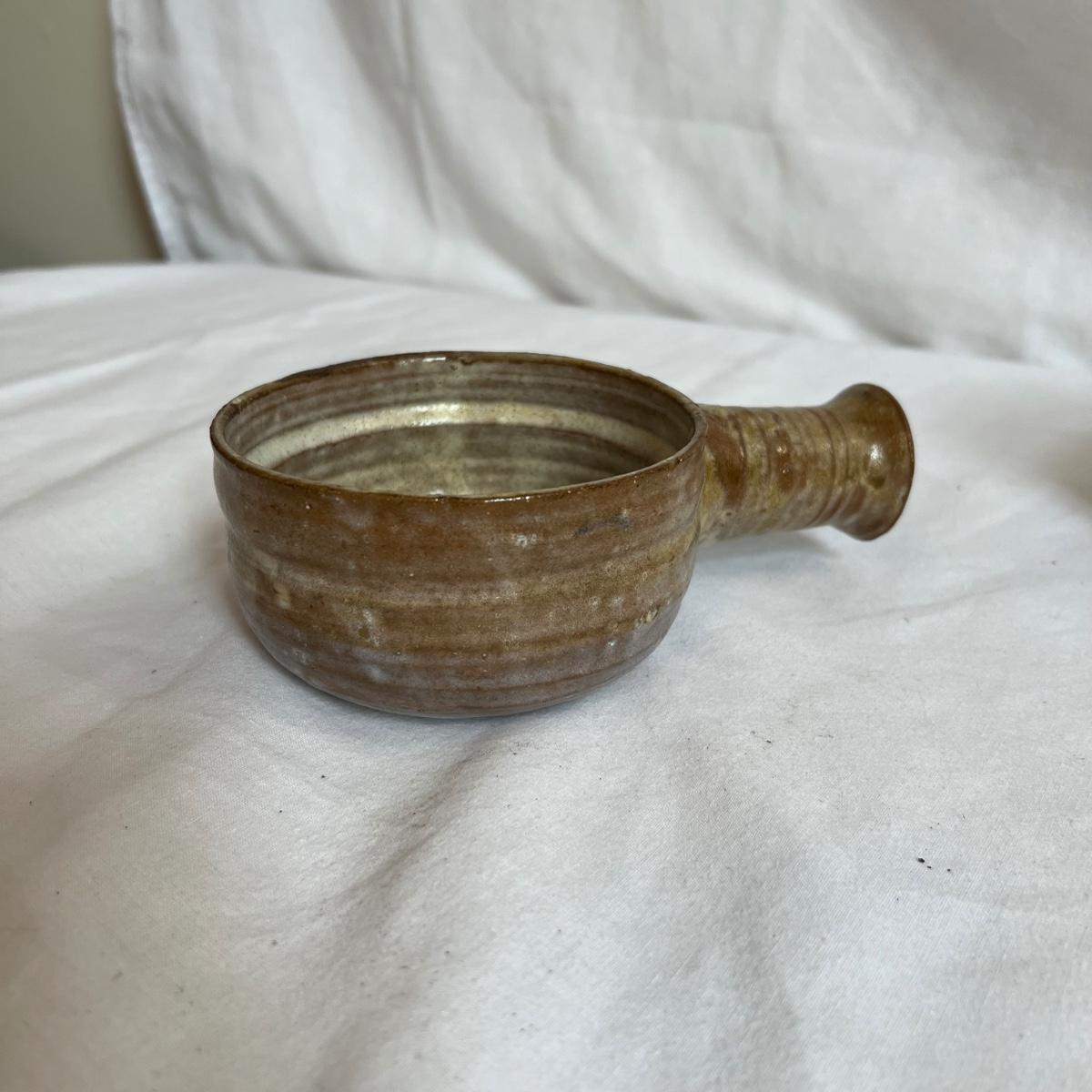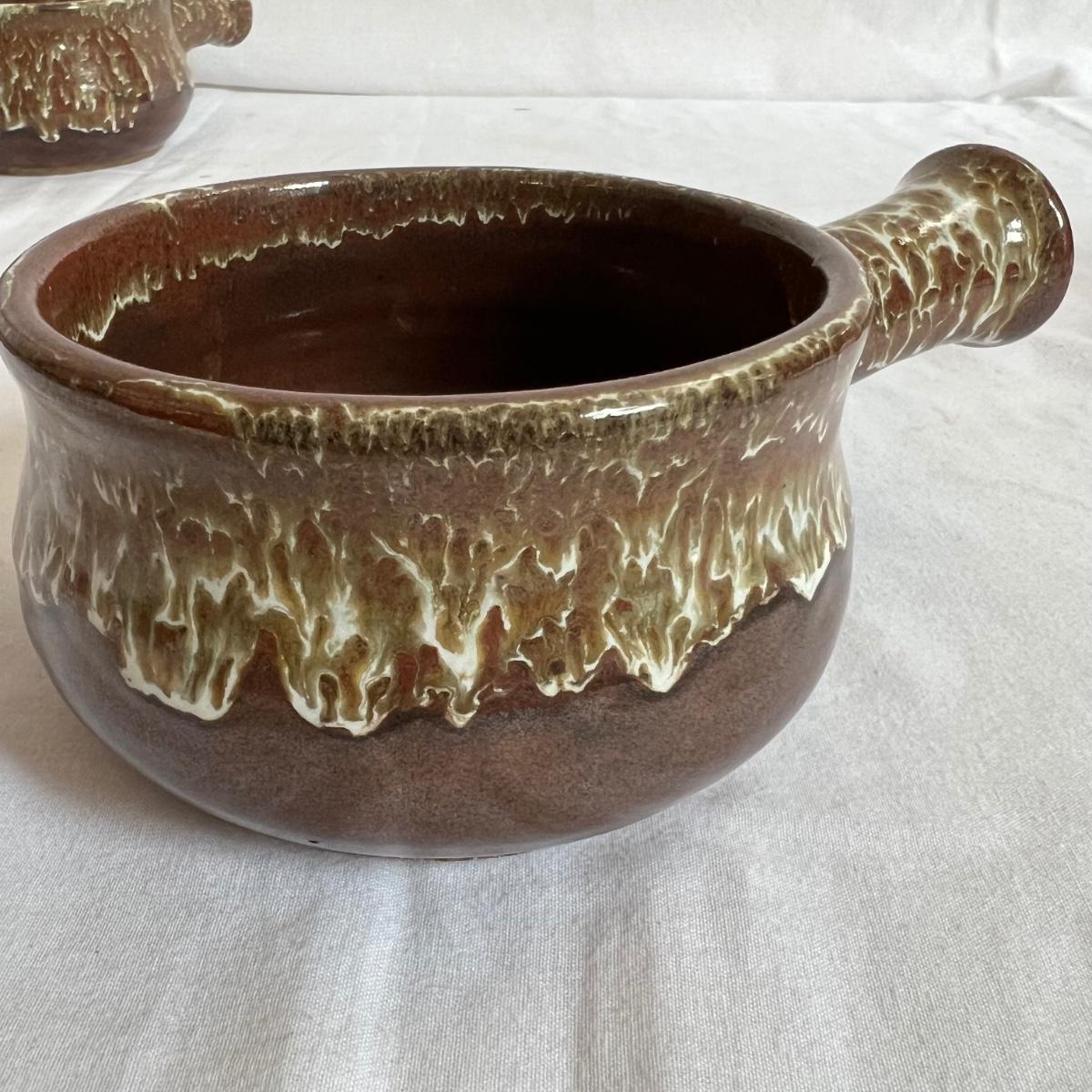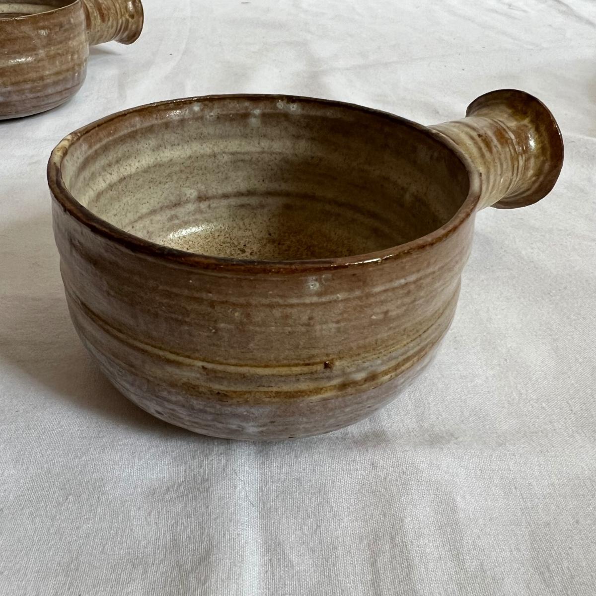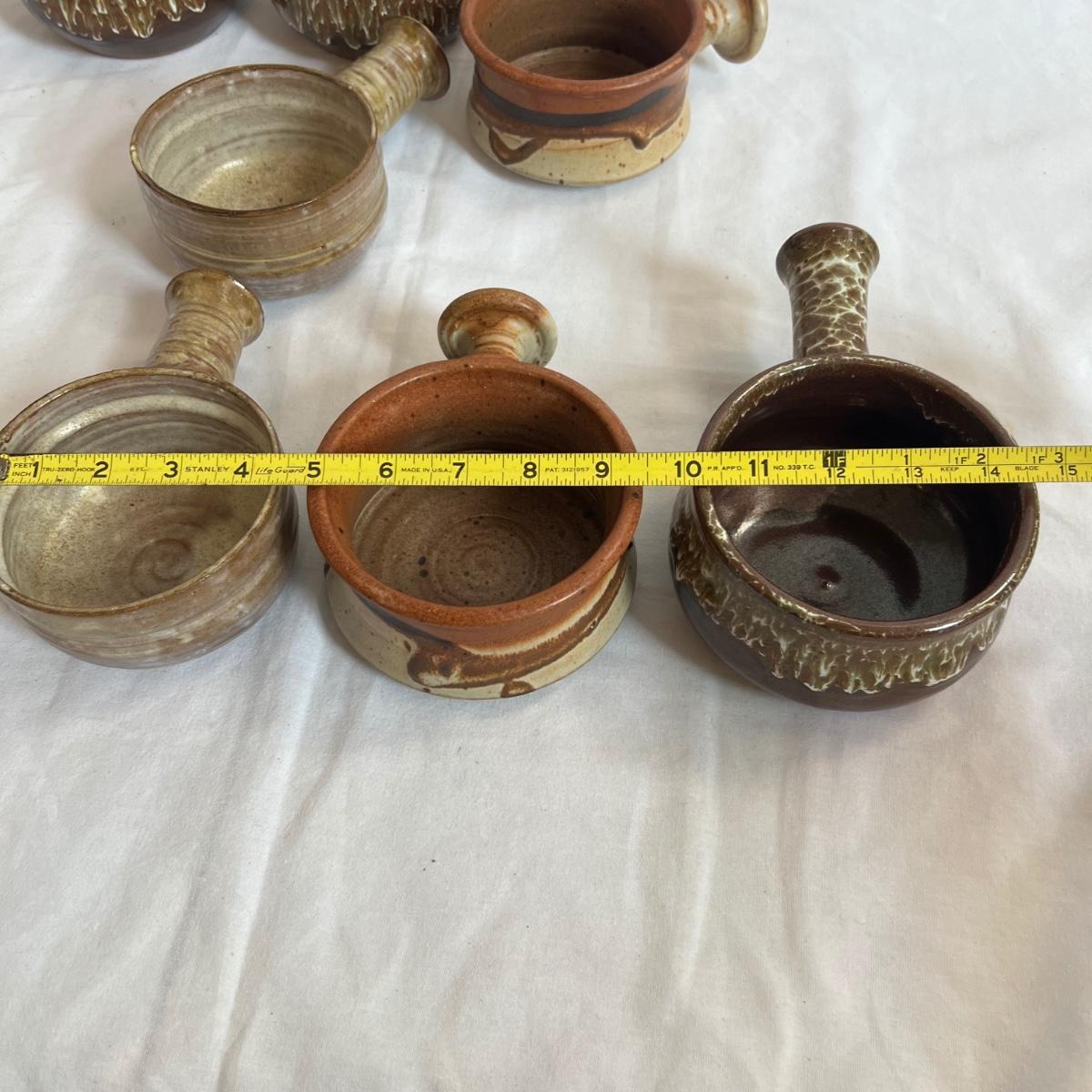 Seven pottery handled soup bowls includes pairs that are matching for two pairs and a set of three. See photos for measurements. There is one chip on one of the handles - see picture included. Shipping Available
