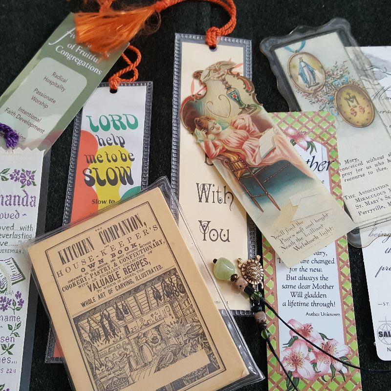 This auction lot is for a Gathering of Book Marks & Book Plates. The gathering contains a nifty plastic envelope with 30+ book plates - perfect for identifying your cookbooks. There are 8 miscellaneous - but very useable bookmarks and one string book mark with a stone on one end and a turtle on the other. NIce find. Bid now.