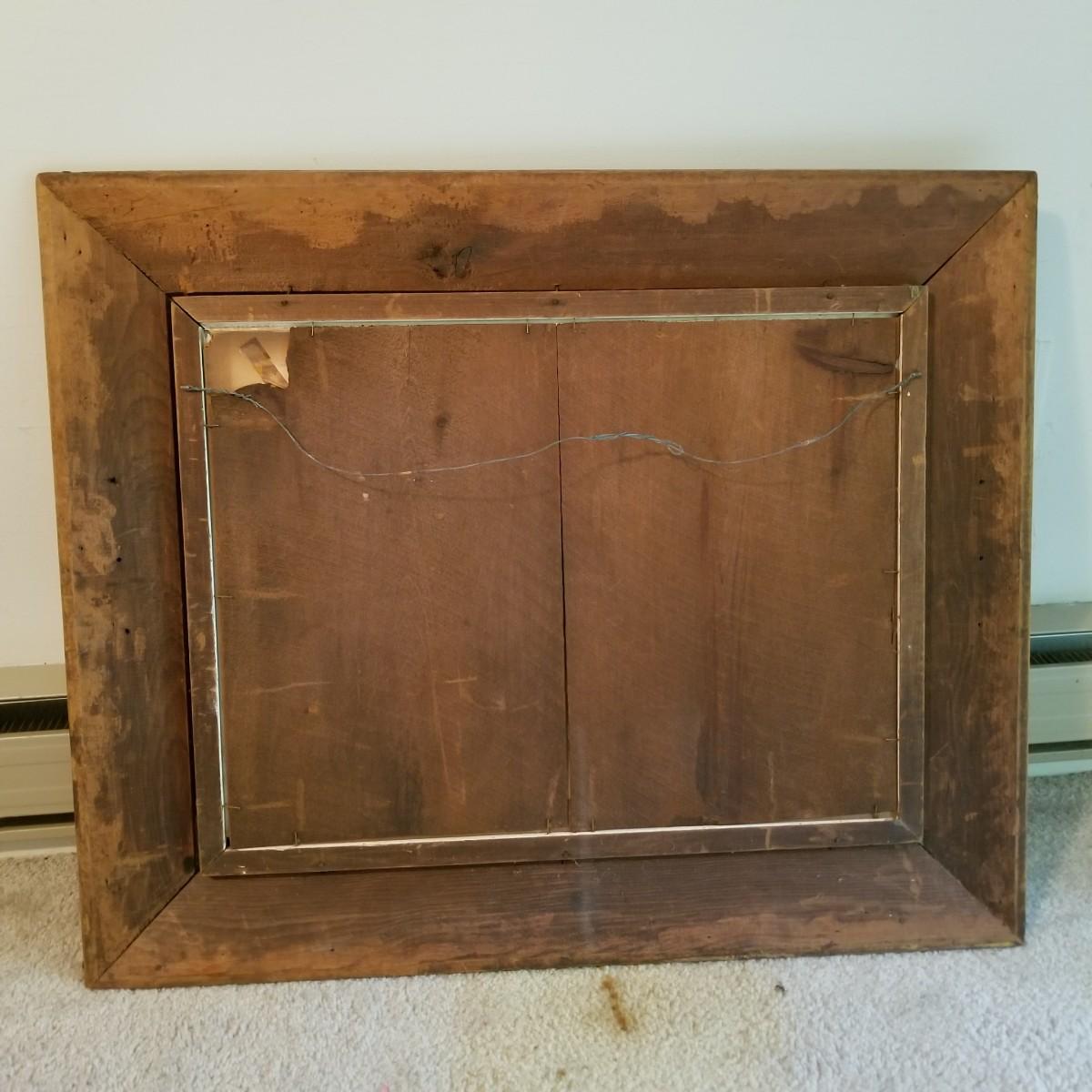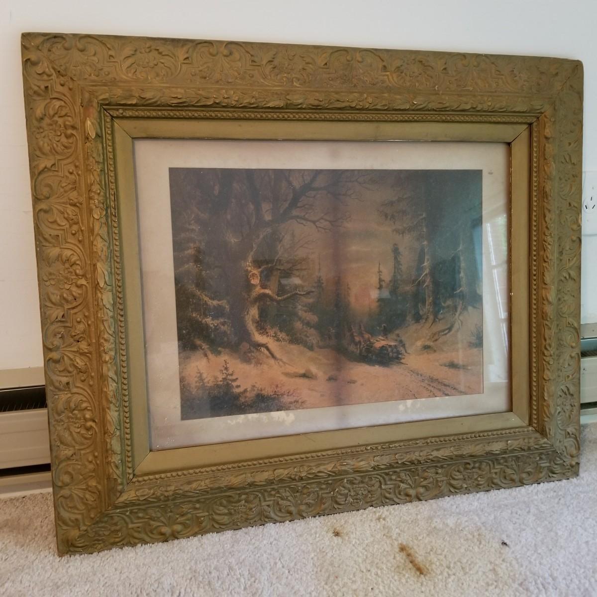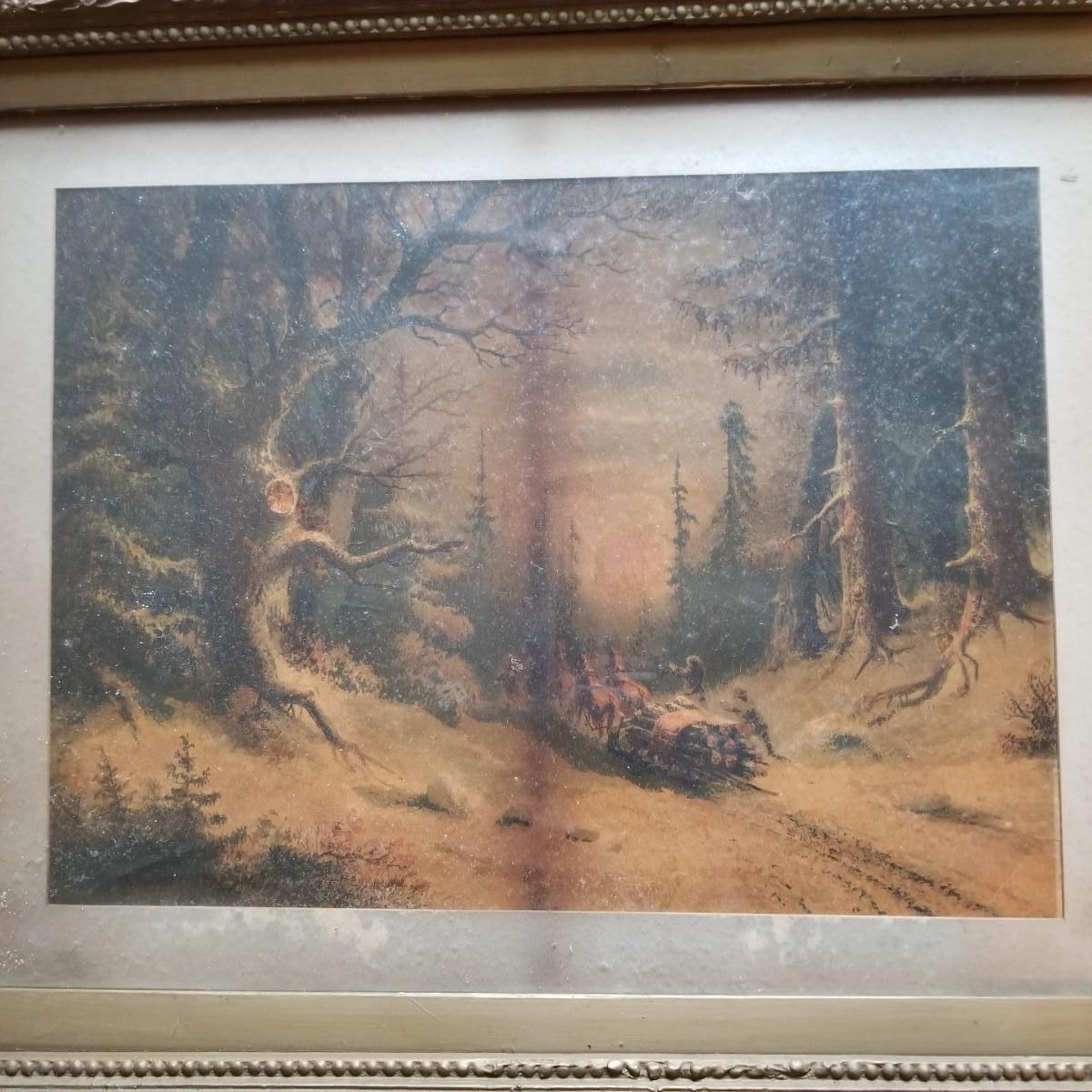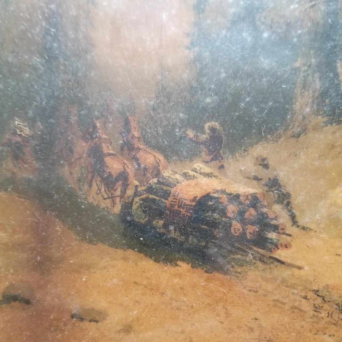 Carved wood framed art of men and horses pulling wood through the woods. No visible name or signature on piece. A dark stripe runs down the middle of the art, and the matting shows some discoloring. 34" x28" x2". See photos for detail. Shipping Art can be costly please call UPS store at 828-252-6930 for quote.