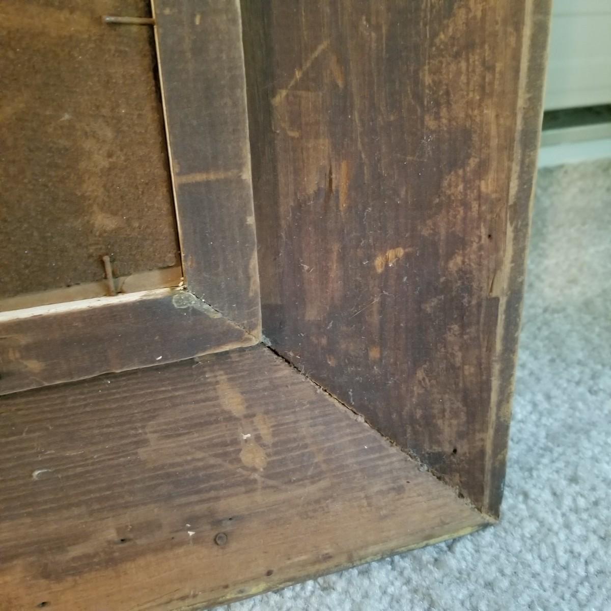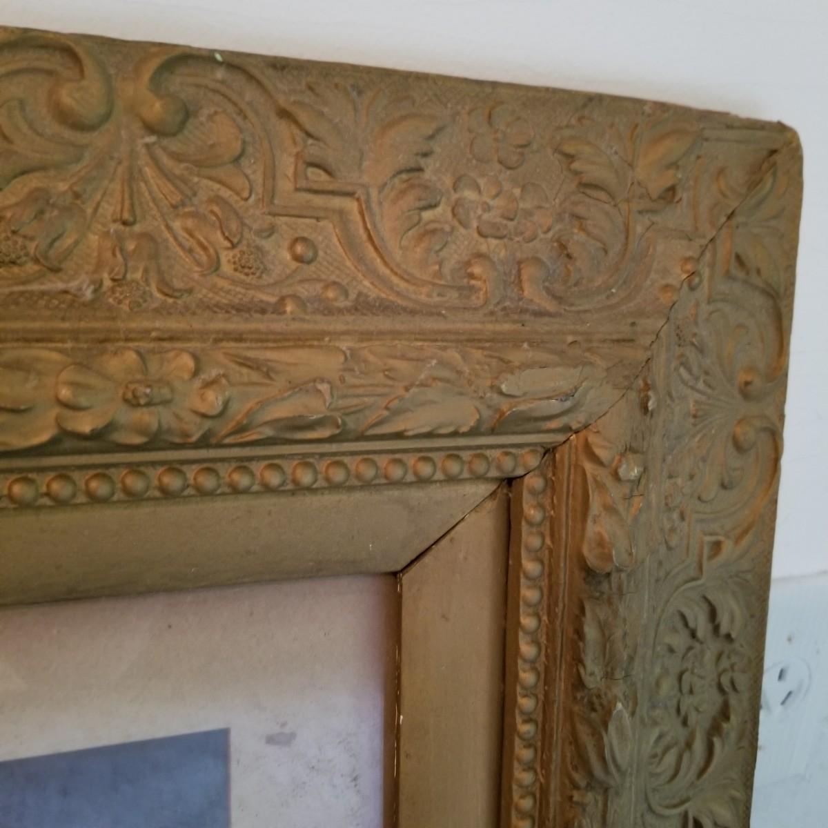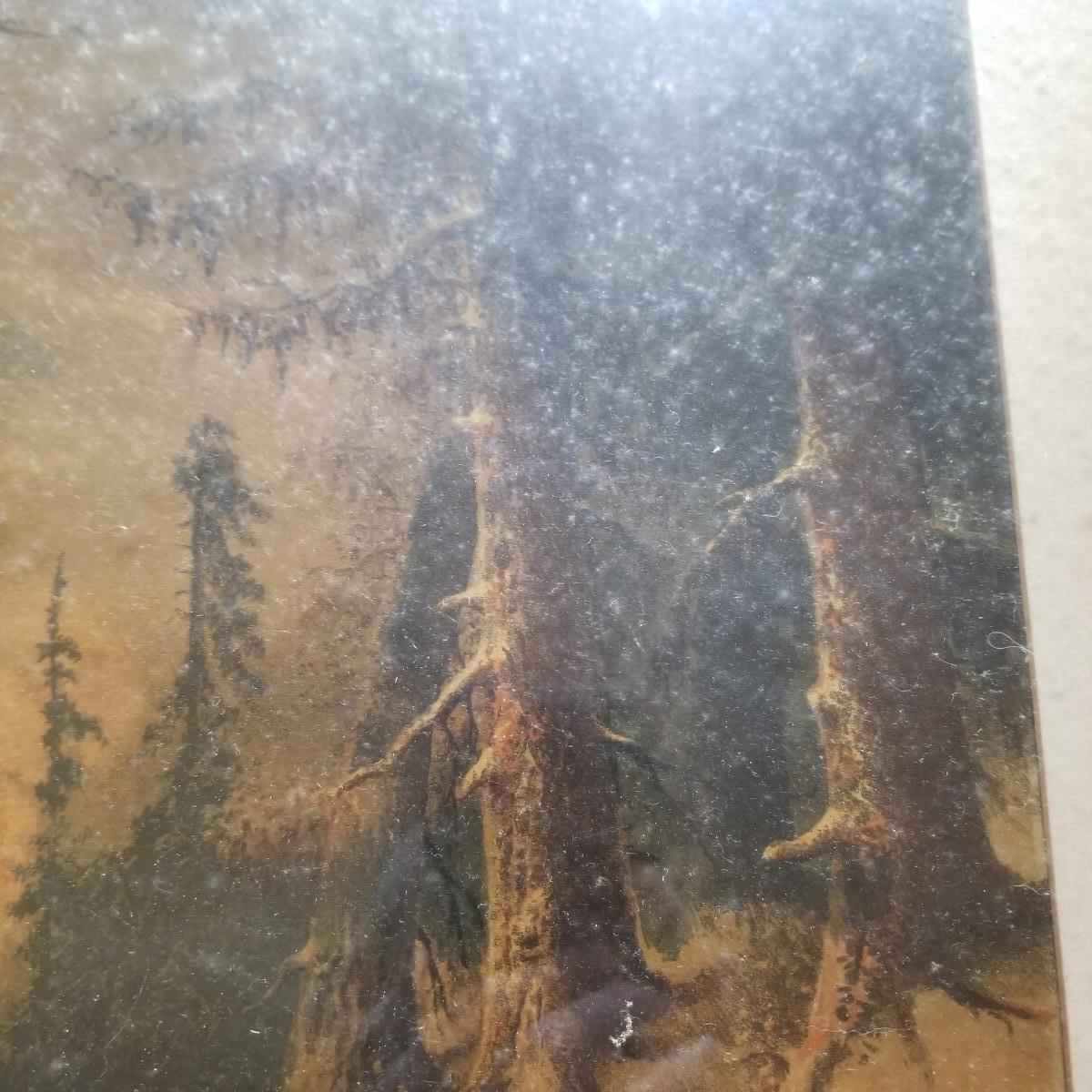 Carved wood framed art of men and horses pulling wood through the woods. No visible name or signature on piece. A dark stripe runs down the middle of the art, and the matting shows some discoloring. 34" x28" x2". See photos for detail. Shipping Art can be costly please call UPS store at 828-252-6930 for quote.