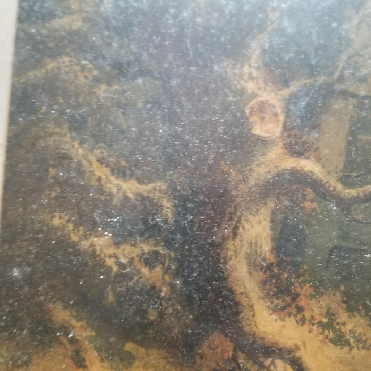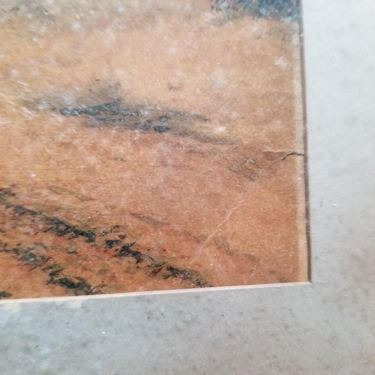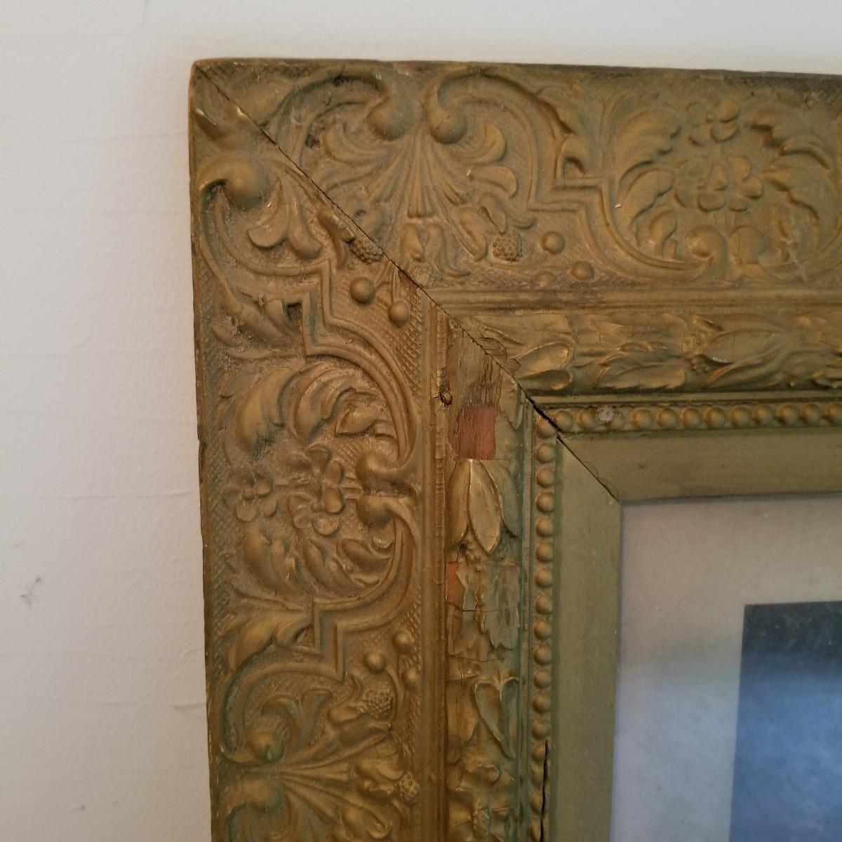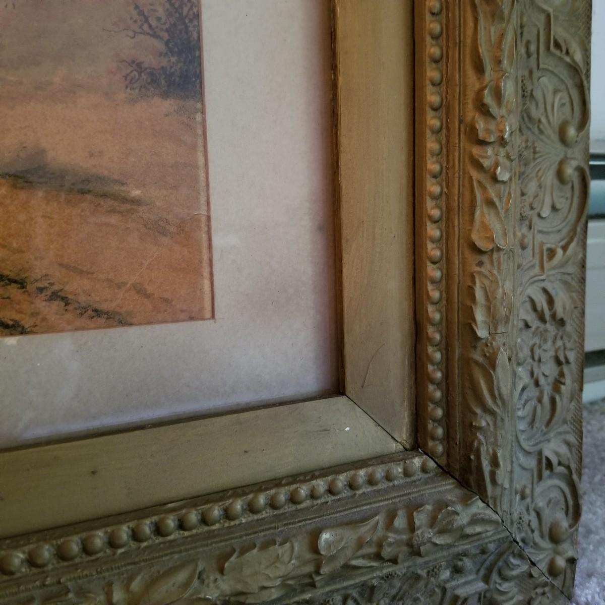 Carved wood framed art of men and horses pulling wood through the woods. No visible name or signature on piece. A dark stripe runs down the middle of the art, and the matting shows some discoloring. 34" x28" x2". See photos for detail. Shipping Art can be costly please call UPS store at 828-252-6930 for quote.