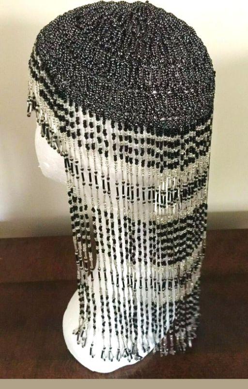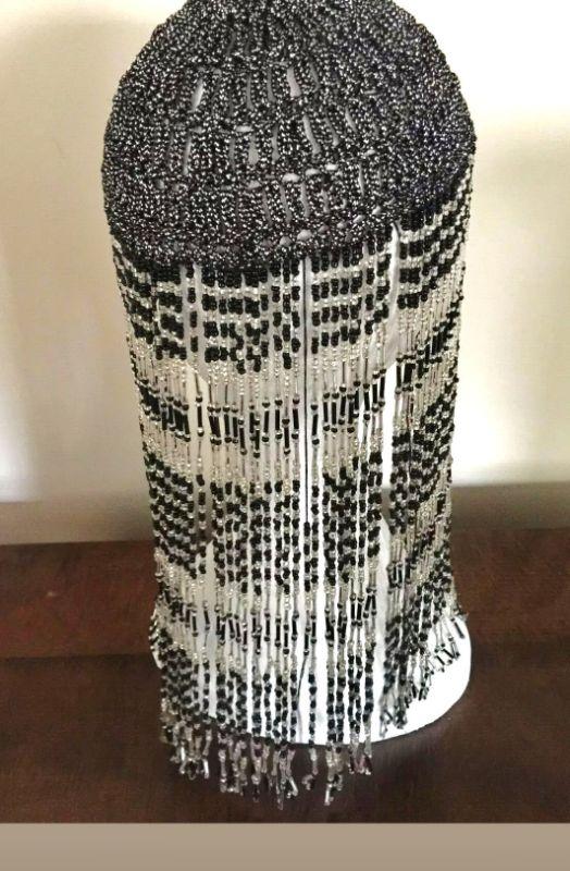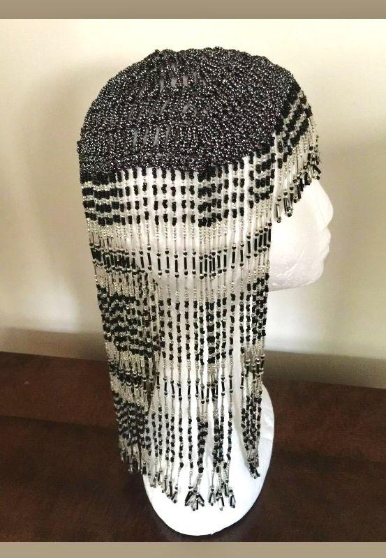real work of Wearable Art this one is .Beads are mainly Seed Beads, and are glass not plastic. Top Piece is Crocheted.in black and silver . very minute wear fro the Period .