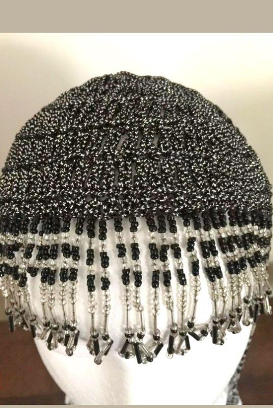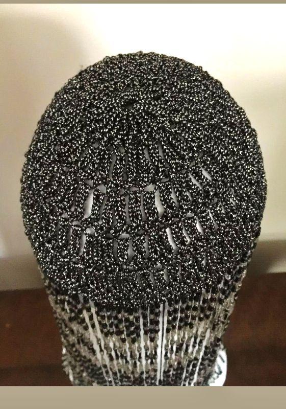 real work of Wearable Art this one is .Beads are mainly Seed Beads, and are glass not plastic. Top Piece is Crocheted.in black and silver . very minute wear fro the Period .