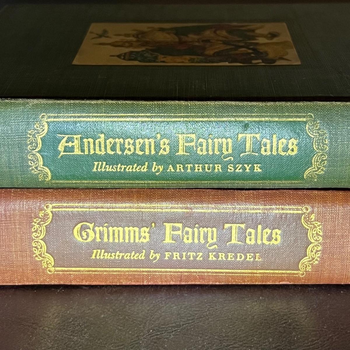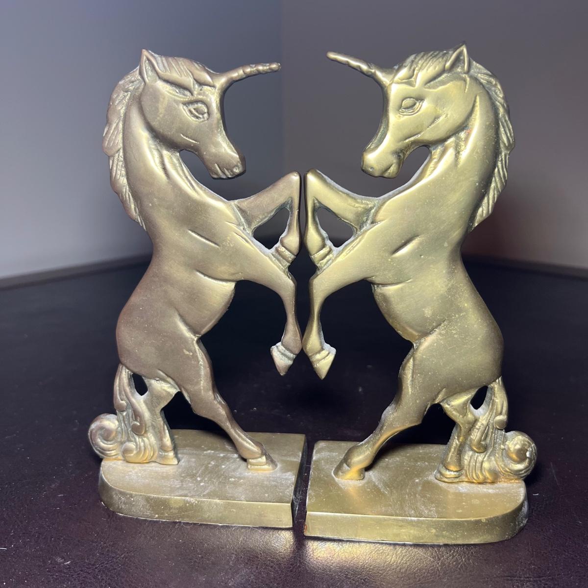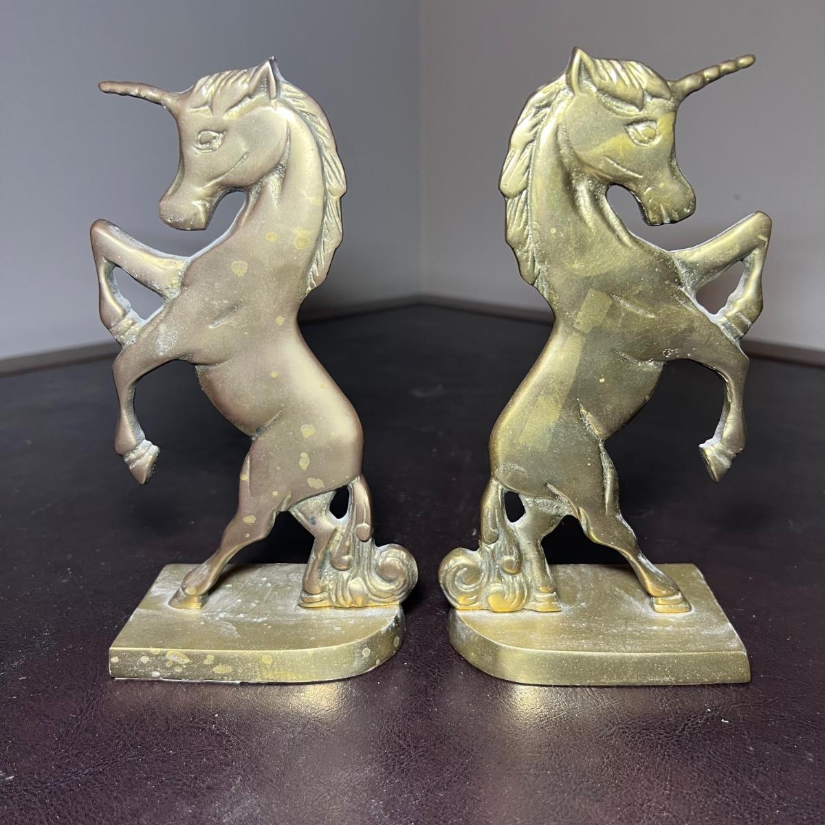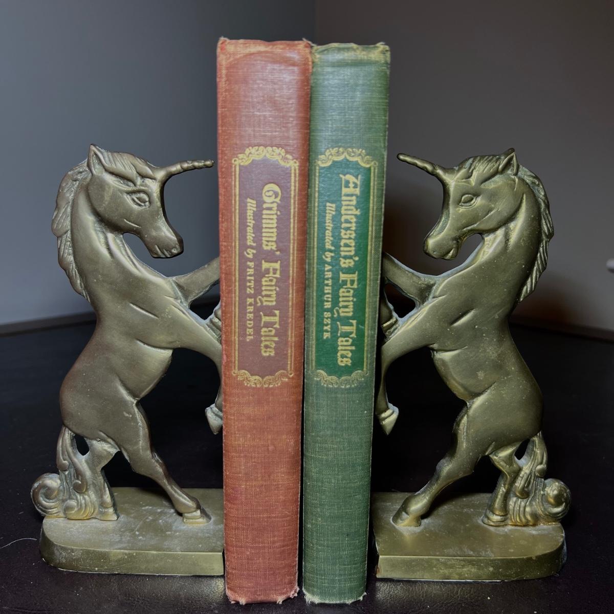 This pair of Gatco brass bookends are unicorns and they measure 4” x 2.5” x 7.5”H. Three books are included, see images for titles, etc and note the two fairy tales books have been written on, on their covers.