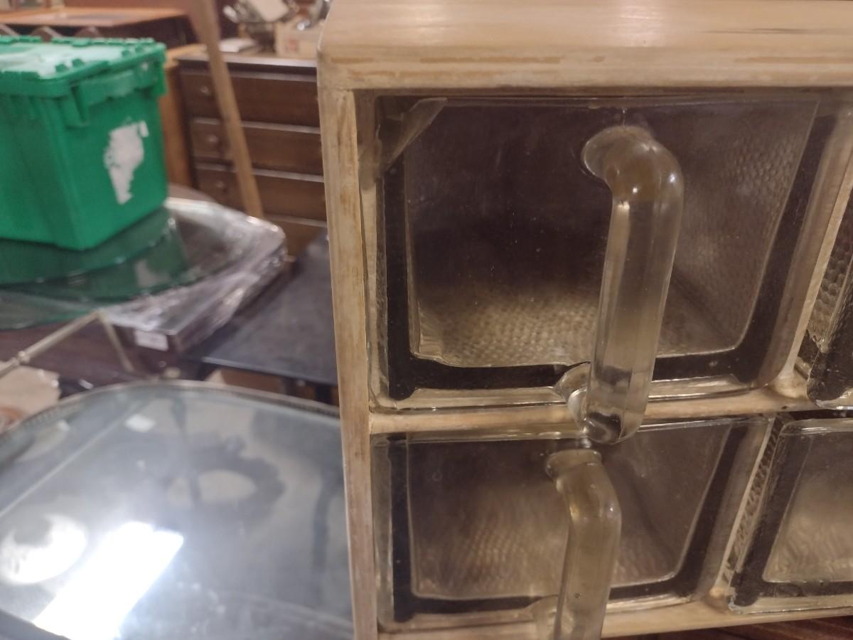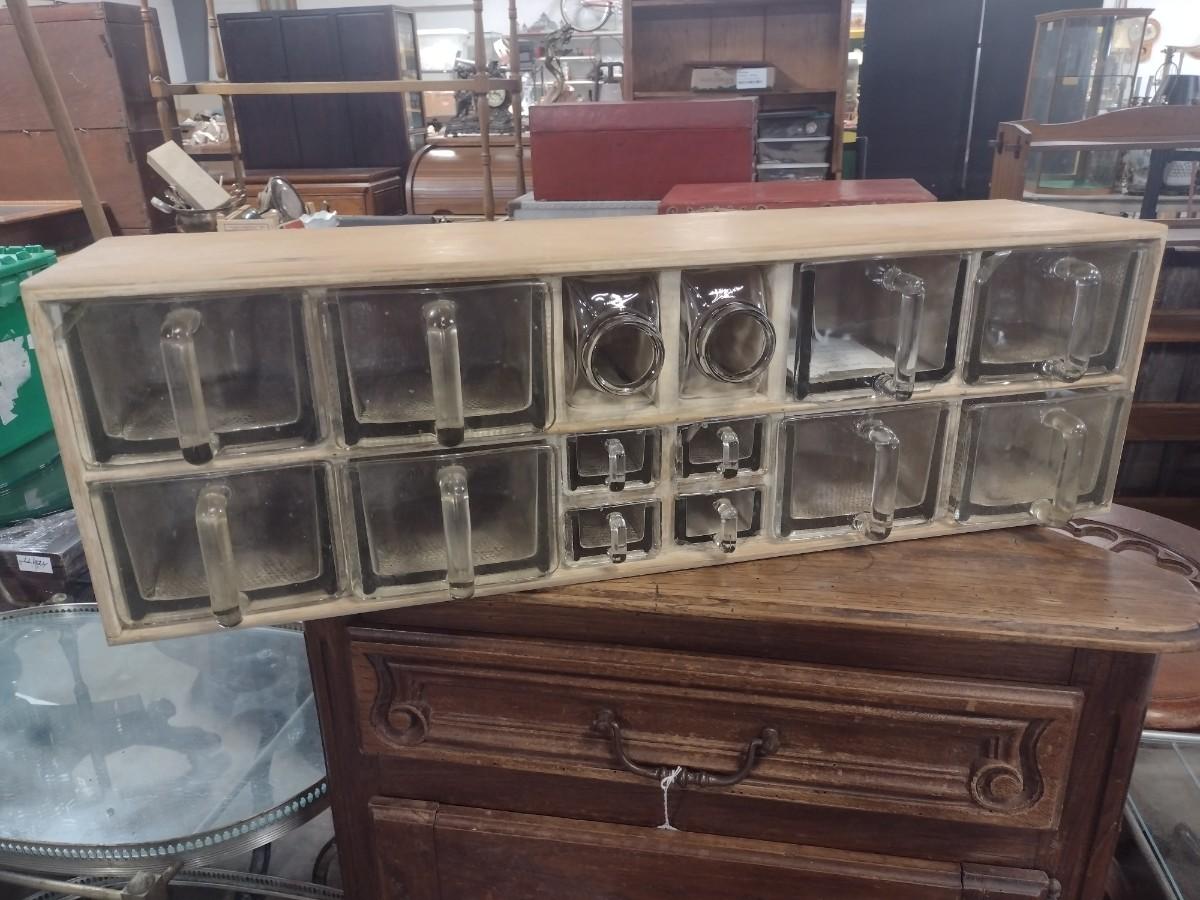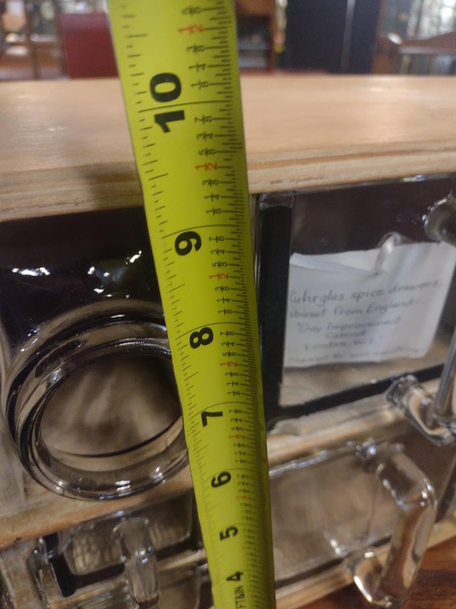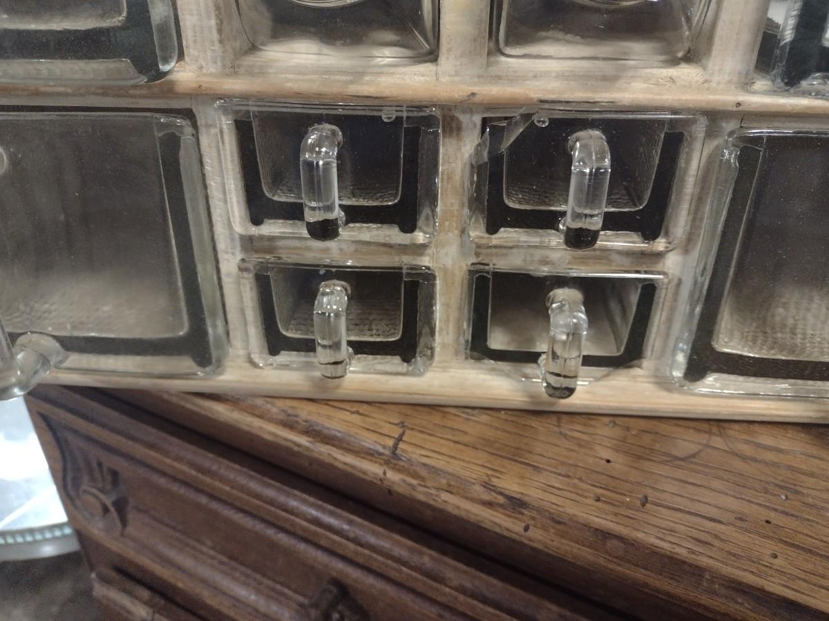 Gay Improvement Cabinet with Ruhrglas Spice Drawers. See pictures for chipped glass corners on drawers. This lot does not include the hutch under this cabinet.
