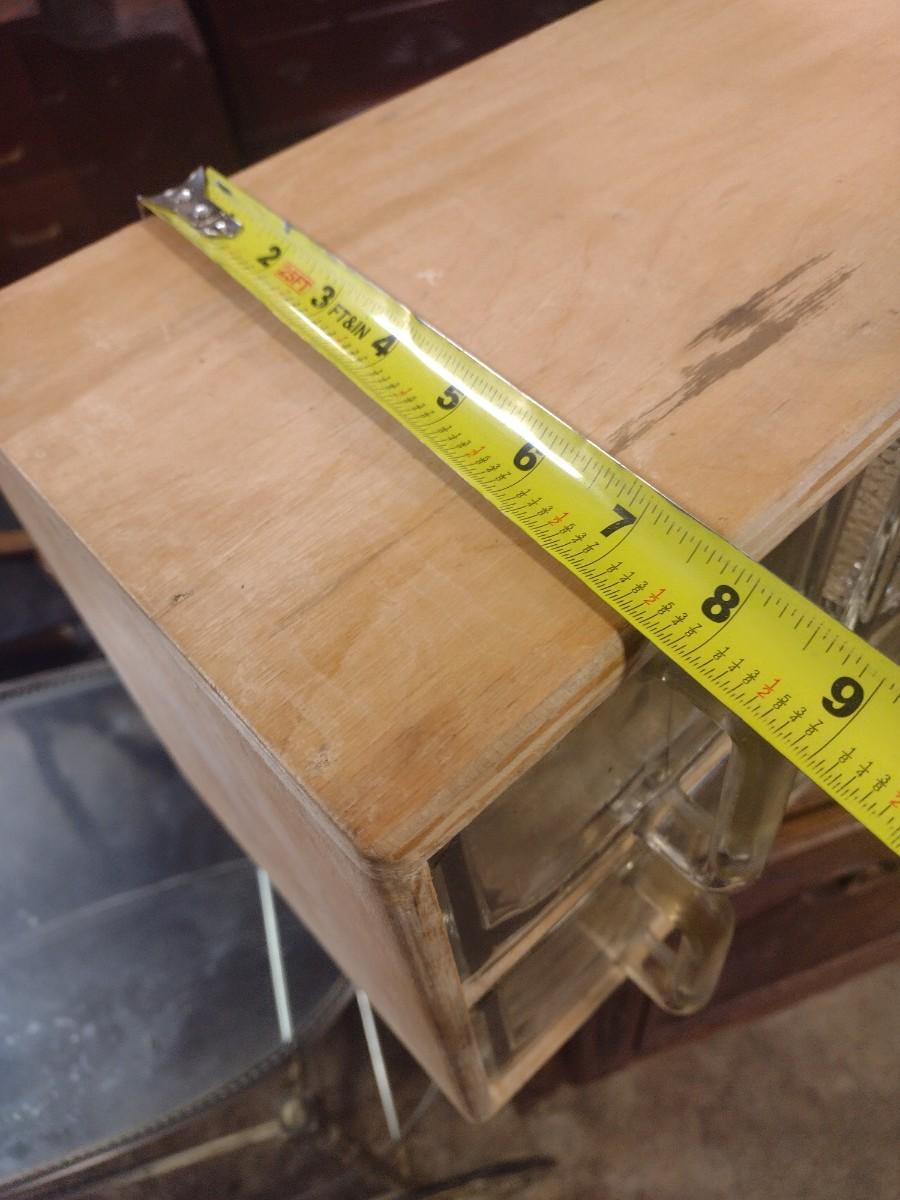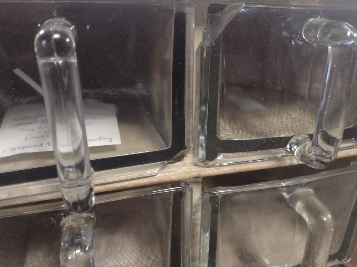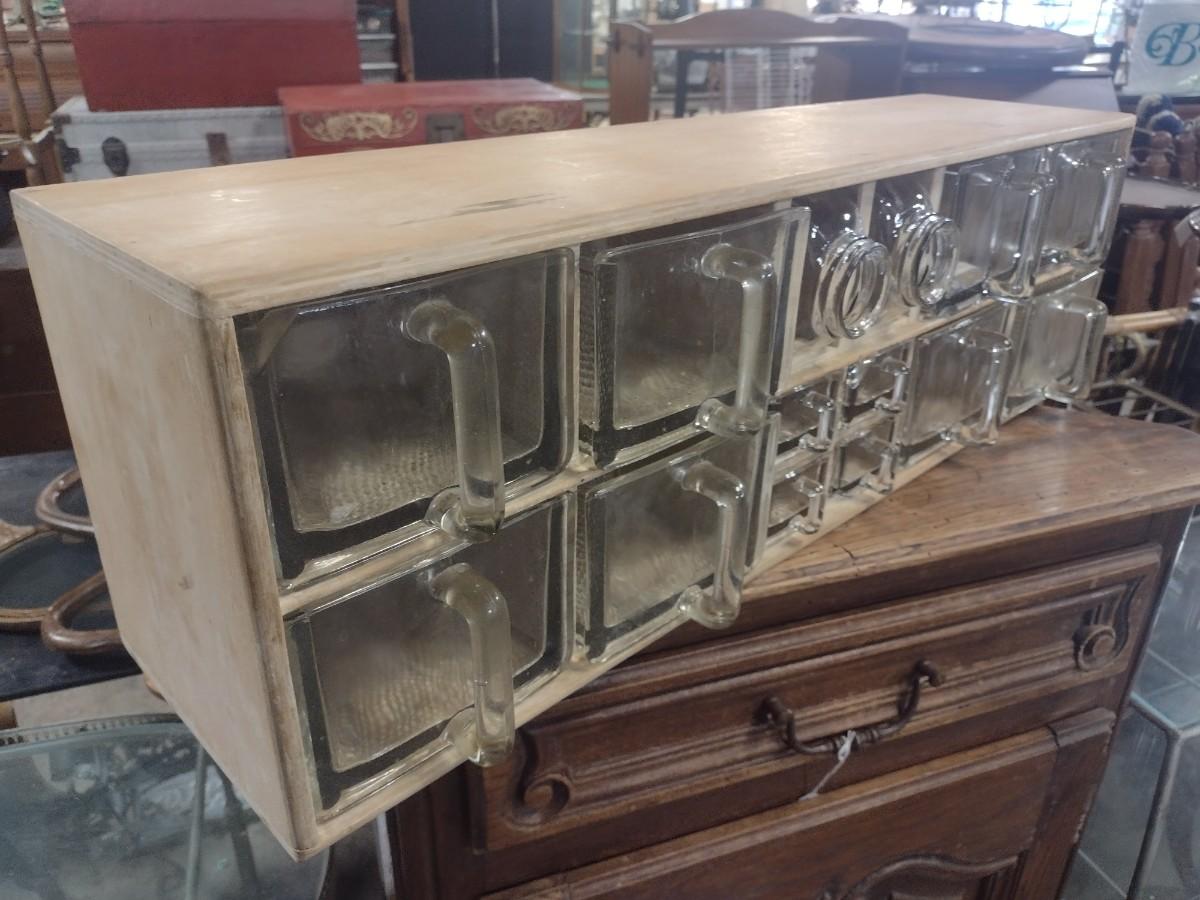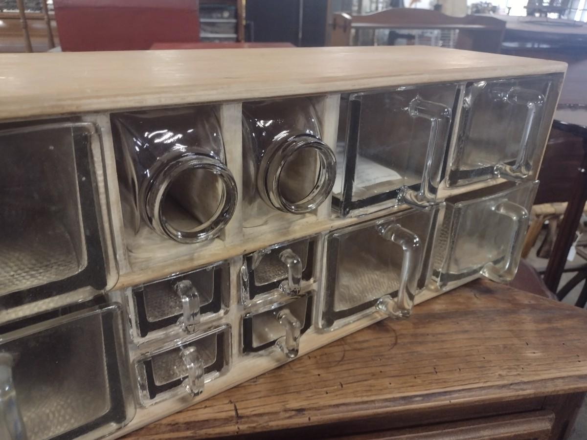 Gay Improvement Cabinet with Ruhrglas Spice Drawers. See pictures for chipped glass corners on drawers. This lot does not include the hutch under this cabinet.