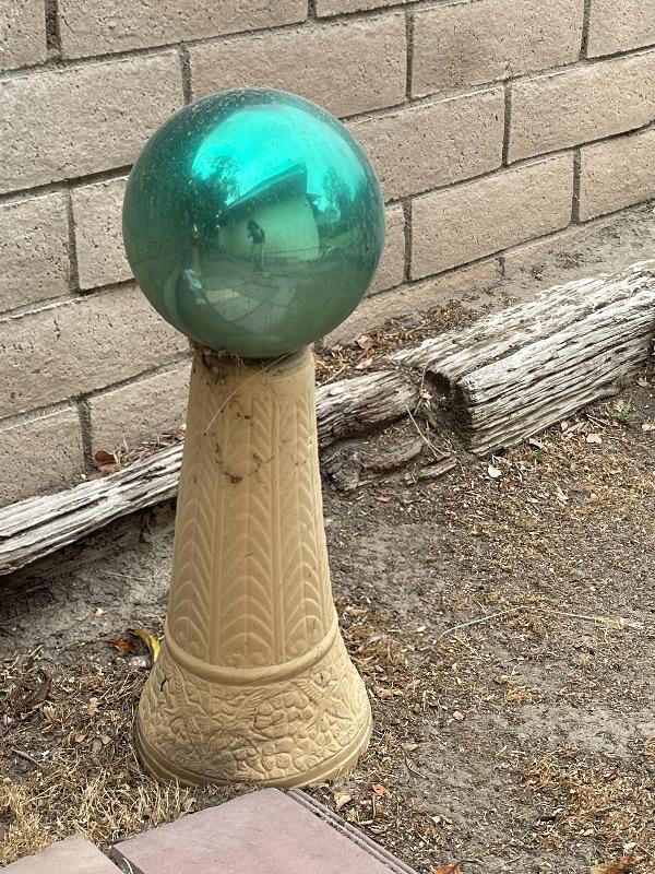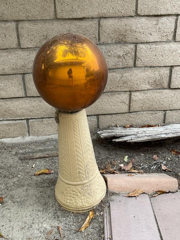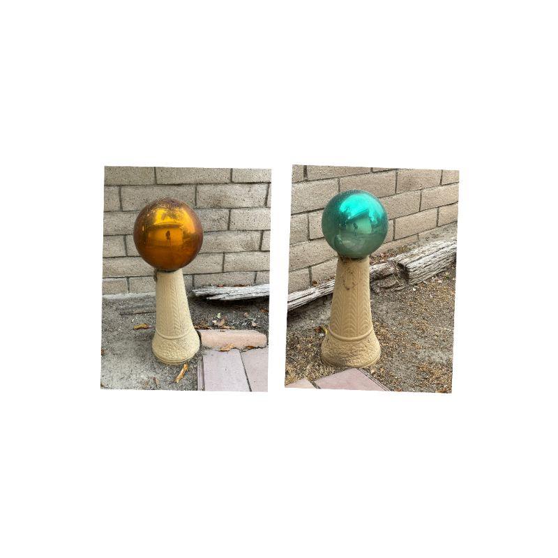 Gazing ball and pillar stand set of 2, turquoise and amber glass