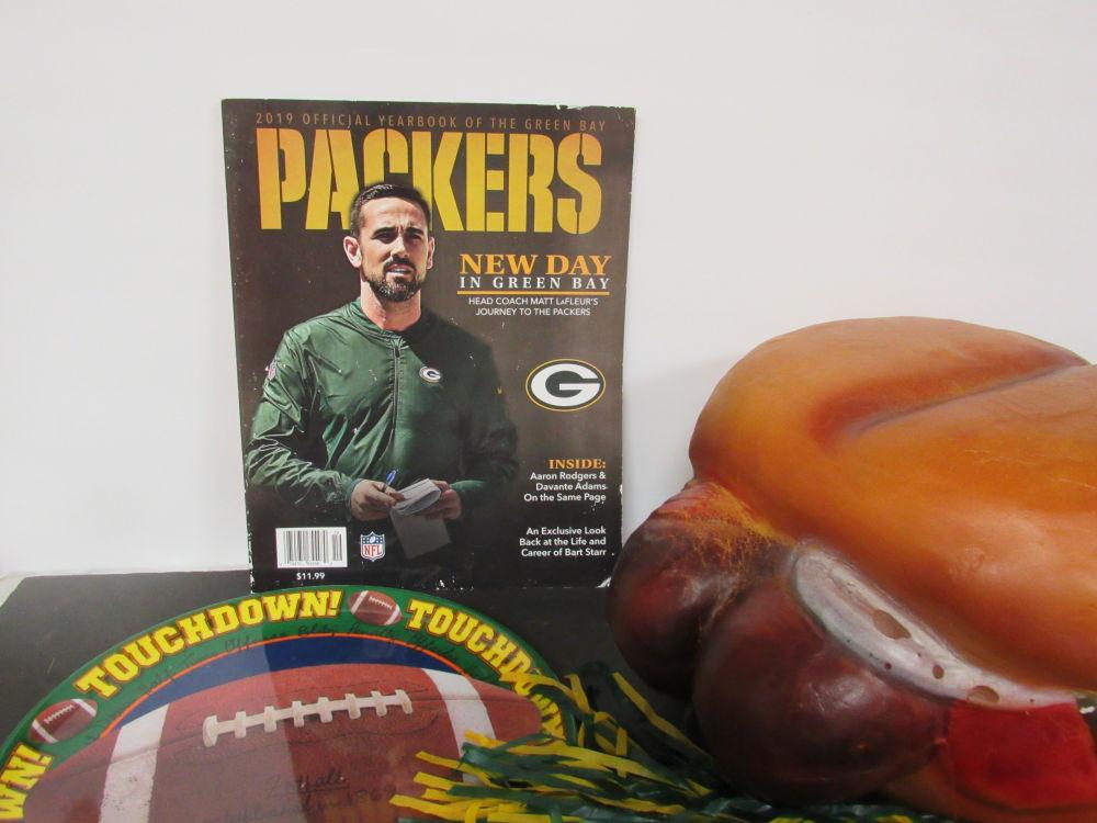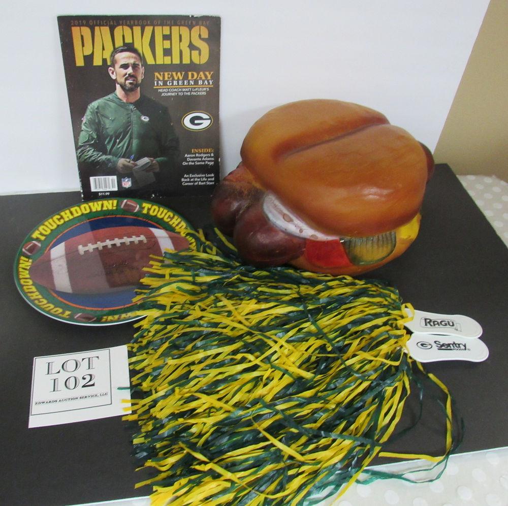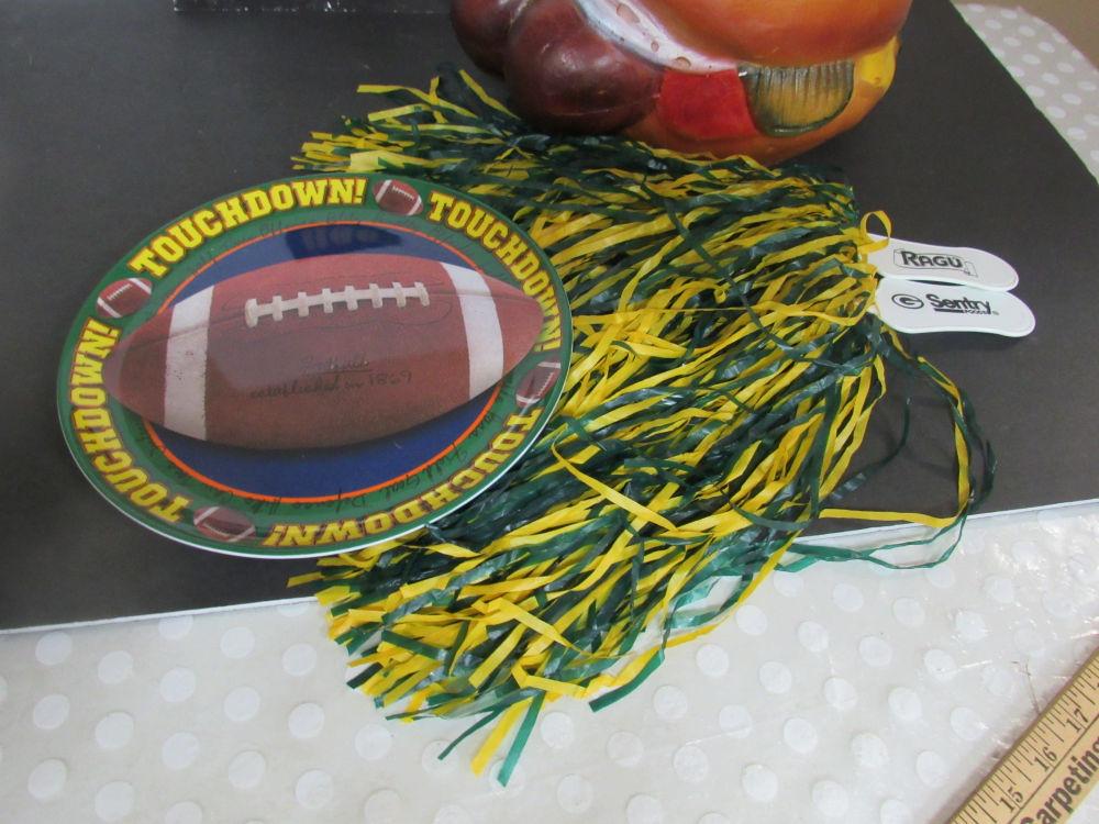 GB Packers Brat Bun Foam Hat, Packers Magazine, Plastic Advertising Pompoms, Football Plate