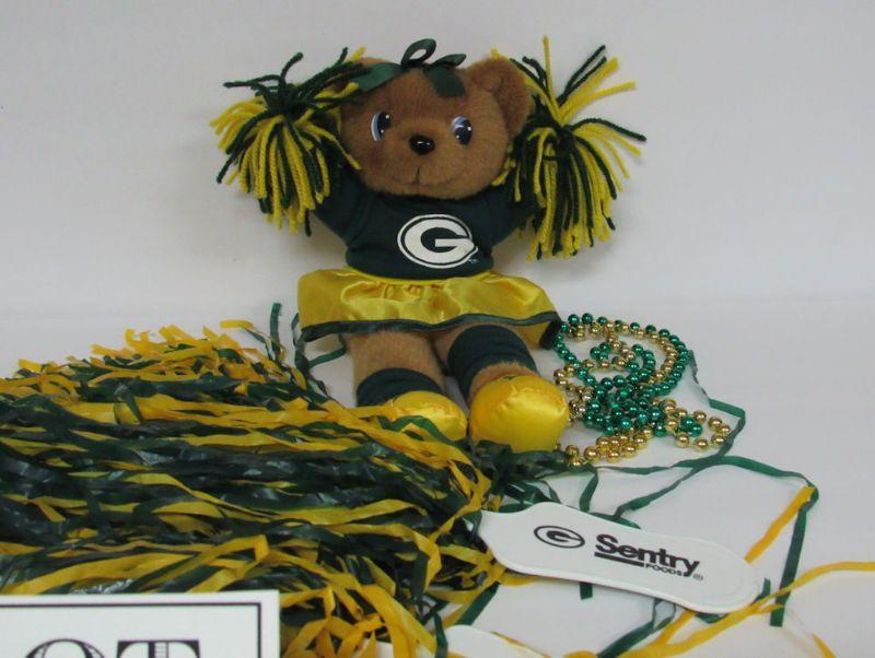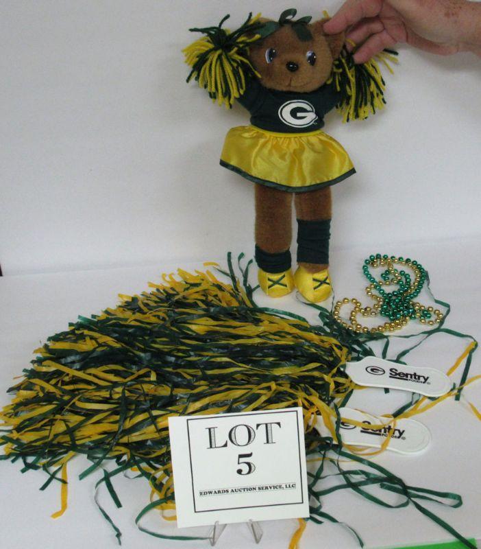 GB Packers Plush Girl Cheerleader Doll 1990s, 2 Advertising PomPoms, 2 Plastic Bead Necklaces