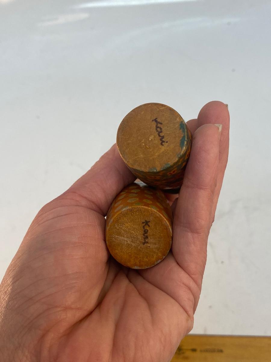Pair of Vintage Painted Wood Peg Style Doll Figurines. In vintage condition. Look to be handmade with ink and paint. Signed on the bottom.