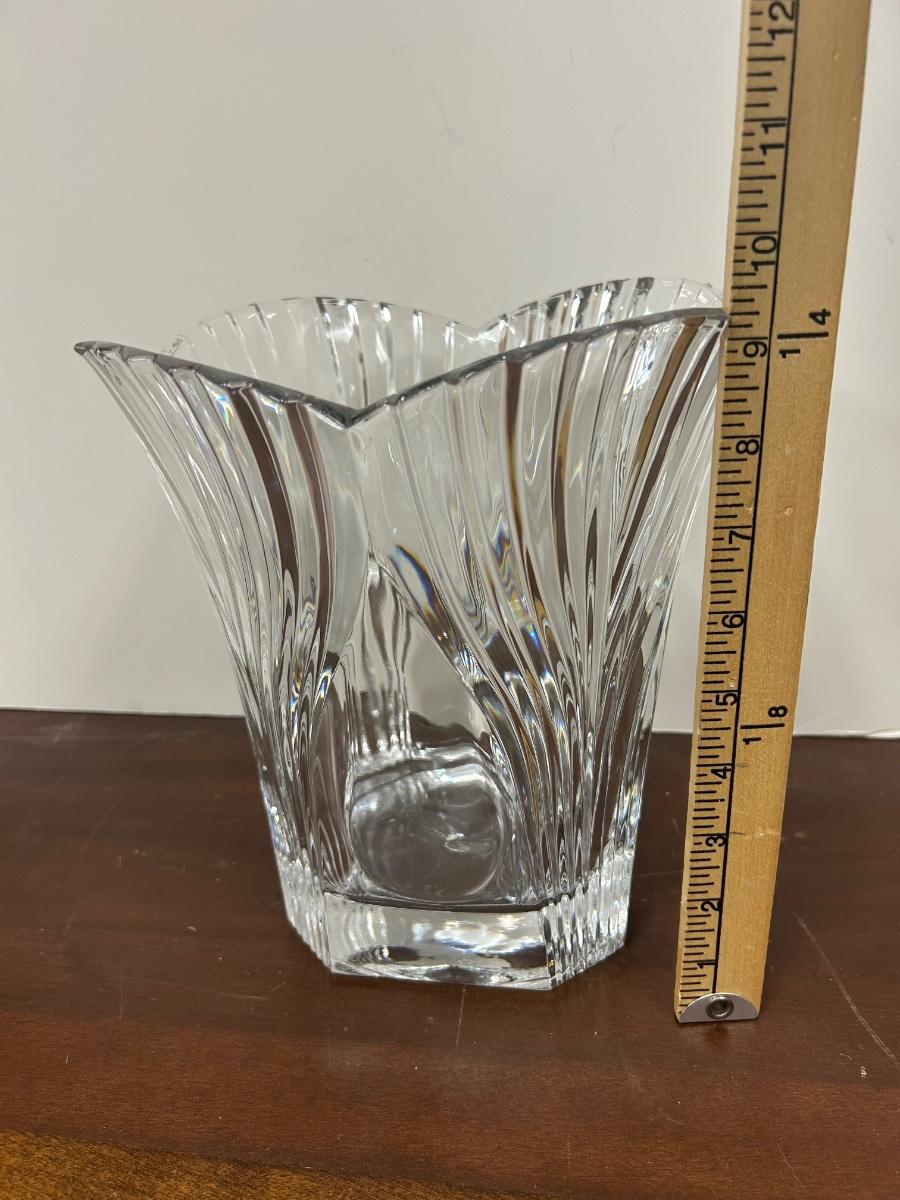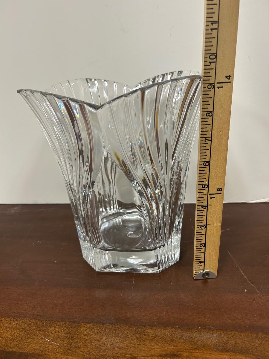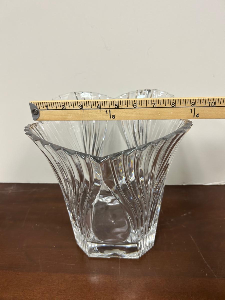 Heavy Crystal Ribbed Fluted Scalloped Top Wide Flower Vase. In good condition. 9" tall and about the same at the top of opening.