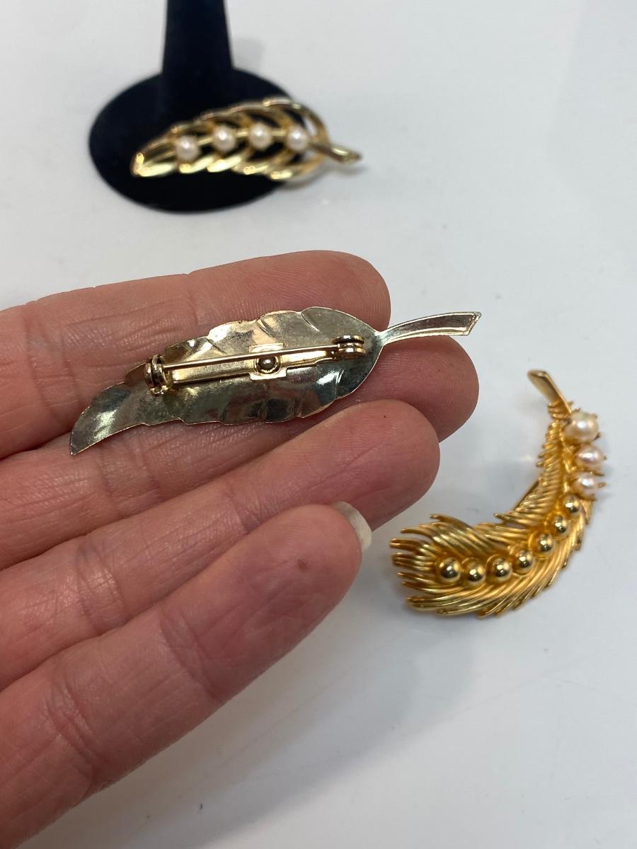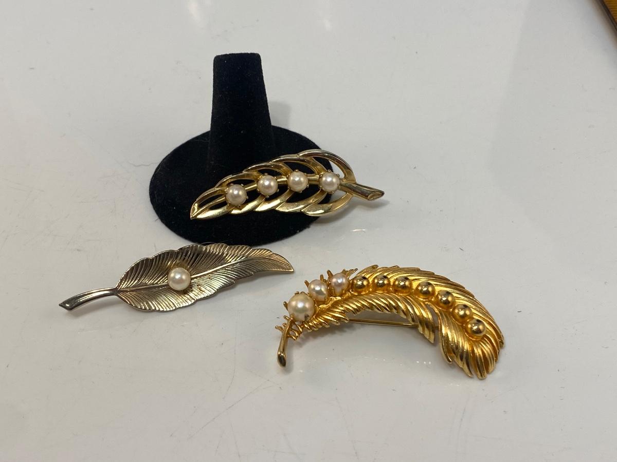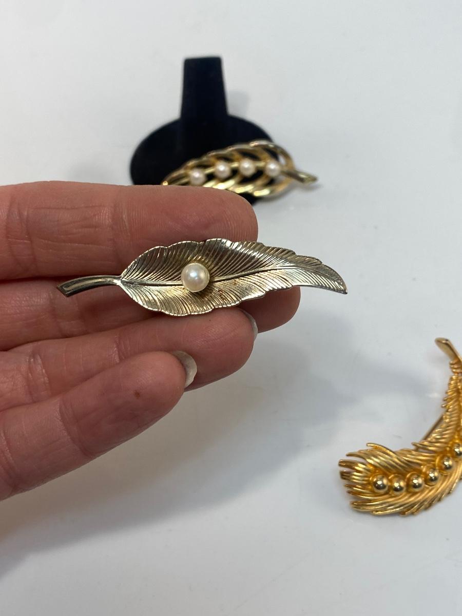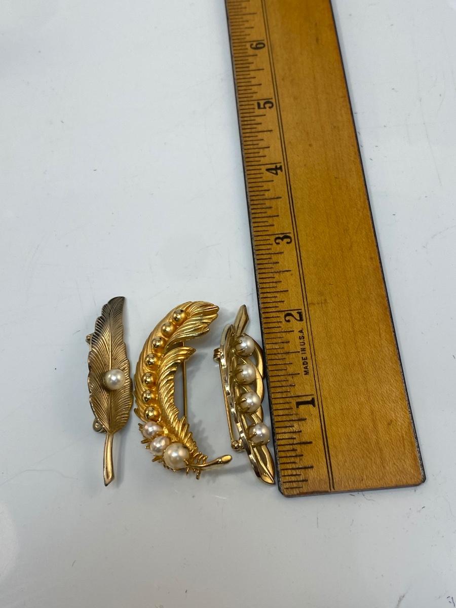 Set of 3 Vintage Retro Leaf Feather Gold Tone & Faux Pearl Fashion Costume Jewelry Pin Brooch Set Unbranded. In good vintage condition. Under 2" size.