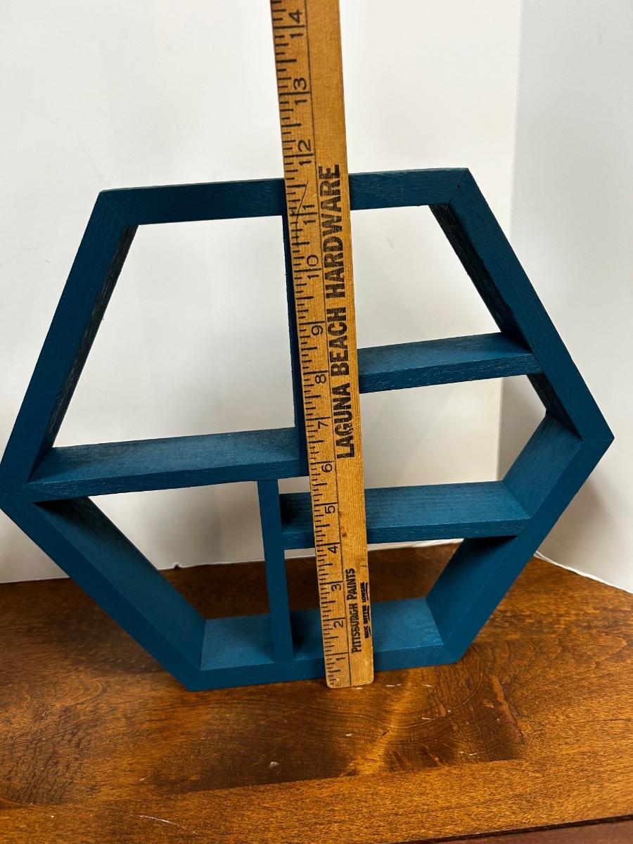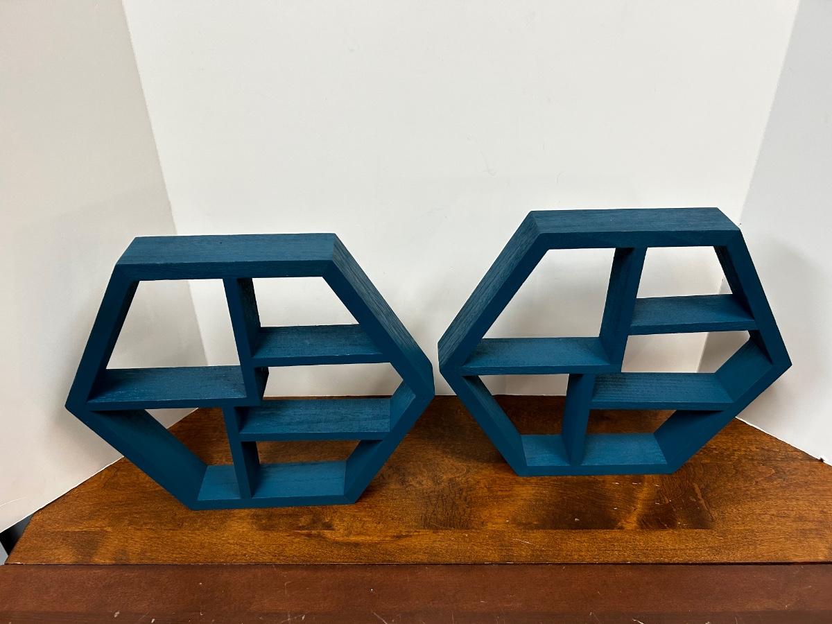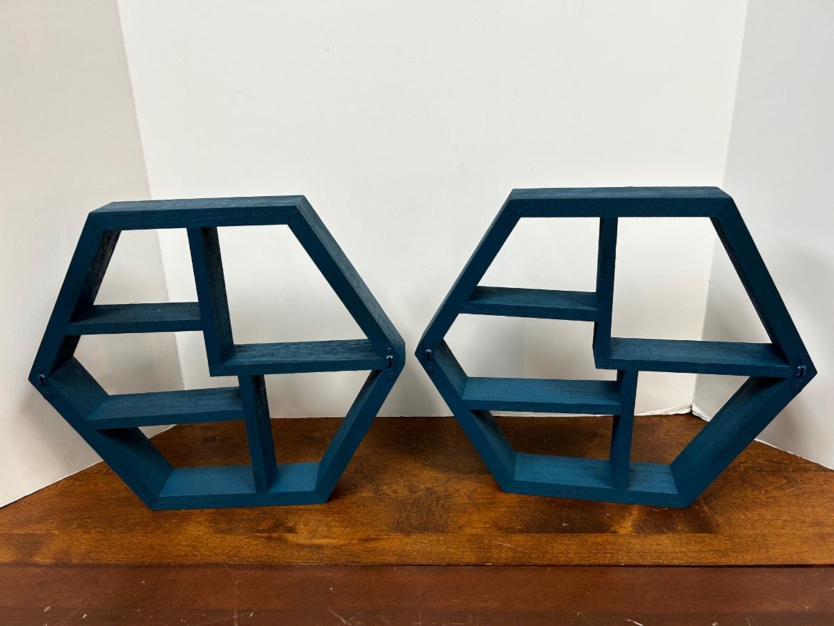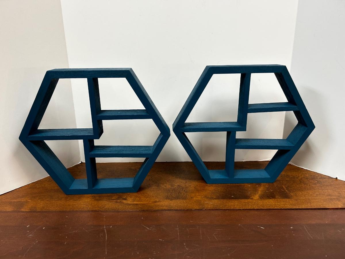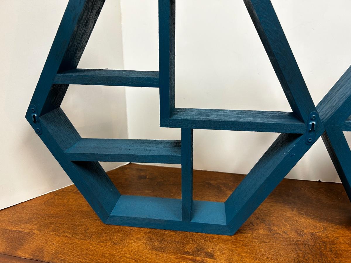 Pair of Turquoise Blue Painted Wood Geometric Hanging Wall Display Shelves. Have brackets on back for hanging. About 12" size.