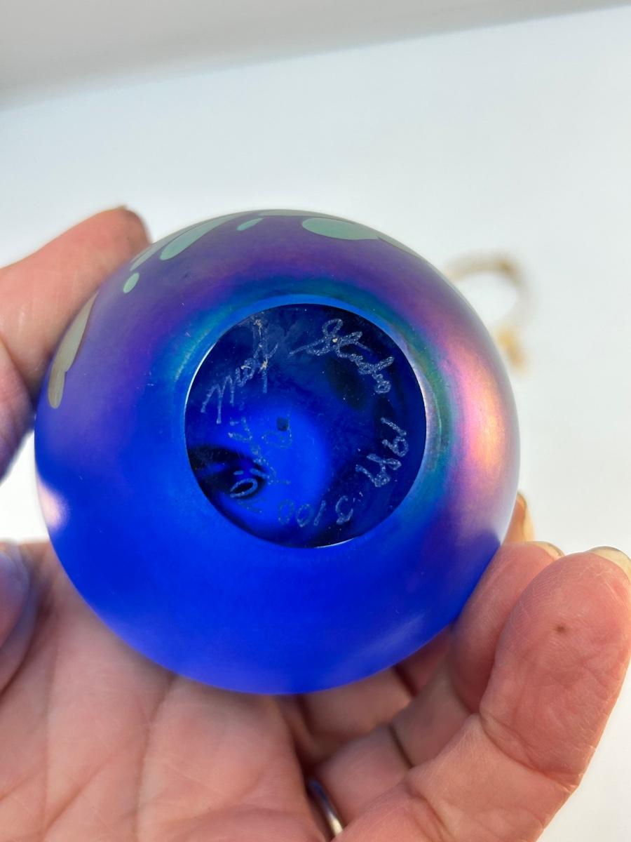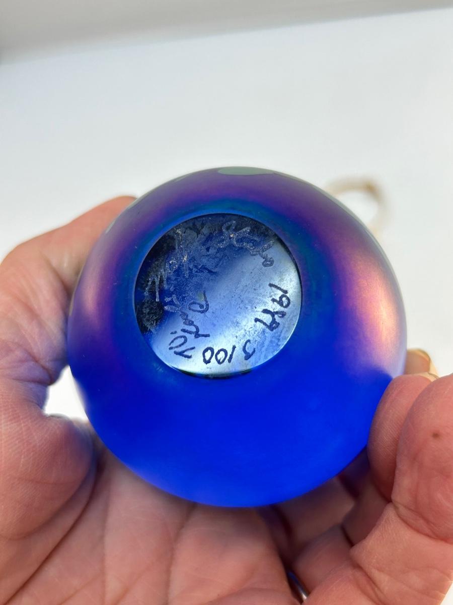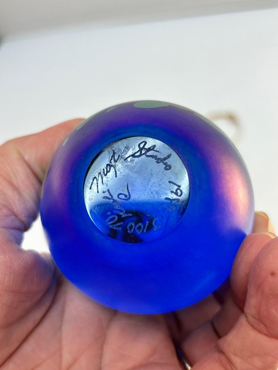 Brilliant Blue with Iridescent Swirl Art Glass Egg Paperweight Signed and Dated