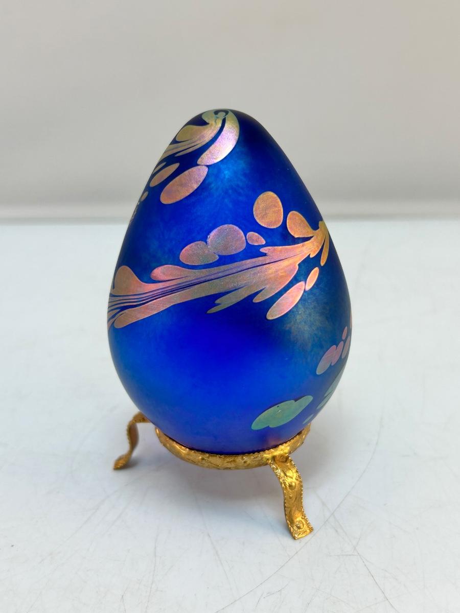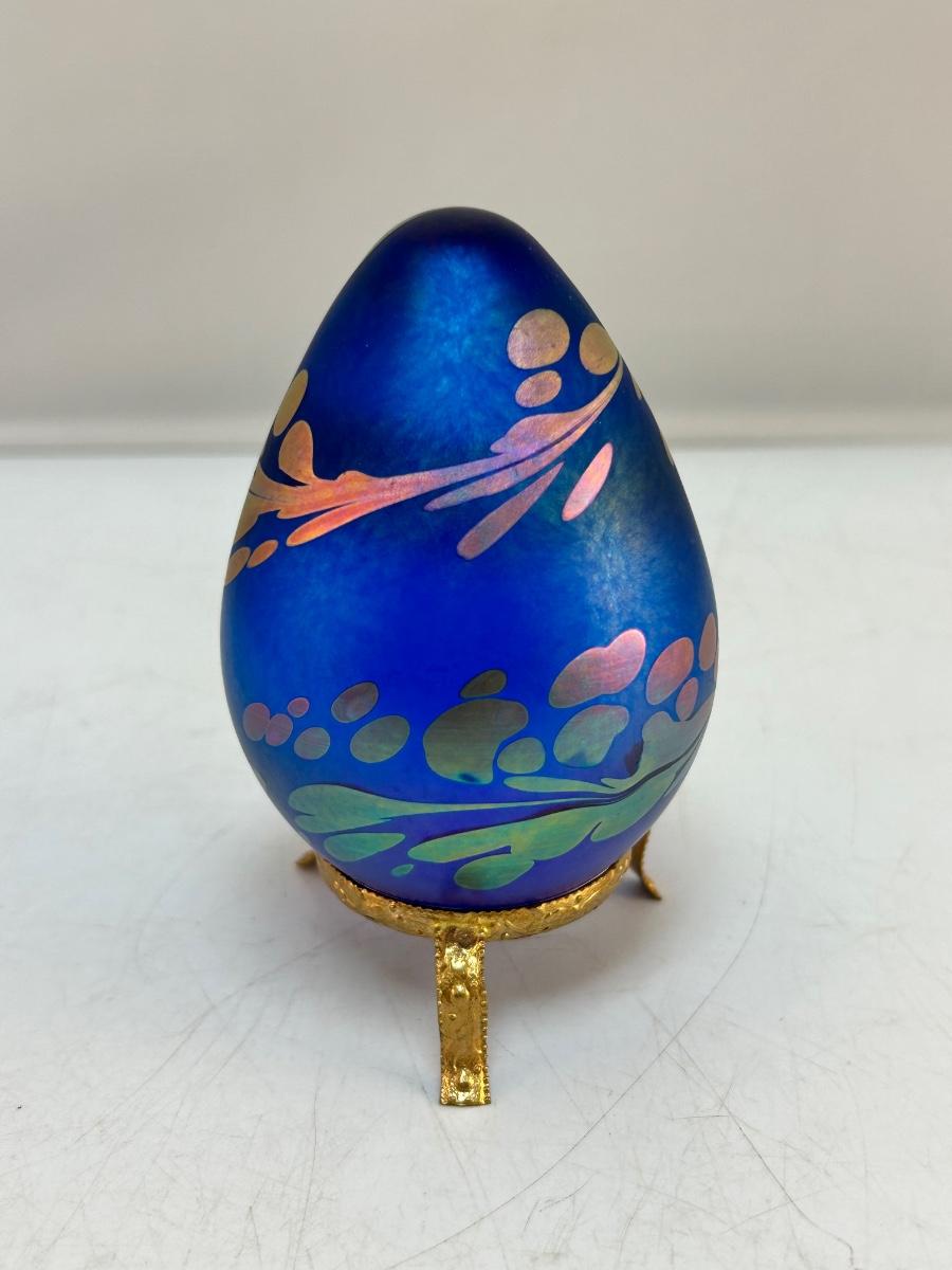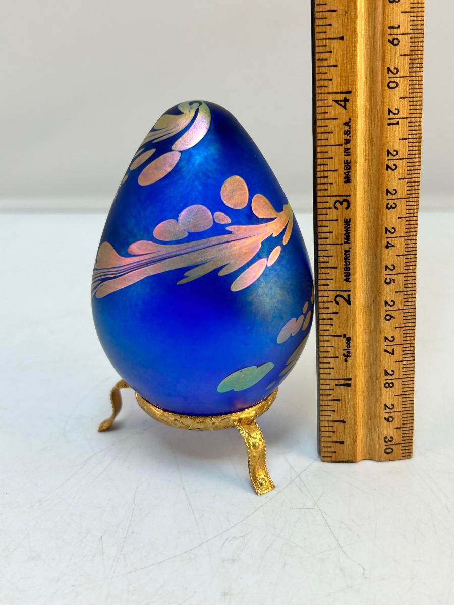 Brilliant Blue with Iridescent Swirl Art Glass Egg Paperweight Signed and Dated. In good condition. Great color. Comes with stand. It is signed and dated on the bottom but hard to make out fully.