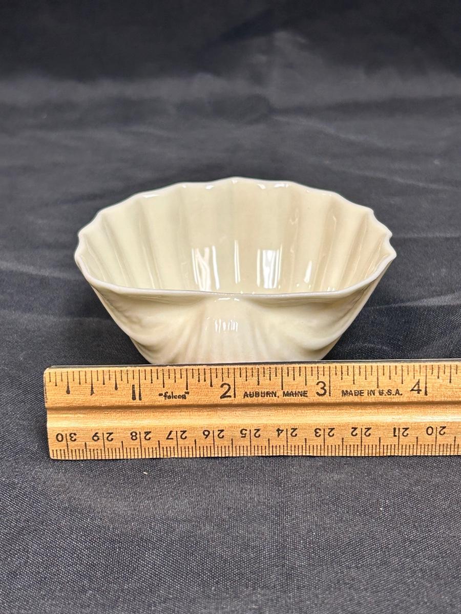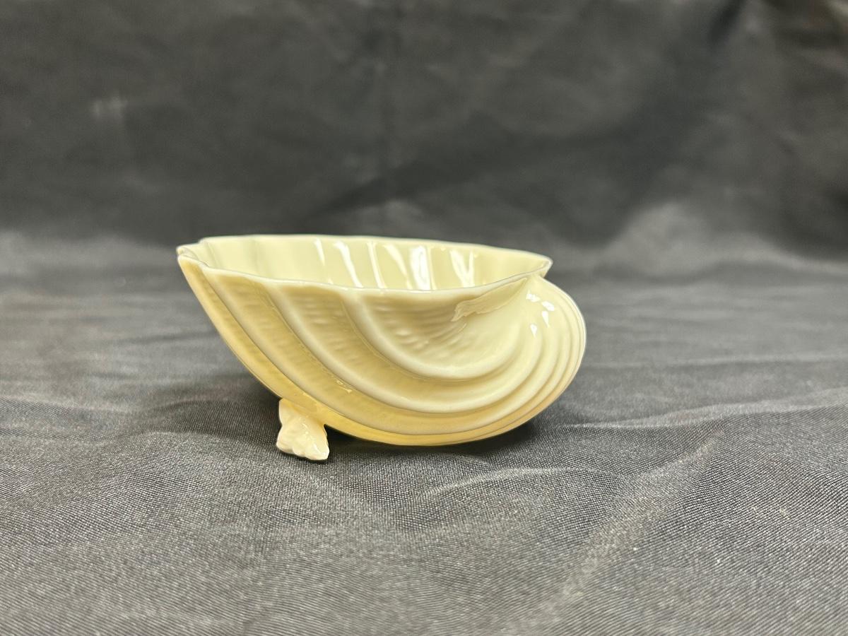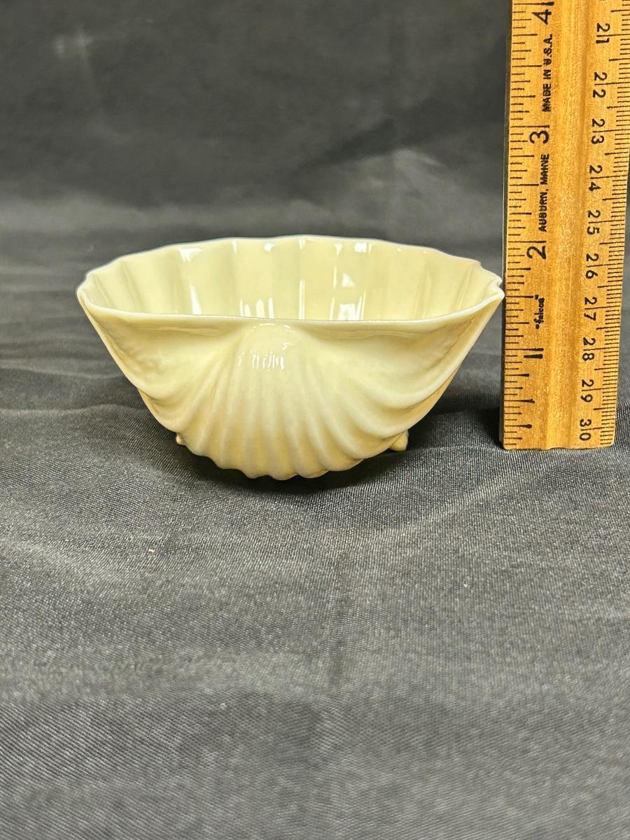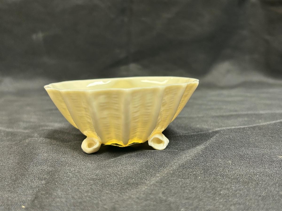 Vintage Belleek Limpet Scallop Seashell Sugar Bowl Trinket Dish. Scallop she’ll shaped dish with shell shaped feet. Yellow finish. Green Belleek stamp with a green Bellleek China sticker attached. About 3” size.