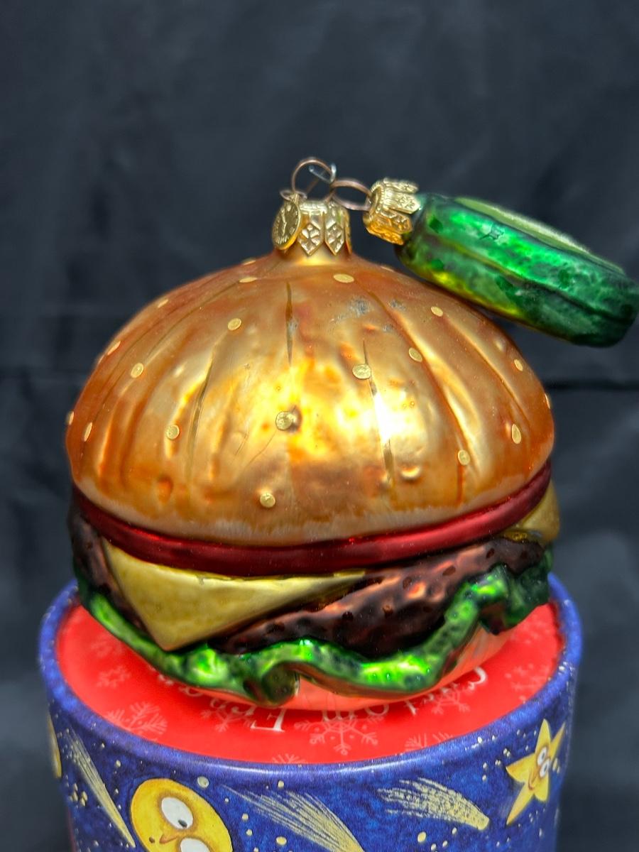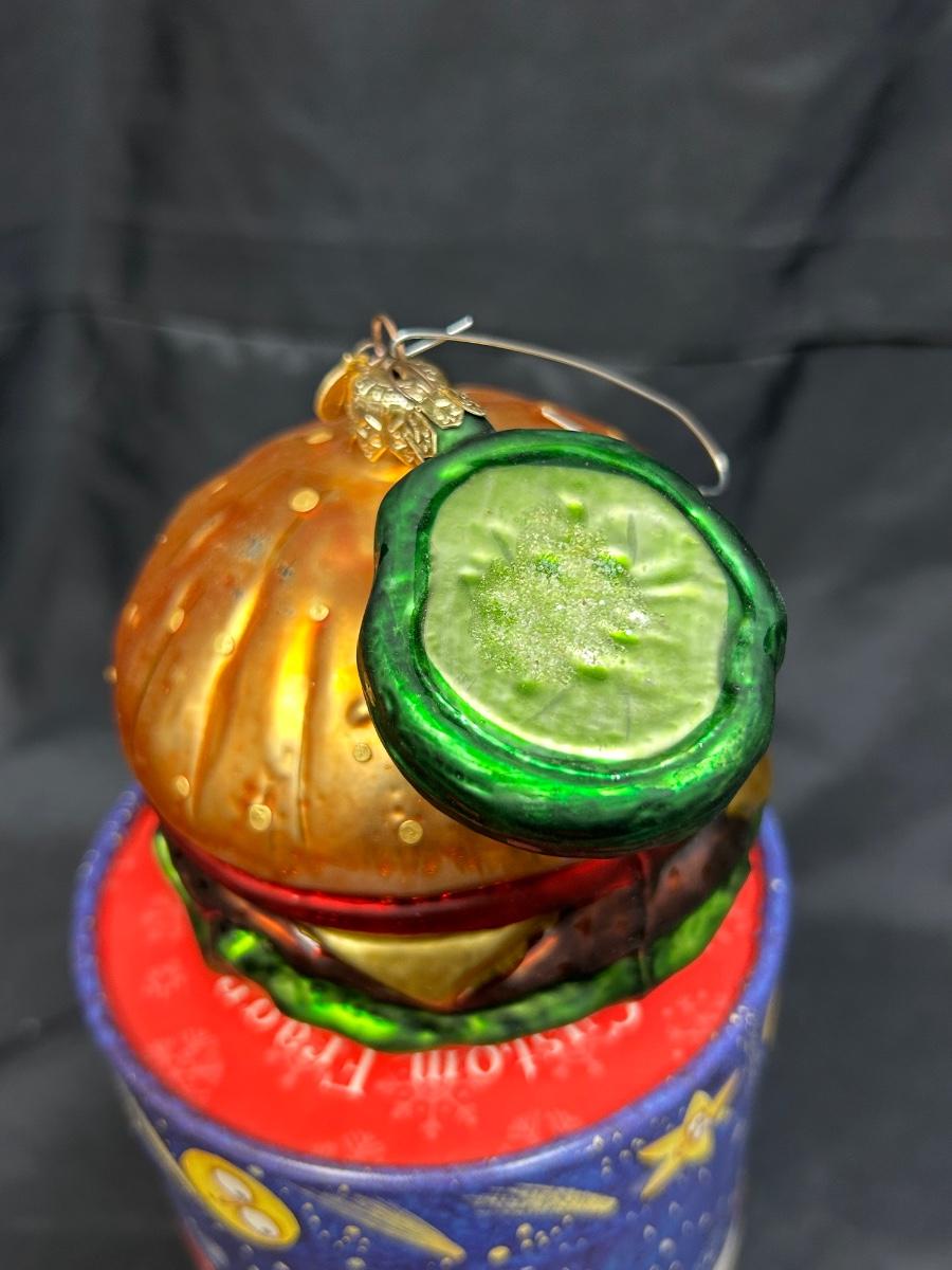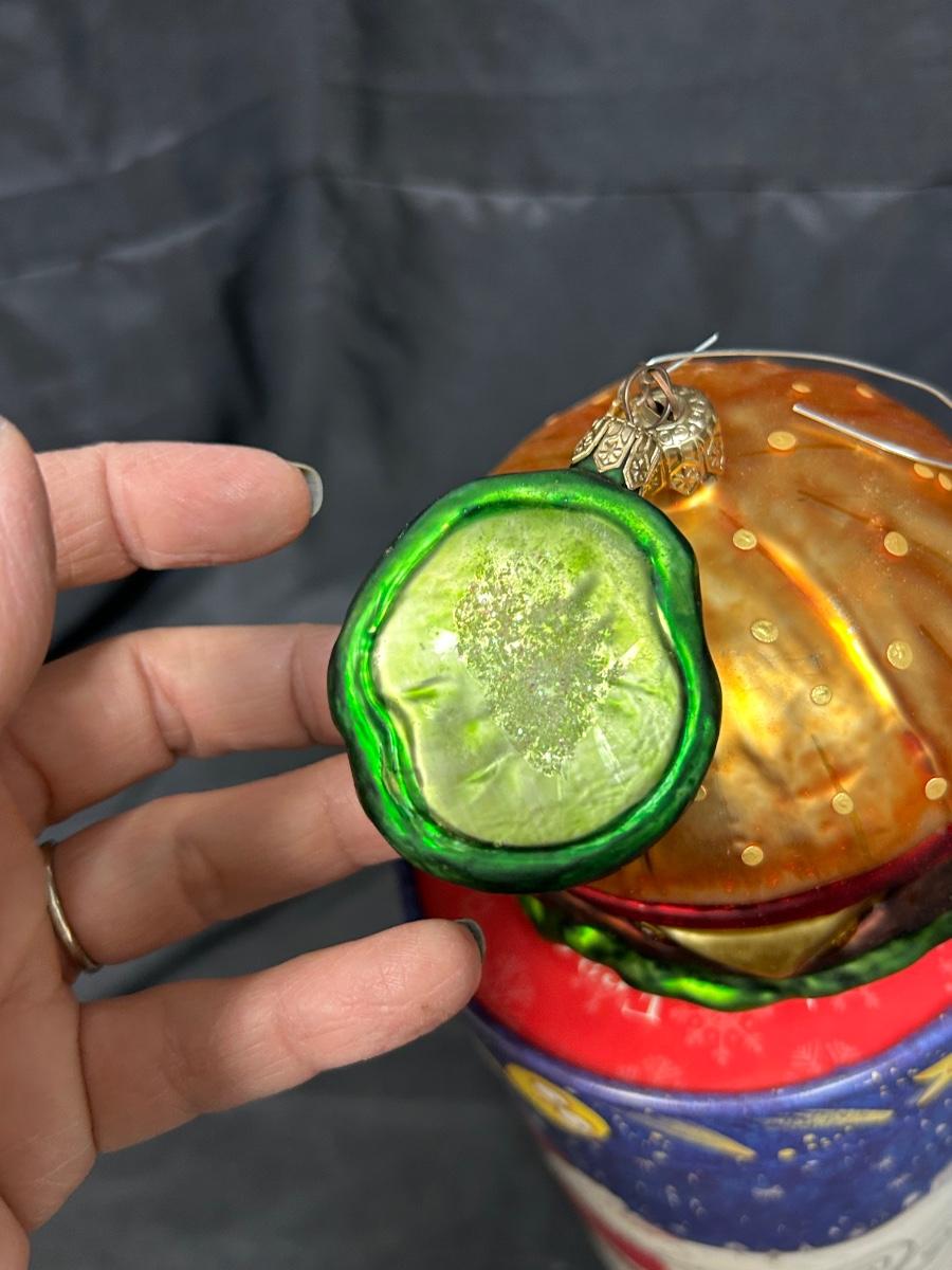 Novelty Blown Glass Cheeseburger and Pickle Chip Christmas Tree Ornaments in A Collectible Tube Box. Box is not original to burger. In good condition. Made in Poland.