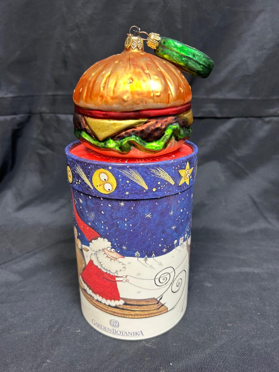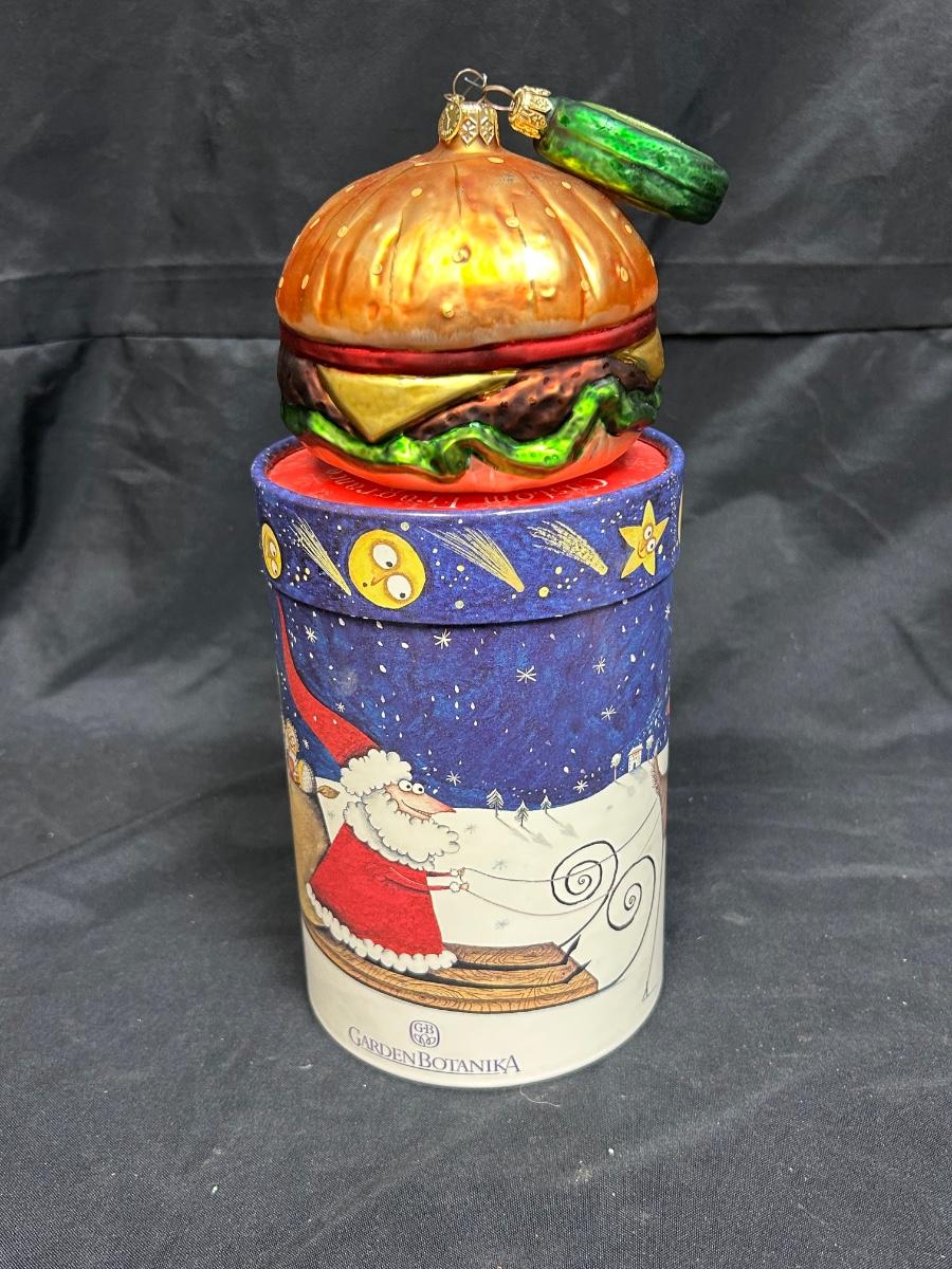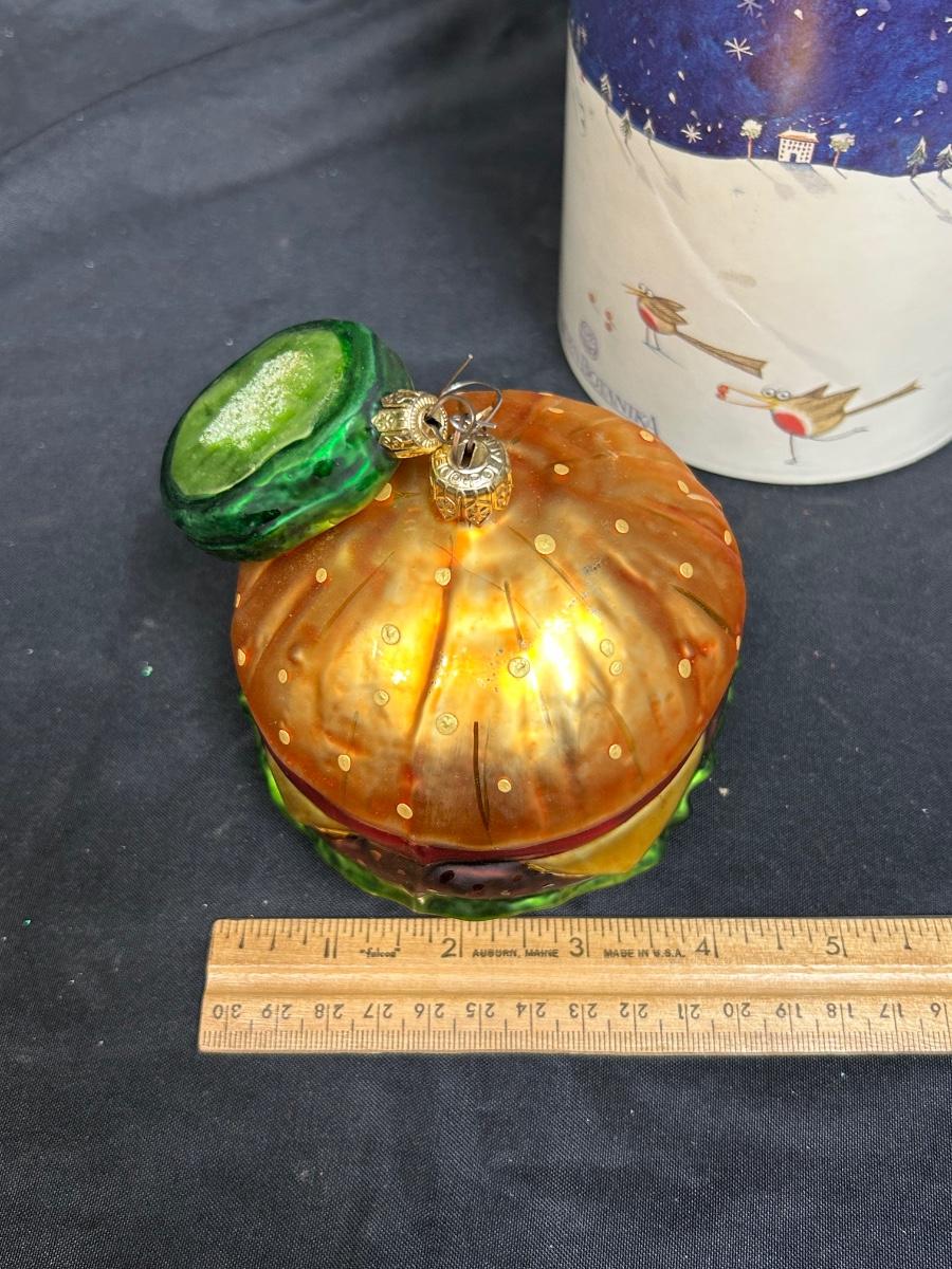 Novelty Blown Glass Cheeseburger and Pickle Chip Christmas Tree Ornaments in A Collectible Tube Box. Box is not original to burger. In good condition. Made in Poland.