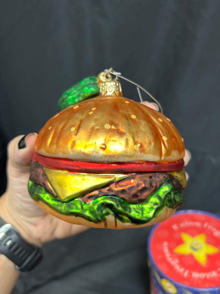 Novelty Blown Glass Cheeseburger and Pickle Chip Christmas Tree Ornaments in A Collectible Tube Box