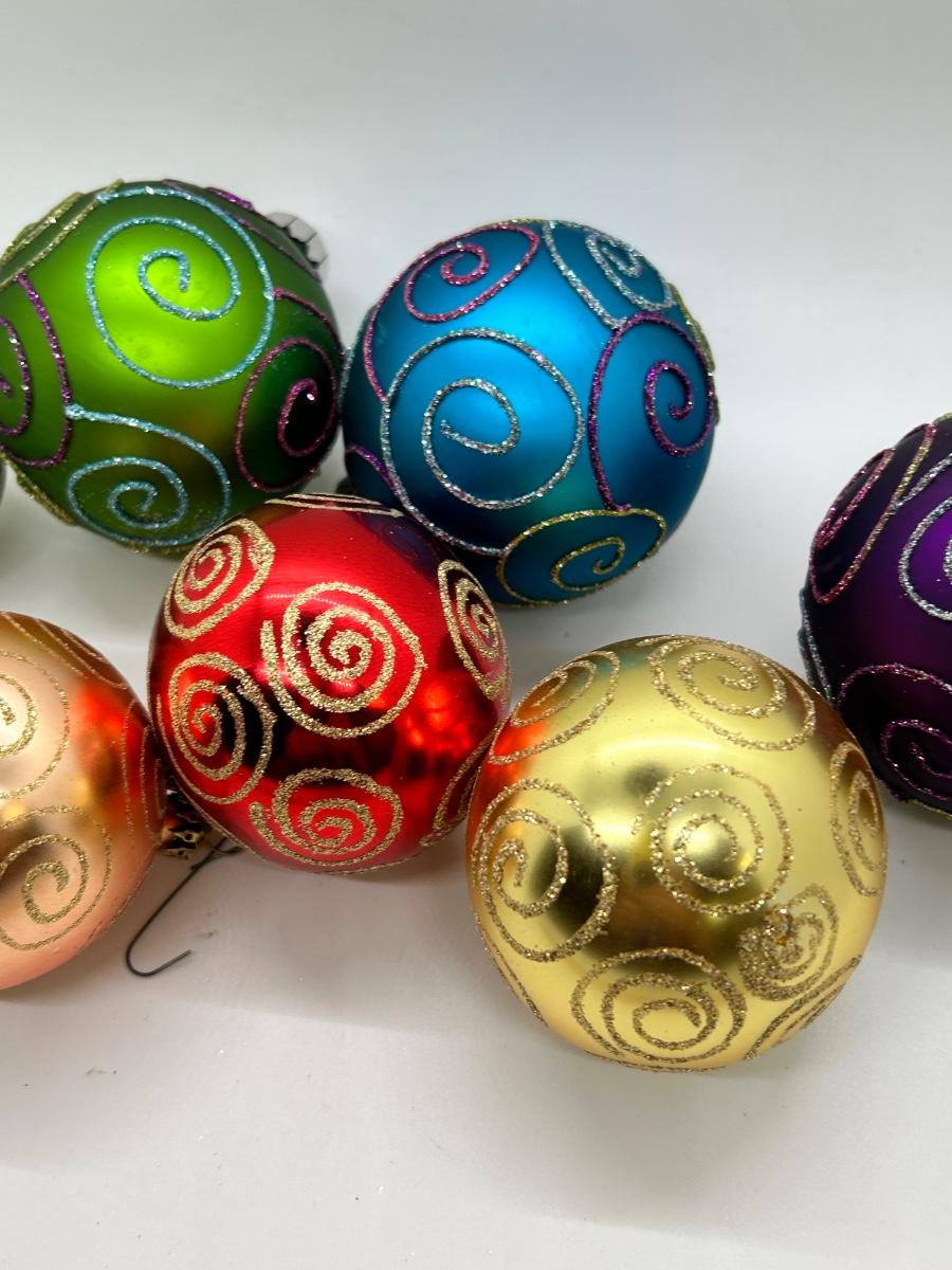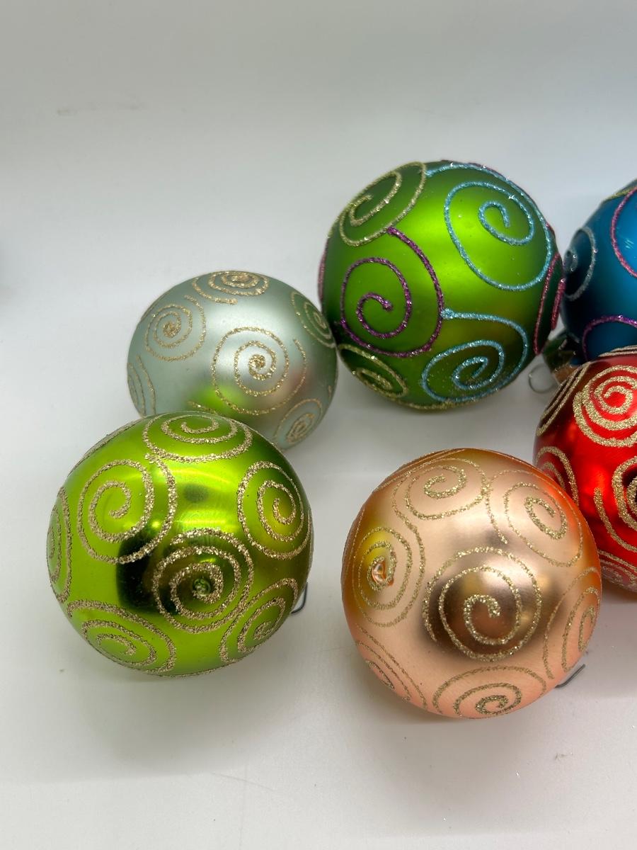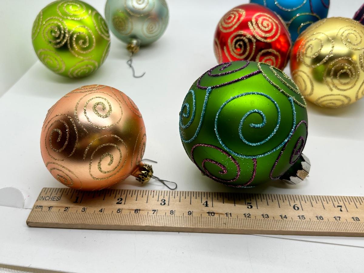 Mixed Color Lot of Glass Christmas Holiday Bulbs with Glitter Swirl Design Two Sizes. In good condition.