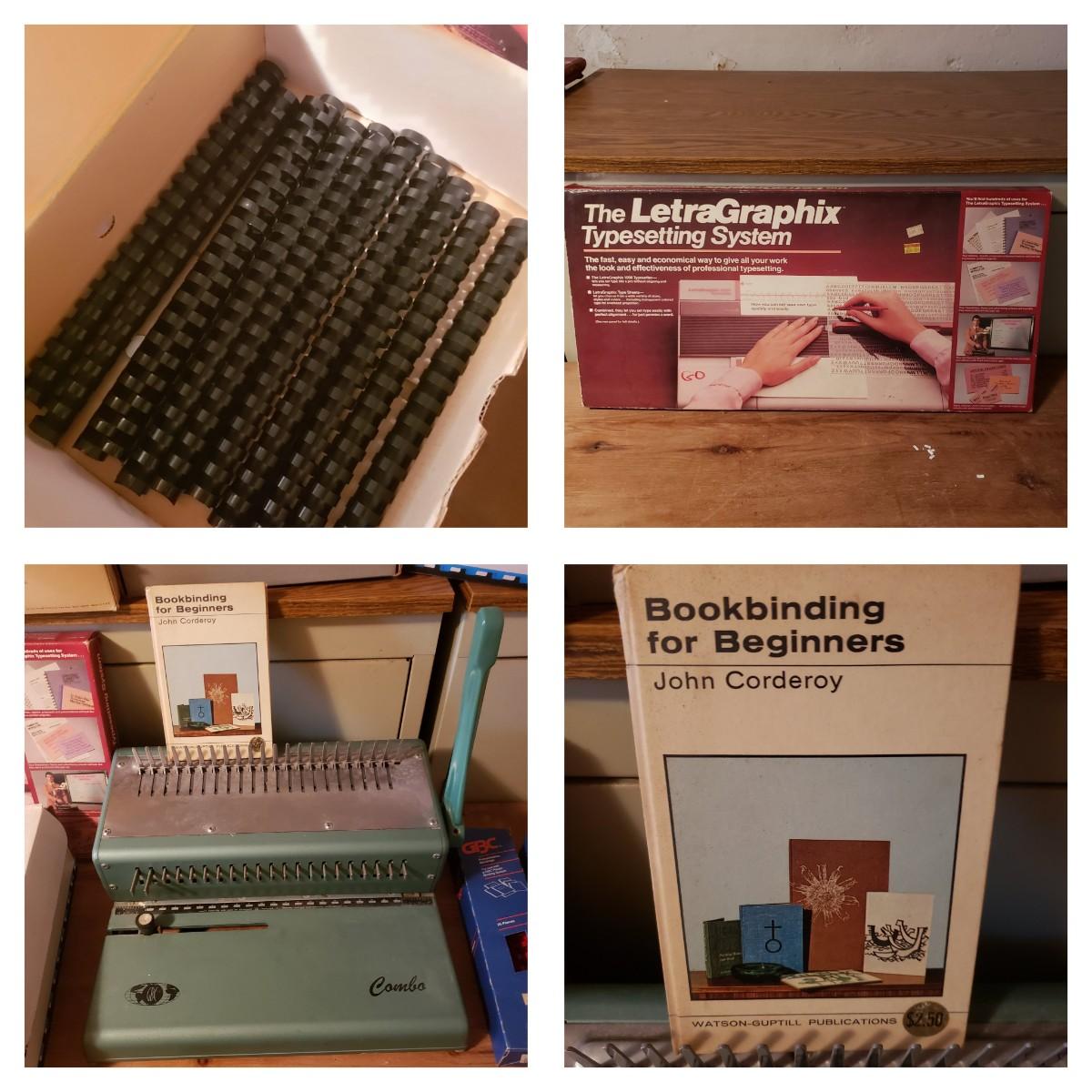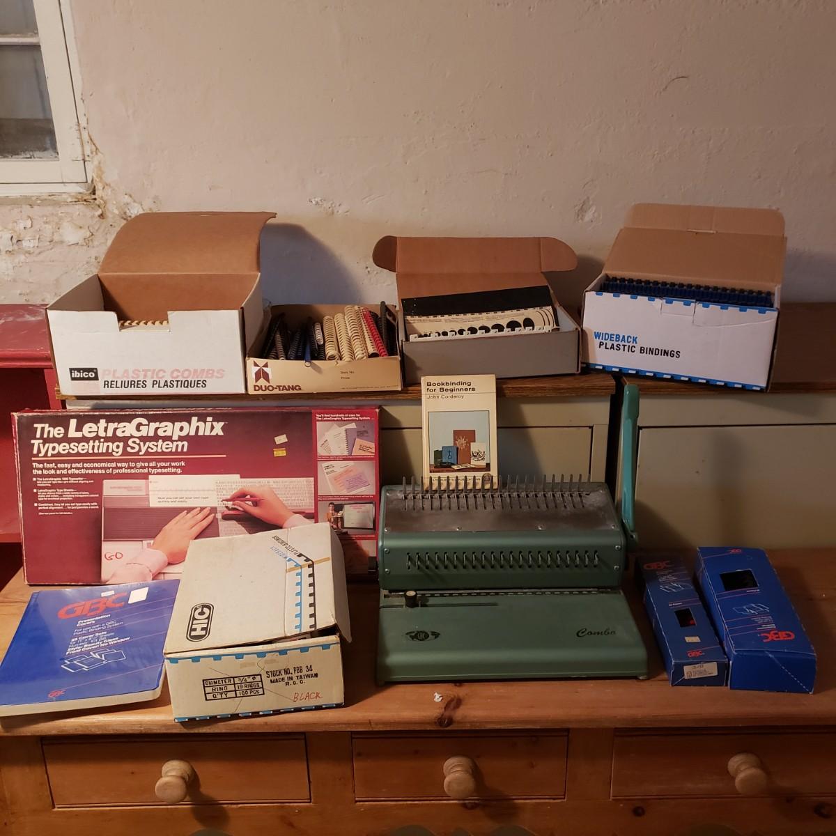 Think of the books you can make, old school style! This is a GBC binding machine (13" x 15" x 14"H), that cuts the holes and then binds the plastic to the book. Comes with multiple sized binders and colors. The Letragraphix appears to never have been used. See box for details.