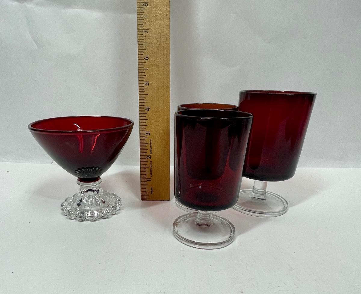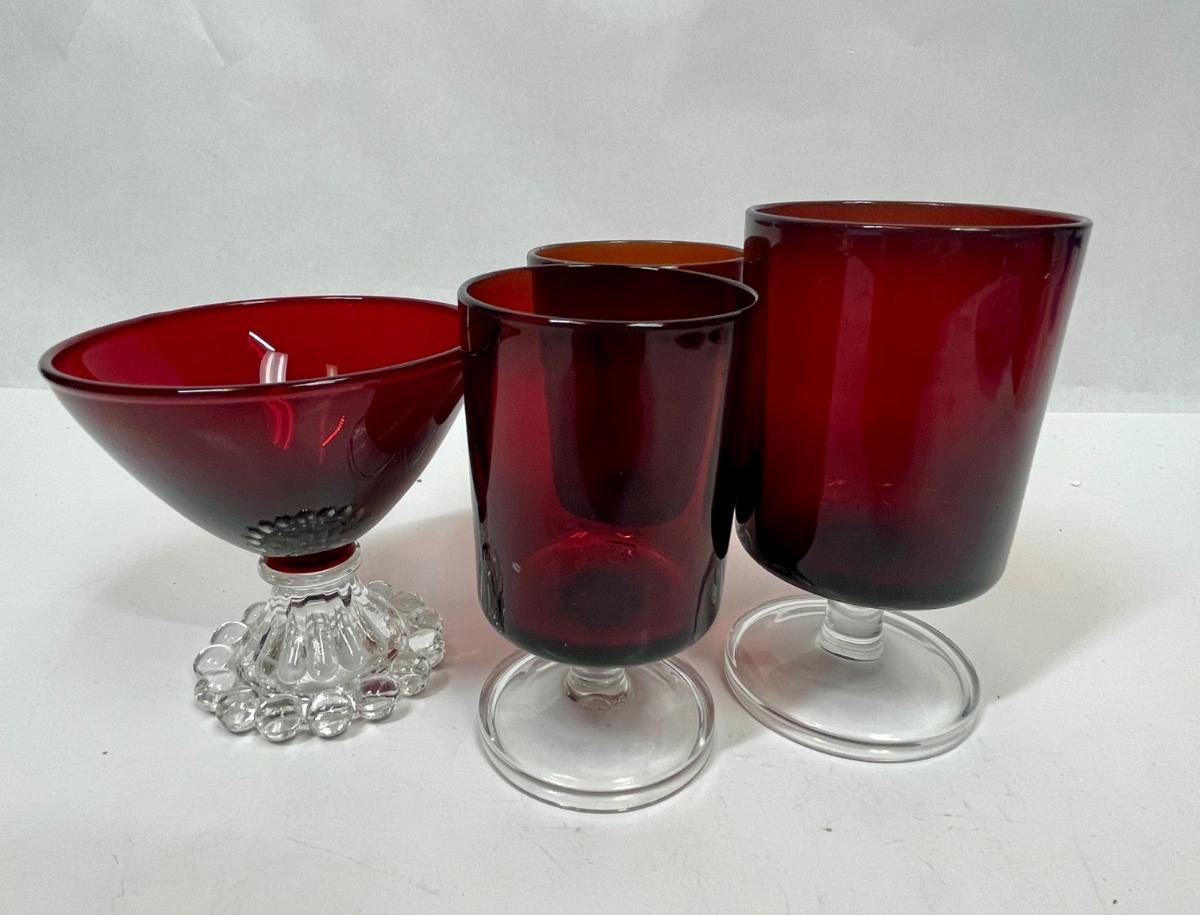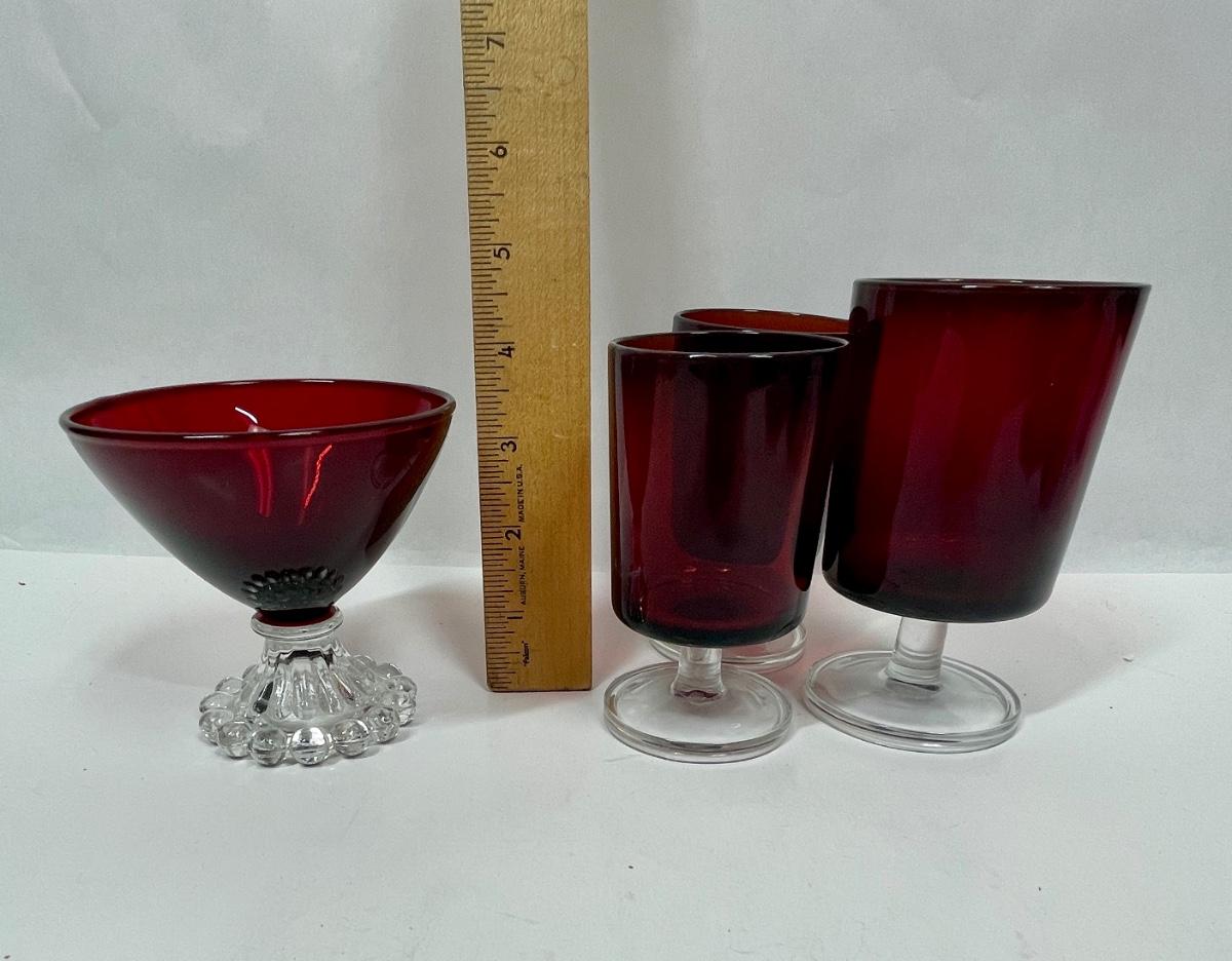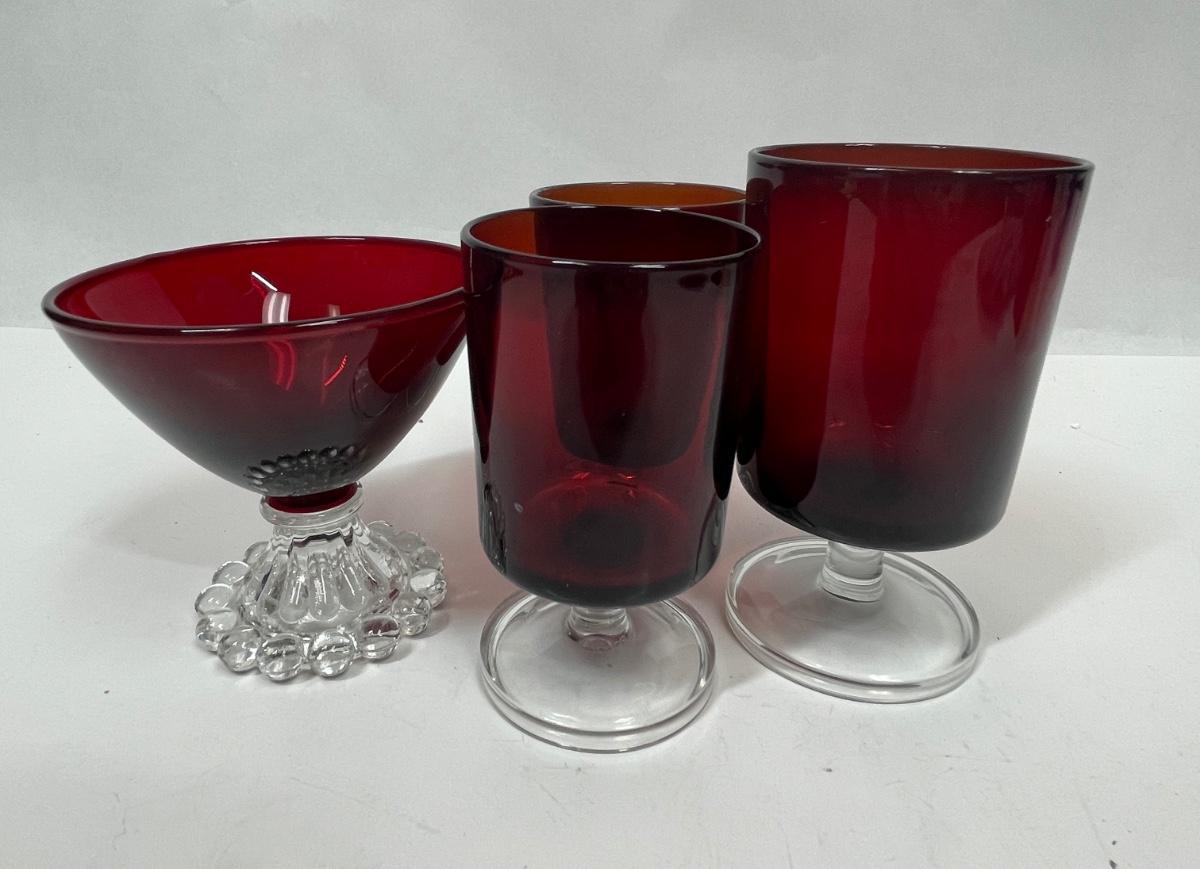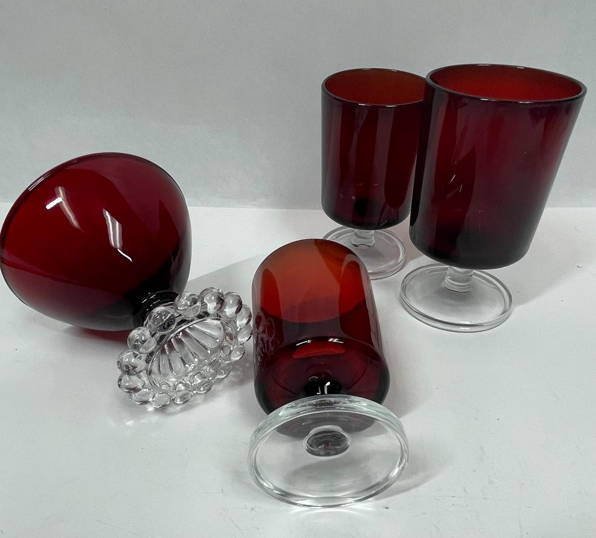 3 Vintage Red Luminarc Stemmed Glasses and Vintage Anchor Hocking Ruby Red Bubble Foot Champagne Glass