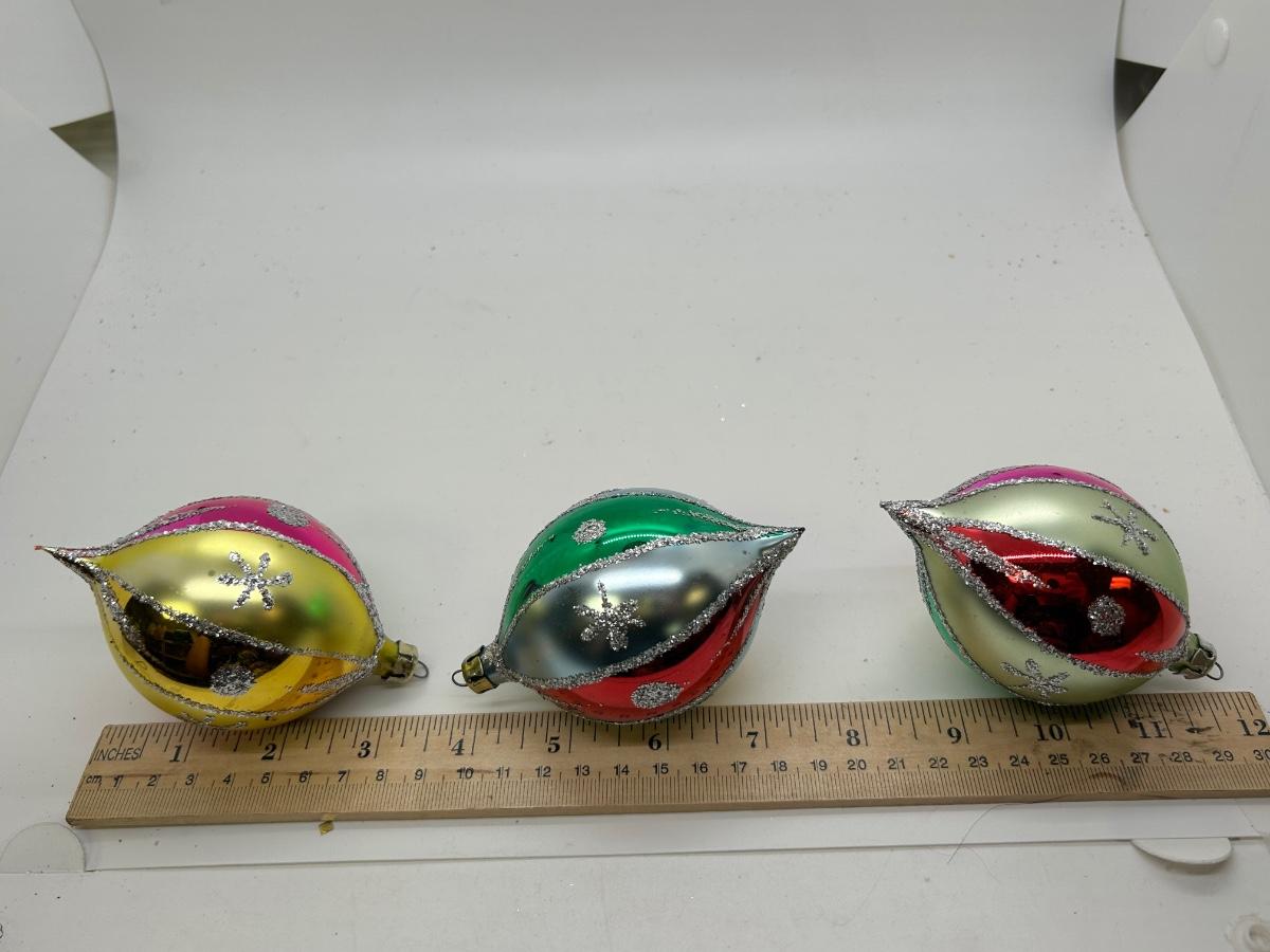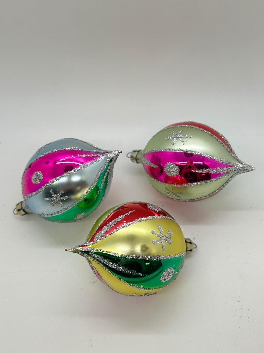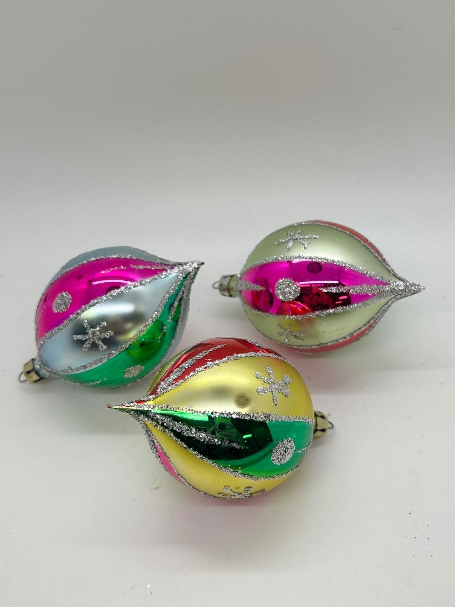Lot of Three Vintage Colorful Striped Blown Glass Christmas Holiday Tree Ornaments Poland. In excellent vintage condition. Striped with glitter accent. No broken bulbs. About 3" size.