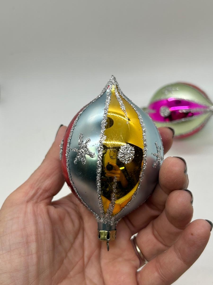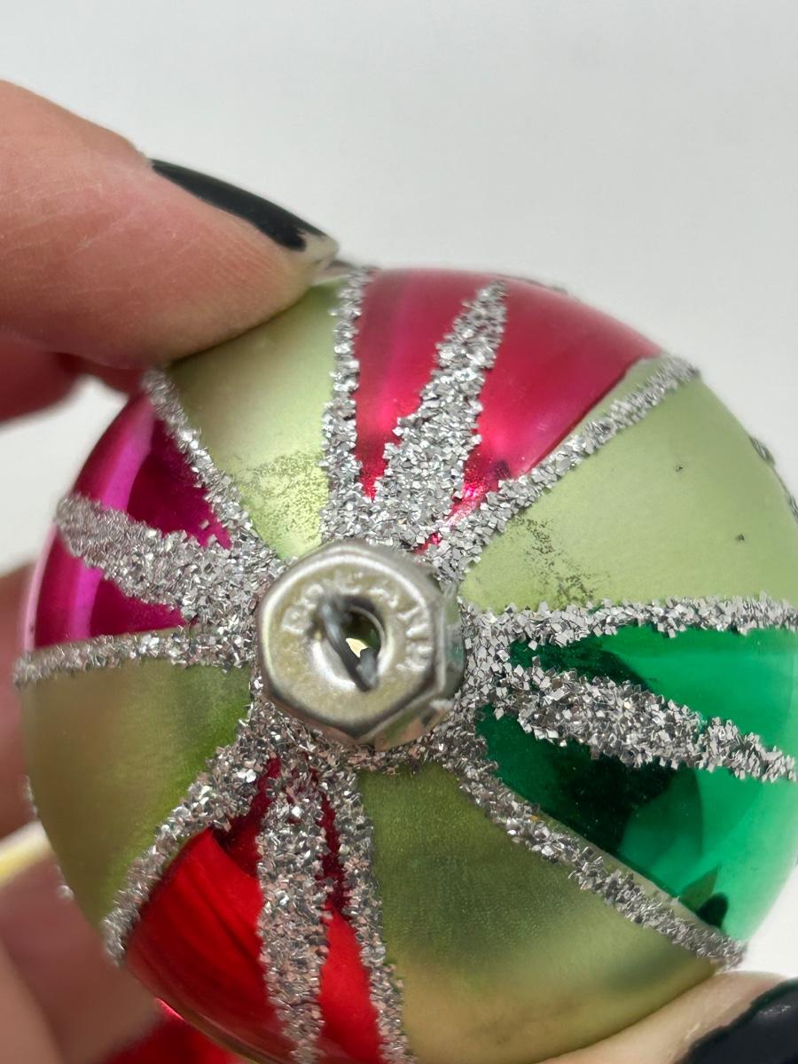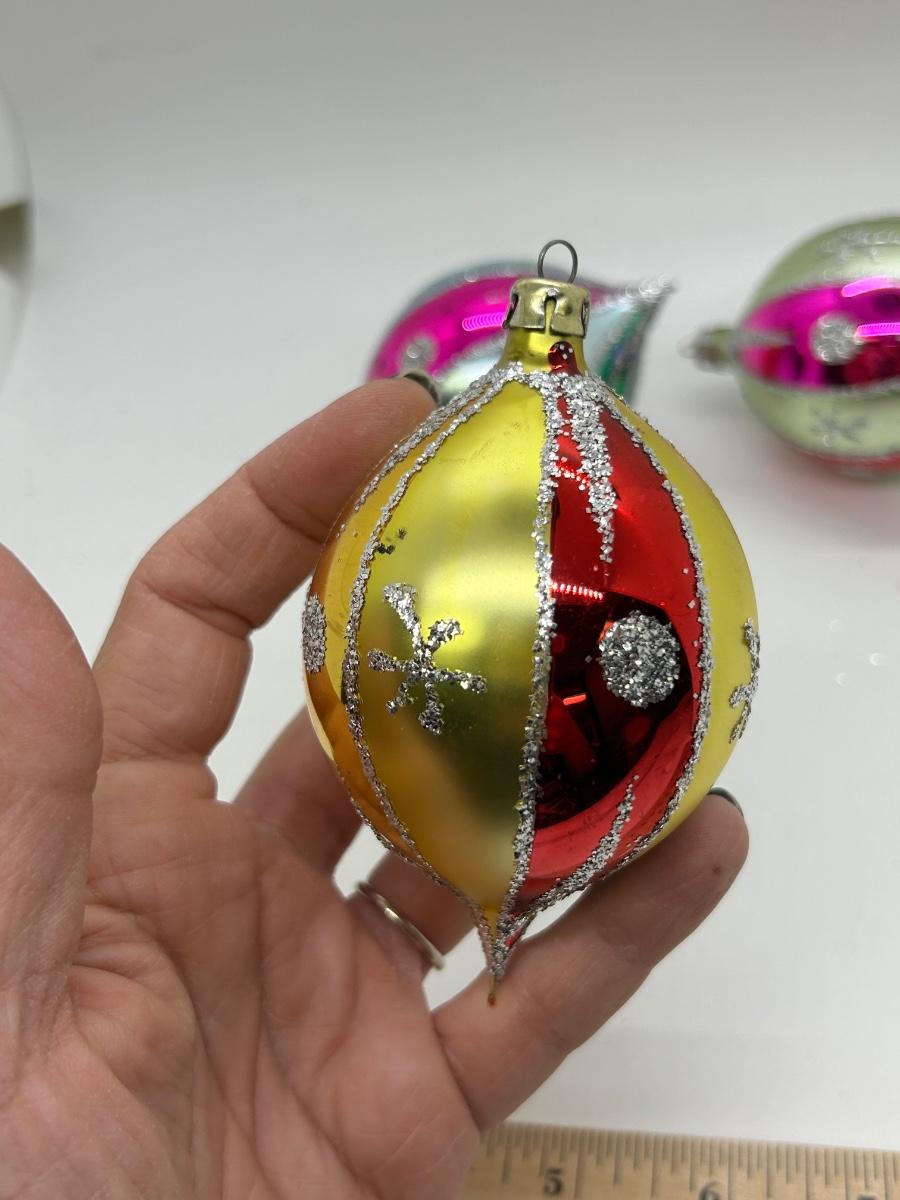 Lot of Three Vintage Colorful Striped Blown Glass Christmas Holiday Tree Ornaments Poland. In excellent vintage condition. Striped with glitter accent. No broken bulbs. About 3" size.