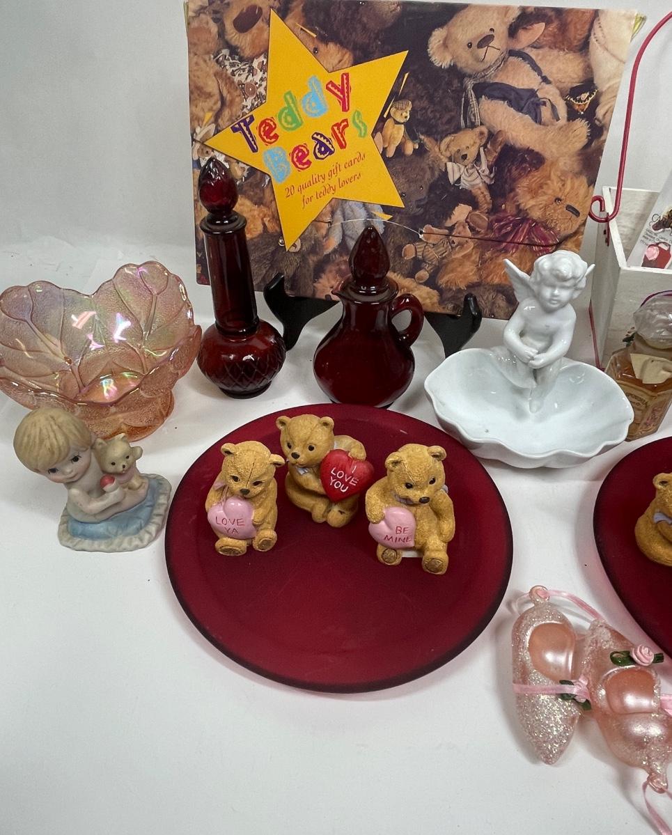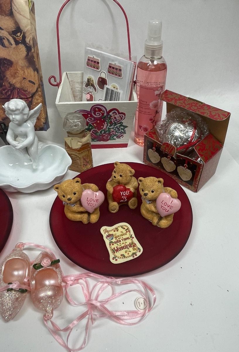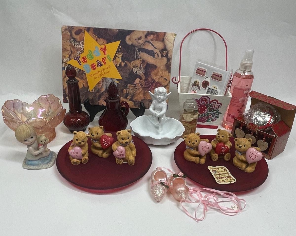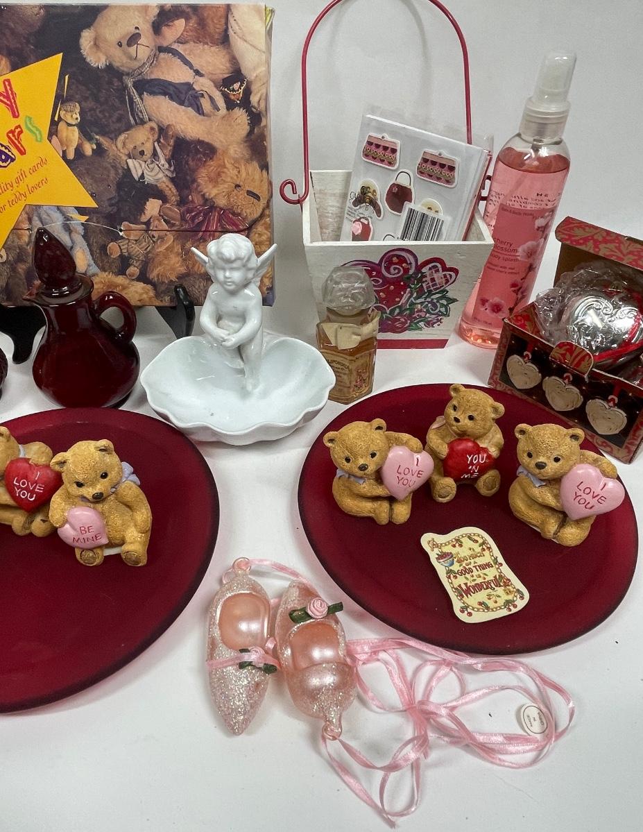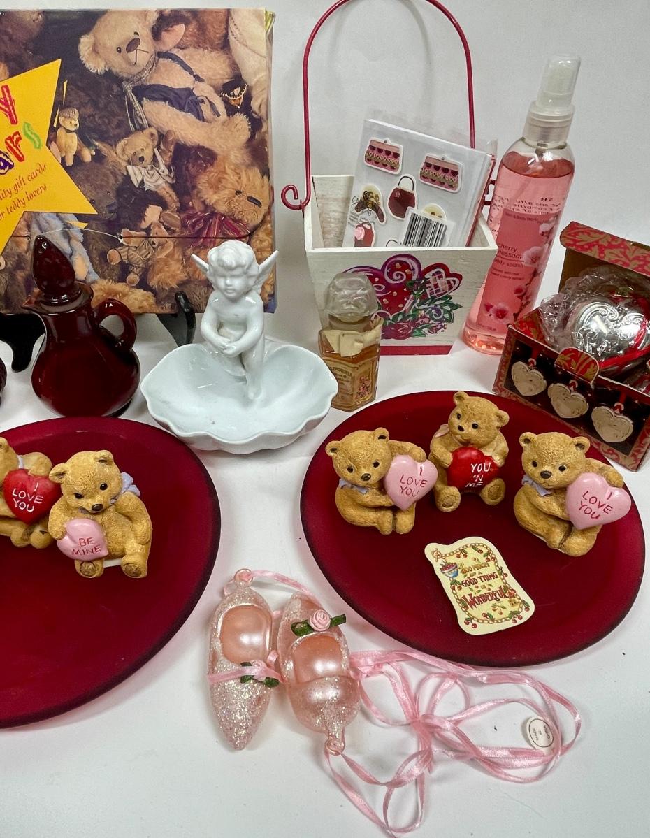 Valentines Day Lot - greeting cards, bear figurines, Candle holder plates, etc