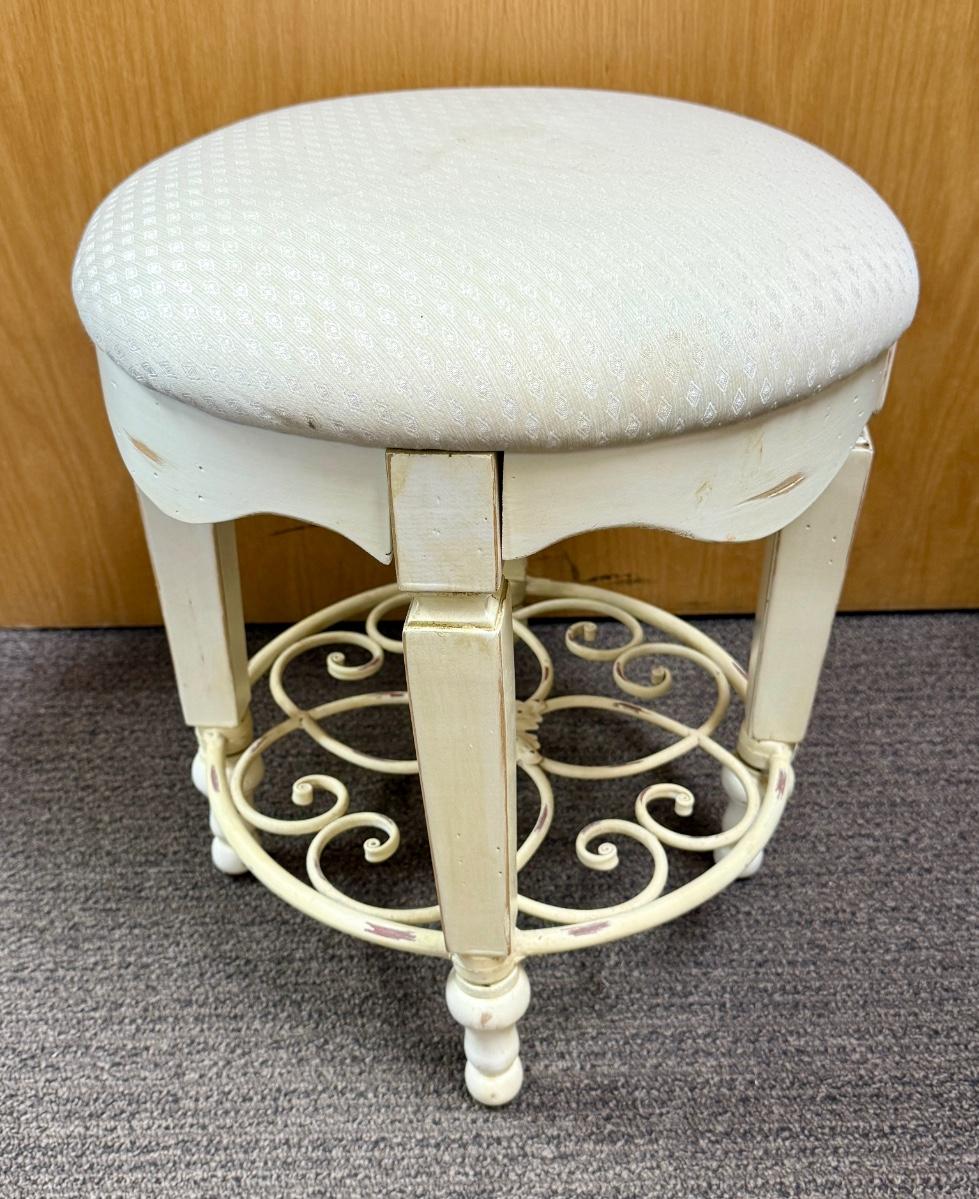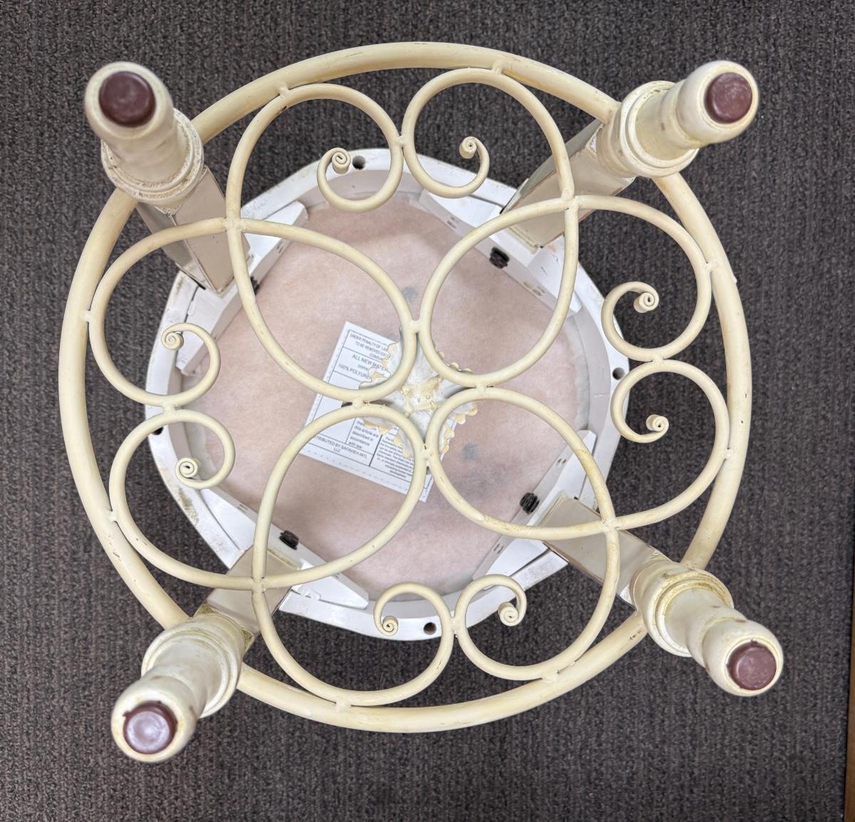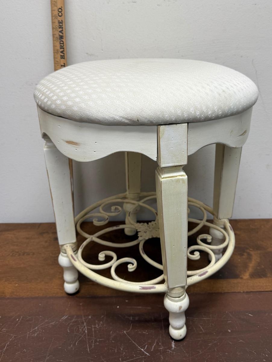 In fair condition, there are a few light stains on upholstered seat and the legs are a little rickety.