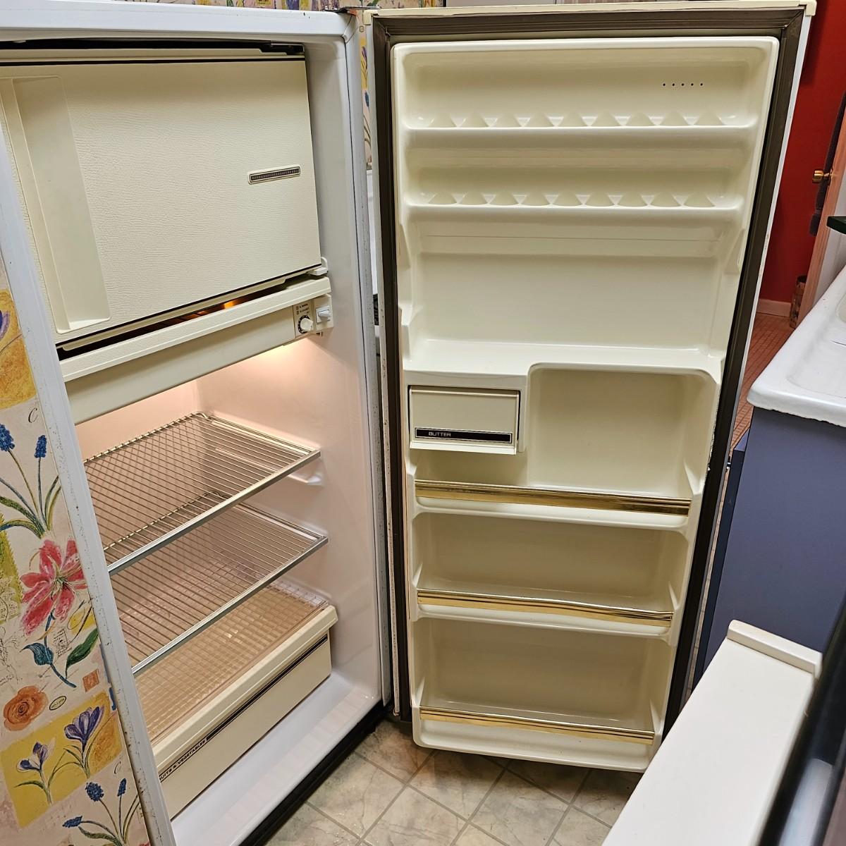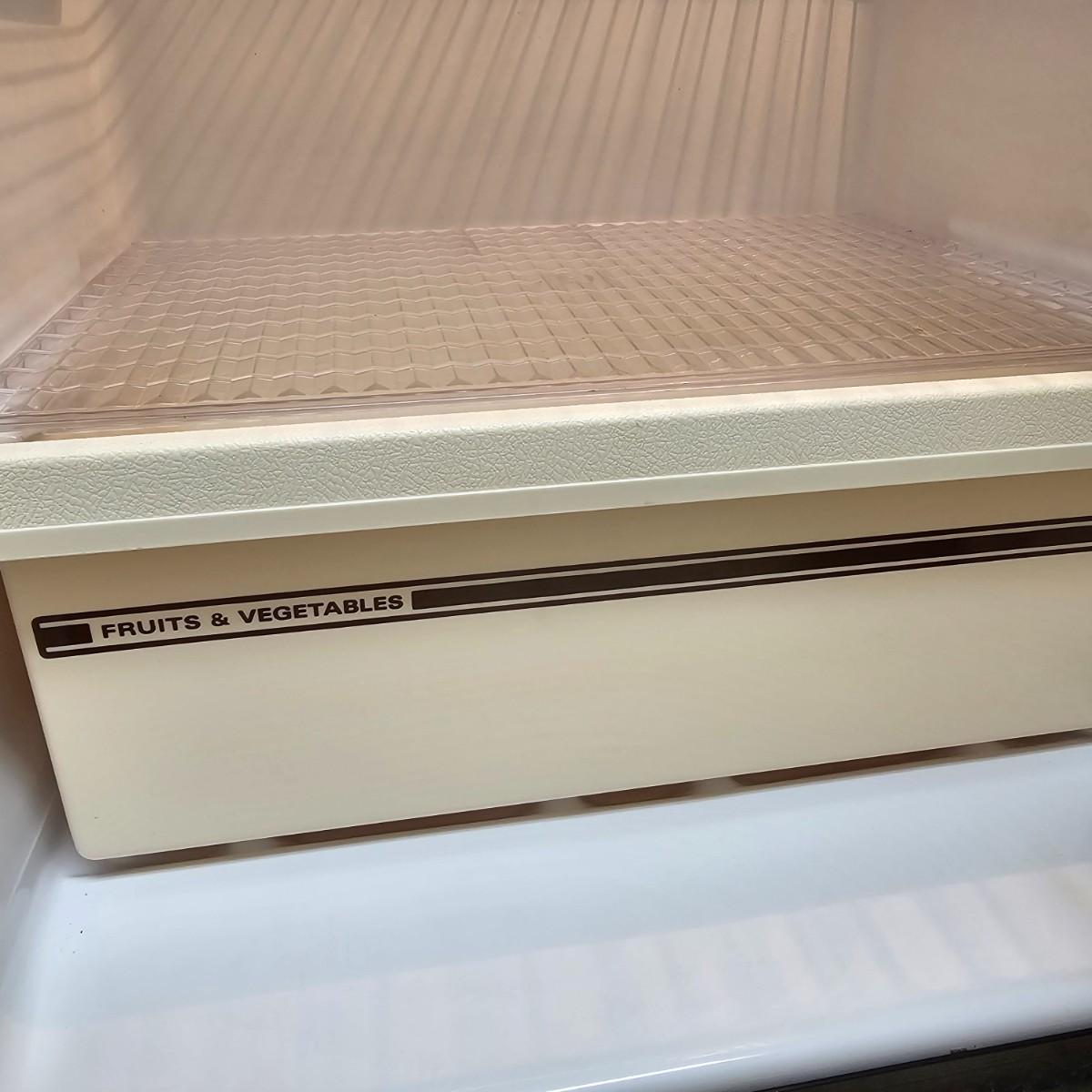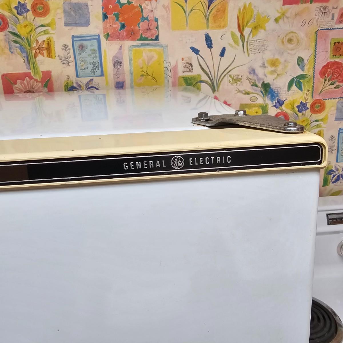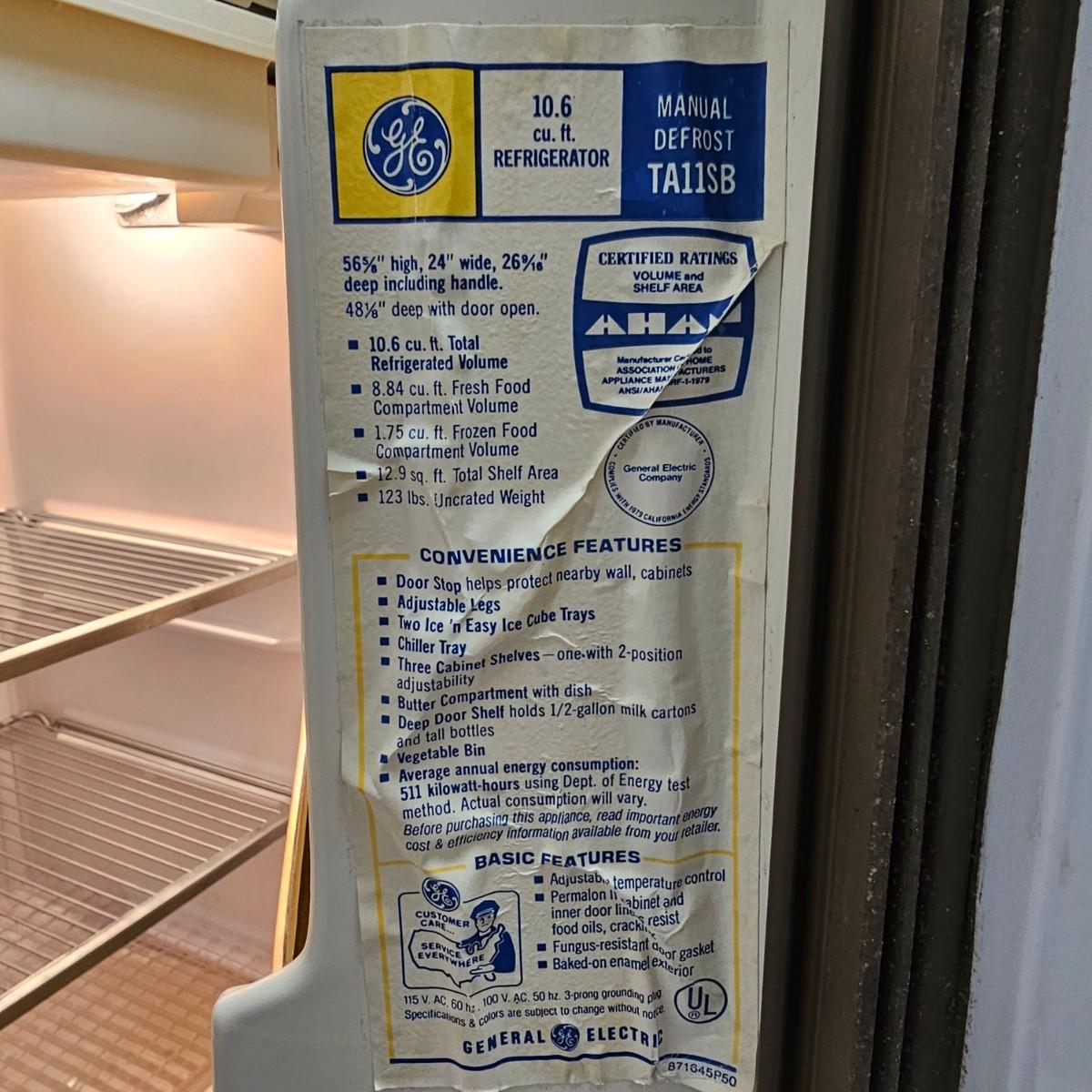 Vintage and stylish G.E. refrigerator with top freezer. Unit has 10.6 cu ft capacity. White with tan accents, this unit measures 24" x 26" x 57"H, powered on when plugged in. Note: there is a block of ice in the freezer that cannot be removed at this time. See photos for details. Local pickup only. Winning bidder must bring assistance to help move and load this item due to its weight and/or size.