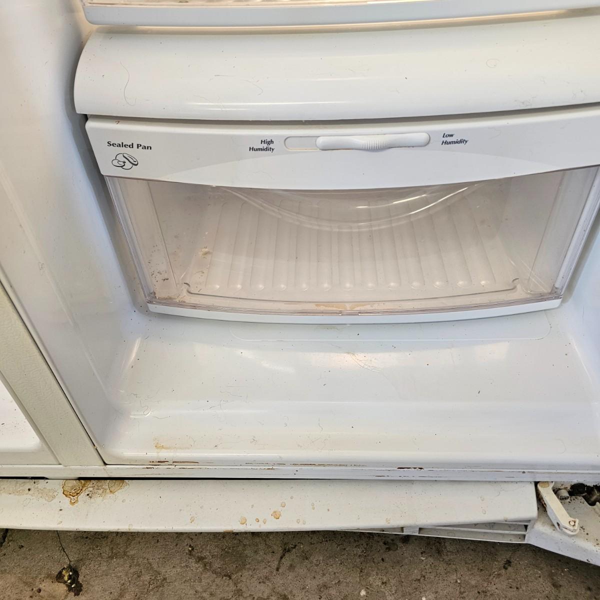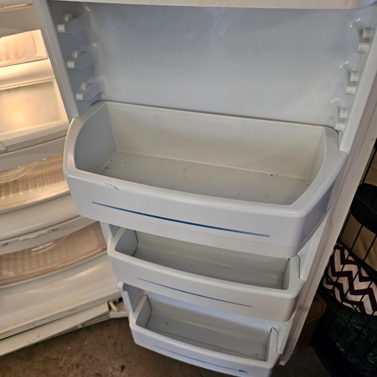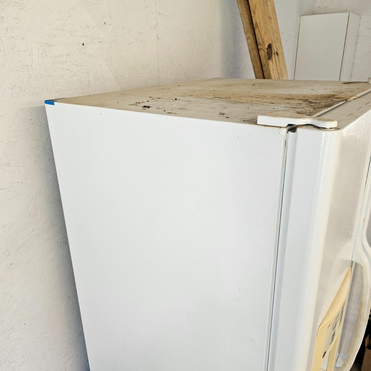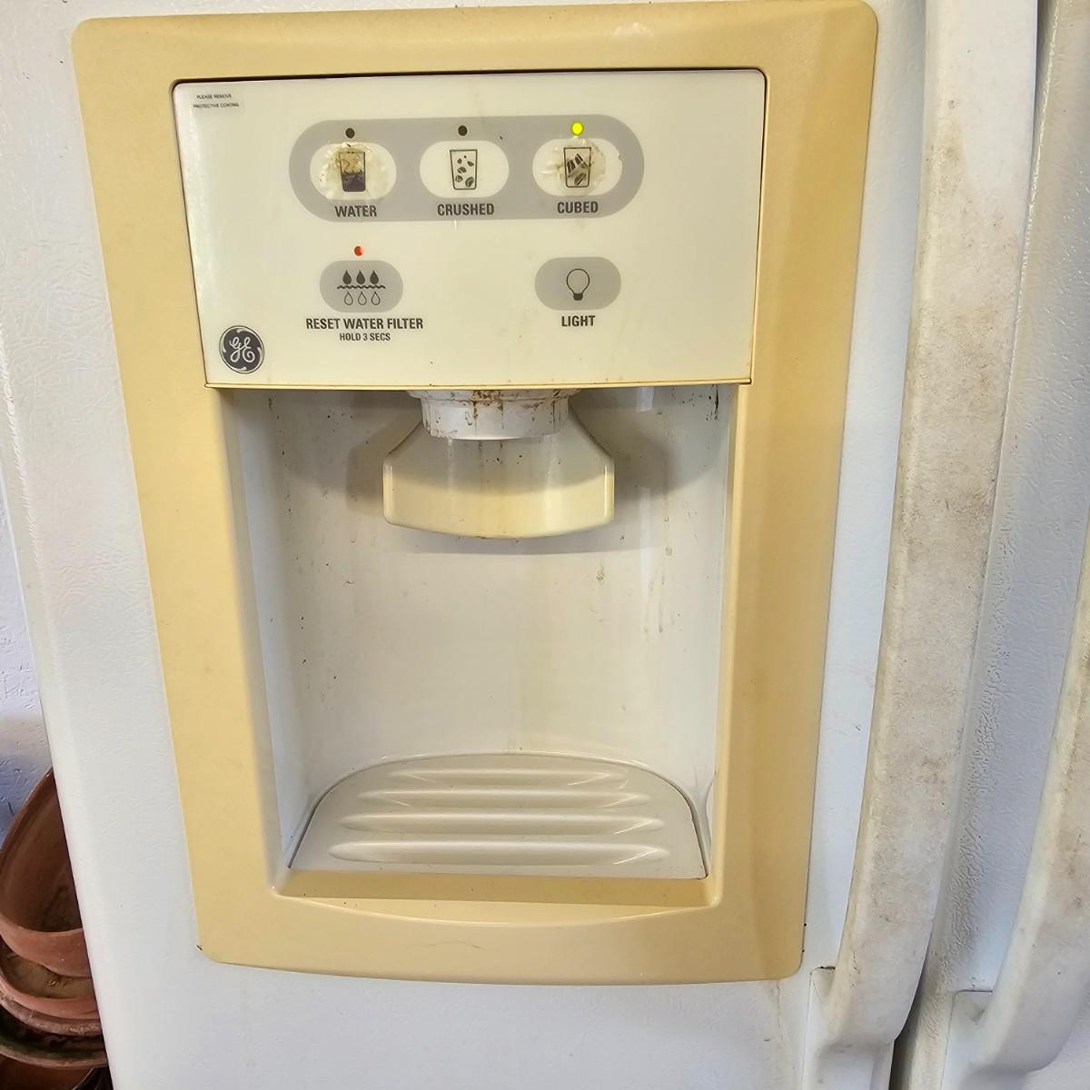 Textured white finish GE refrigerator/freezer with ice and water dispenser in the door. Many individual compartments inside, pull out drawers. Individual temperature controls for each side. Unit measures 36" x 31" x 70"H. Rolls forward on wheels. Needs some cleaning. Fridge is in garage, easy access. See photos for details. Local pickup only. Winning bidder must bring assistance to help move and load this item due to its weight and/or size.