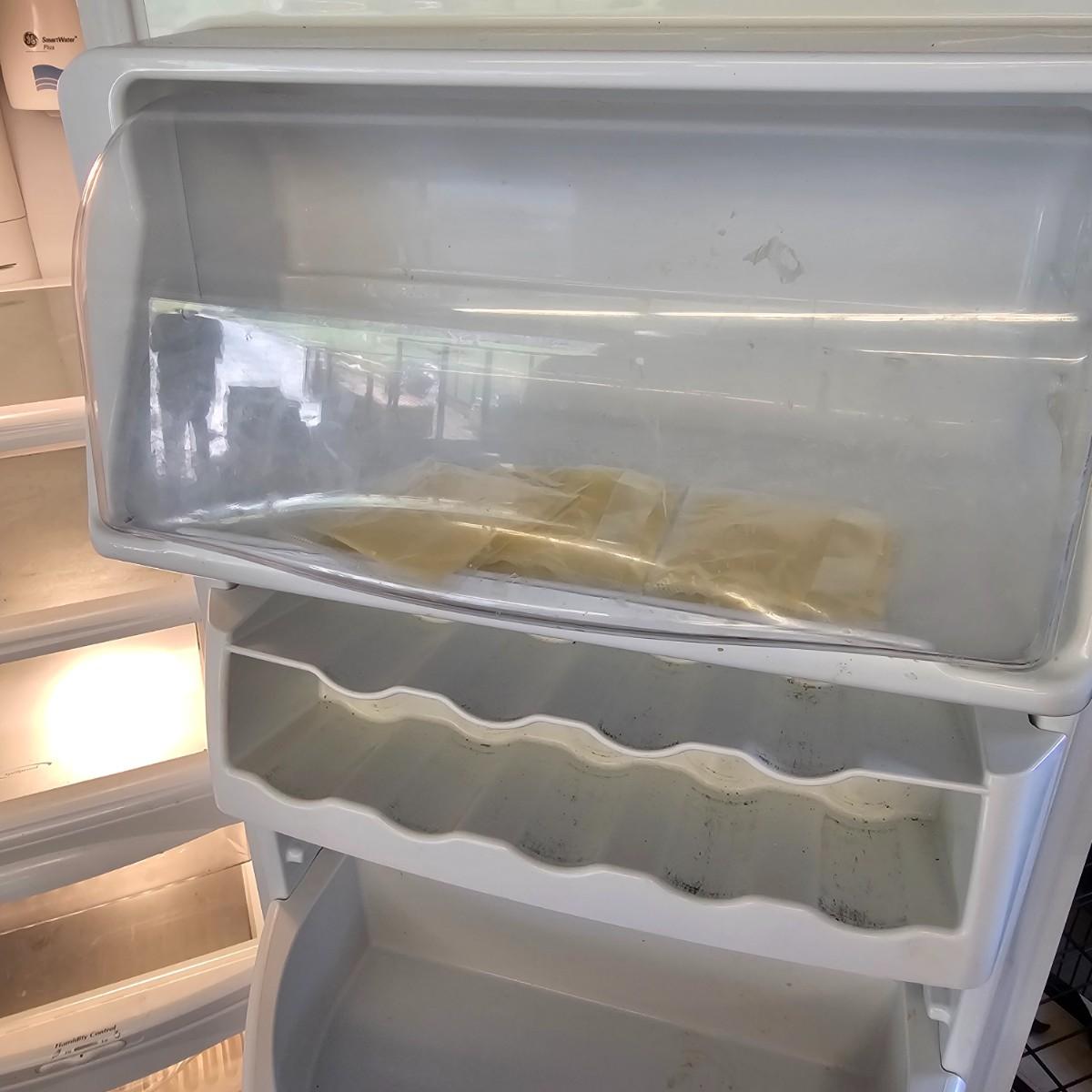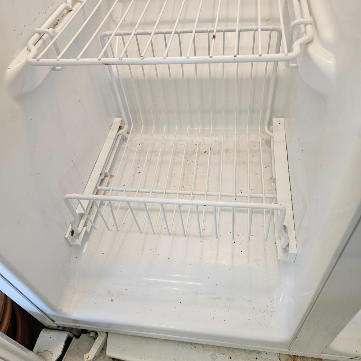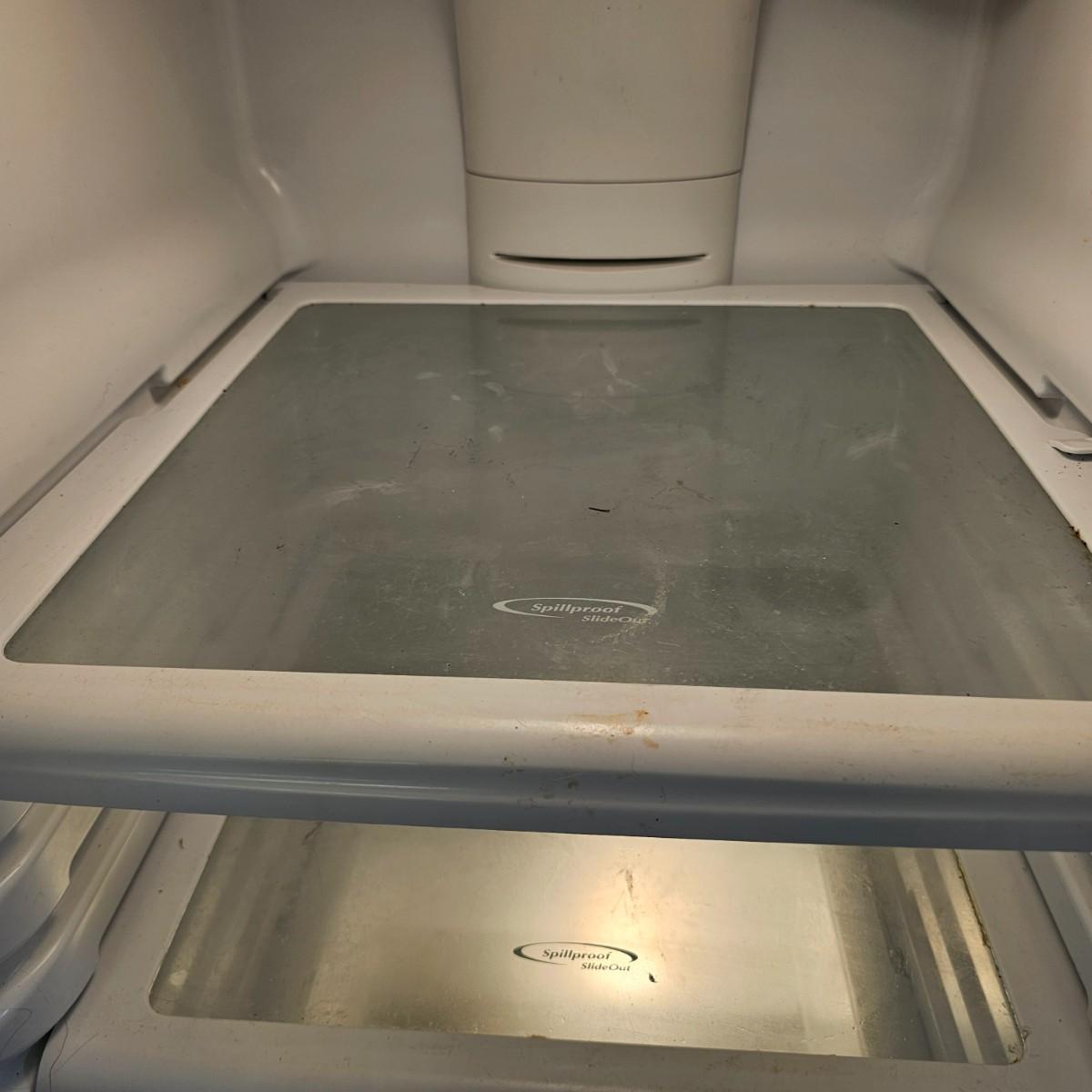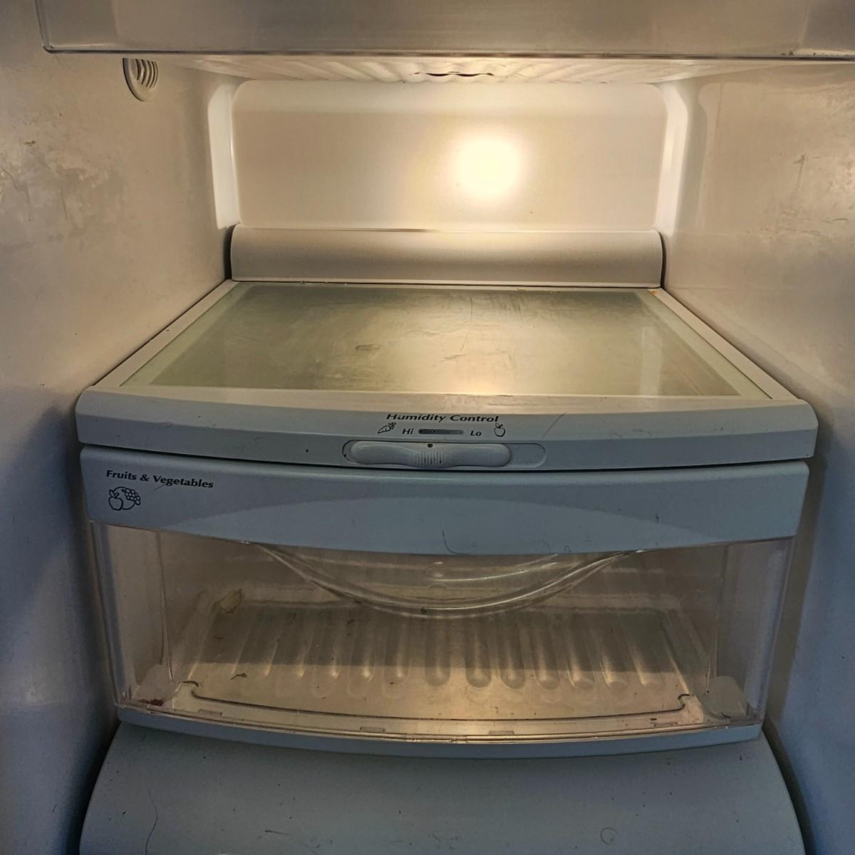 Textured white finish GE refrigerator/freezer with ice and water dispenser in the door. Many individual compartments inside, pull out drawers. Individual temperature controls for each side. Unit measures 36" x 31" x 70"H. Rolls forward on wheels. Needs some cleaning. Fridge is in garage, easy access. See photos for details. Local pickup only. Winning bidder must bring assistance to help move and load this item due to its weight and/or size.
