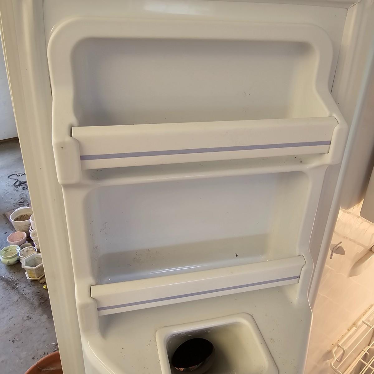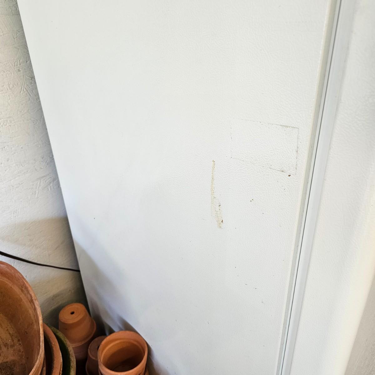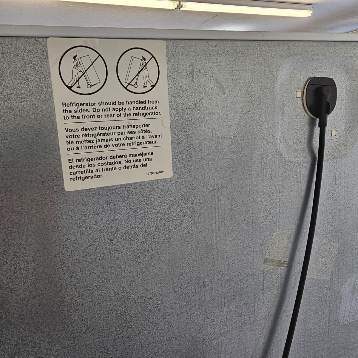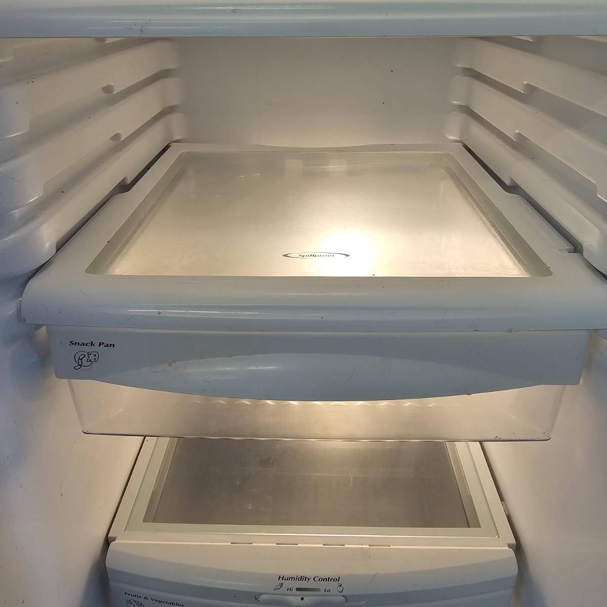 Textured white finish GE refrigerator/freezer with ice and water dispenser in the door. Many individual compartments inside, pull out drawers. Individual temperature controls for each side. Unit measures 36" x 31" x 70"H. Rolls forward on wheels. Needs some cleaning. Fridge is in garage, easy access. See photos for details. Local pickup only. Winning bidder must bring assistance to help move and load this item due to its weight and/or size.
