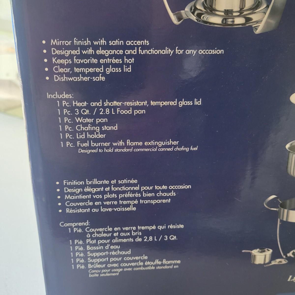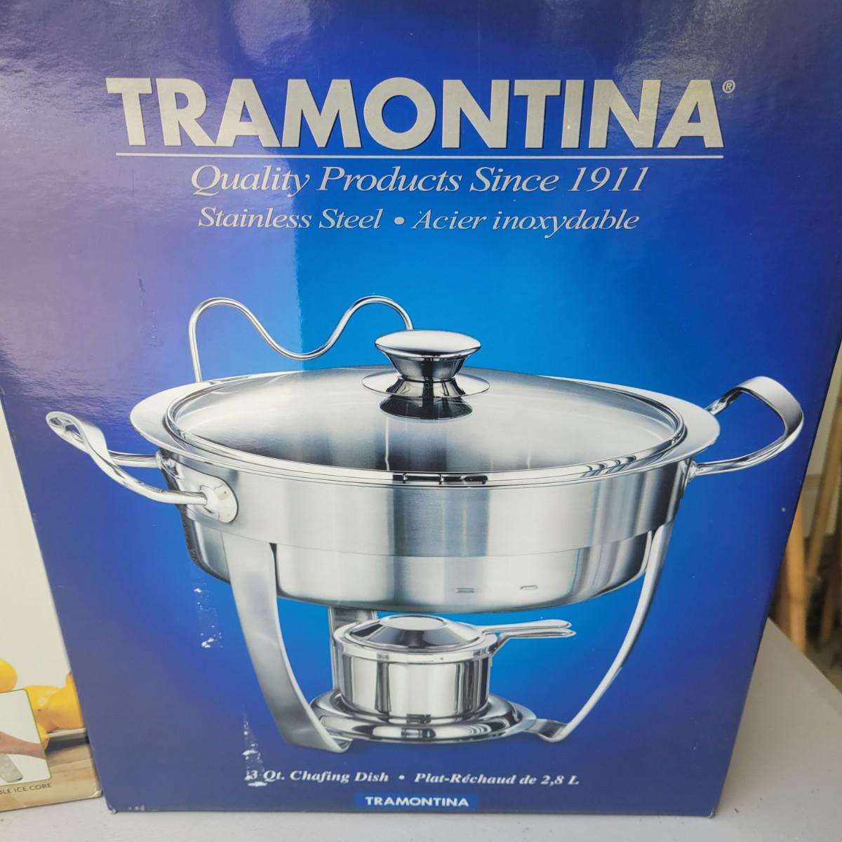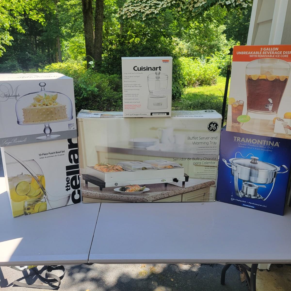 GE buffet server and warming tray. Three tray server with adjustable temperature control.. Michaelangelo glass cake stand with dome cover. Cuisinart 4 cup chopper/grinder. The cellar 10 piece punch bowl set. Tramontina 3 qt, stainless steel chafing dish. 3 gal unbreakable beverage dispenser. All items are new. Local pickup only