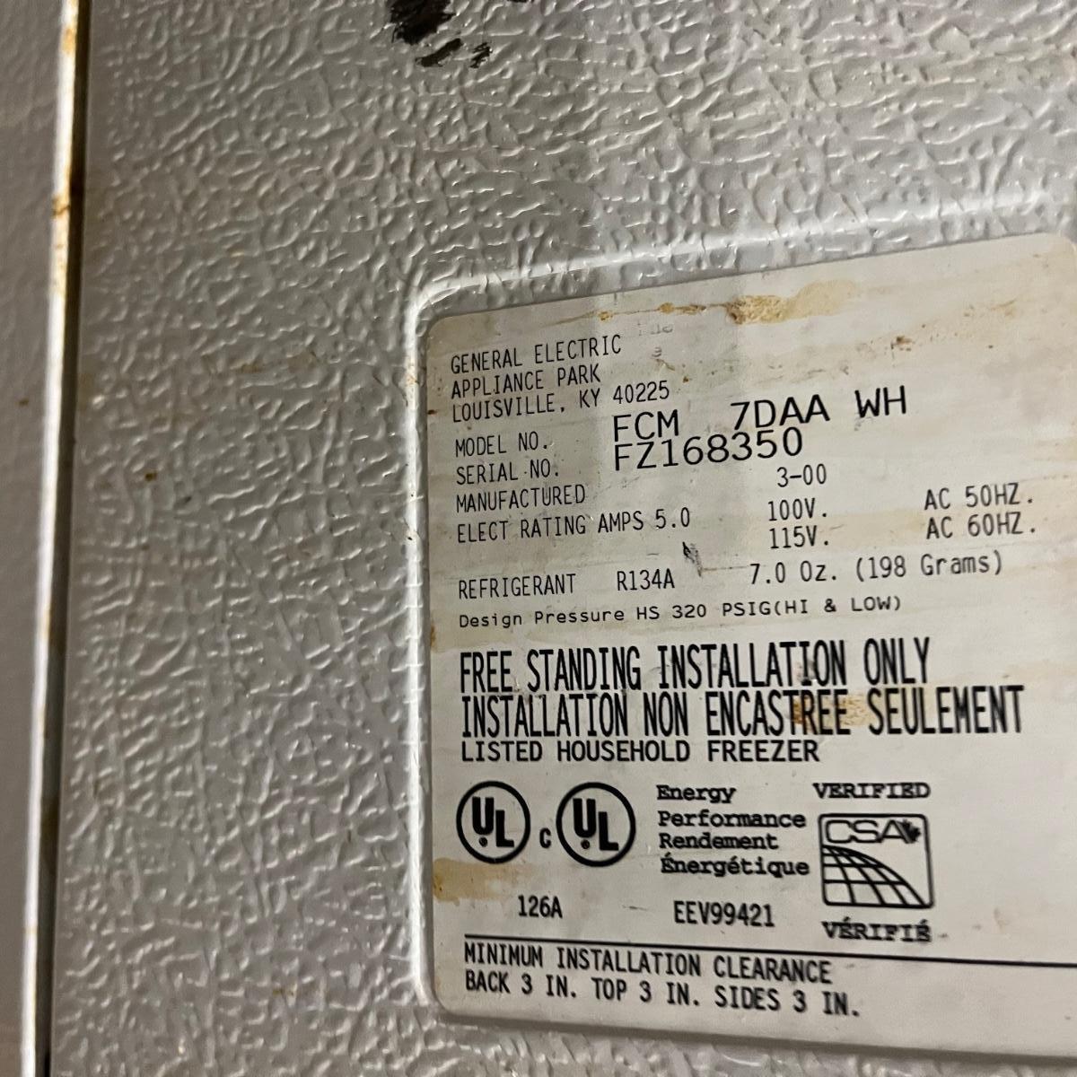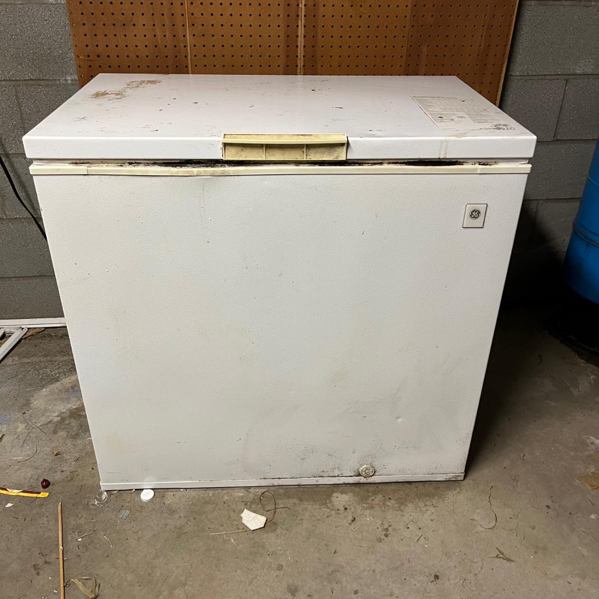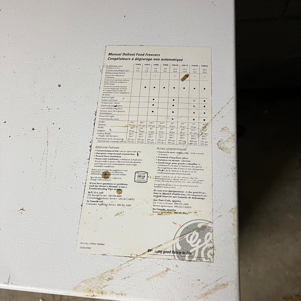 Lot includes a GE chest freezer model # FDM 7DAA WH manual defrost chest freezer. Freezer measures 23” x 35” x 34”. Freezer is dirty, but worked when tested. Bring help to move as item is substantial
