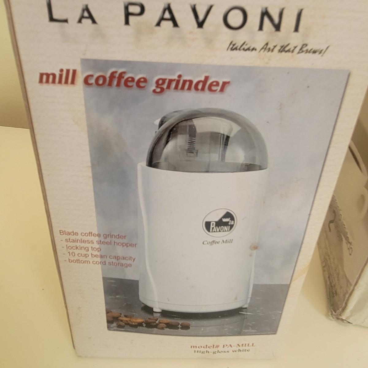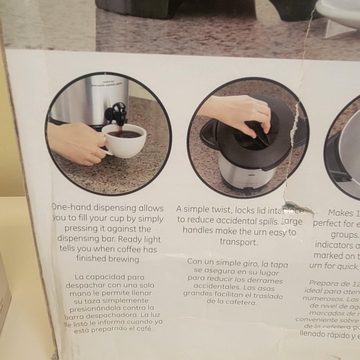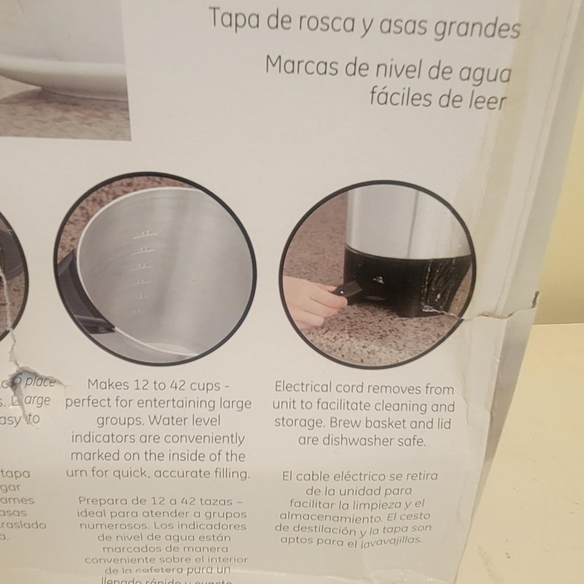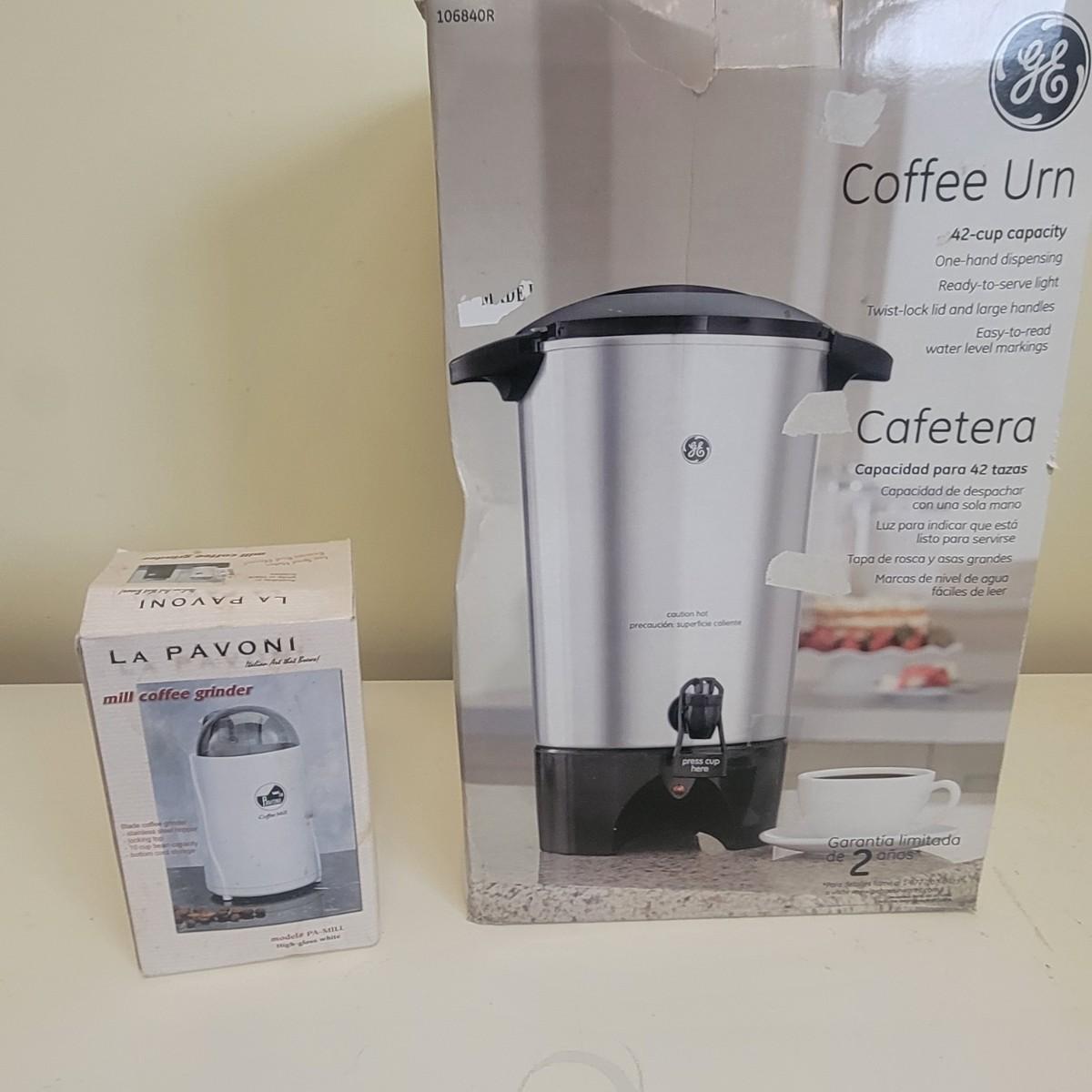 GE 42 cup coffee urn. Box is damaged, but urn is new and unused. Also includes La Pavoni compact mill coffee grinder still in original packaging. Local Pickup Only