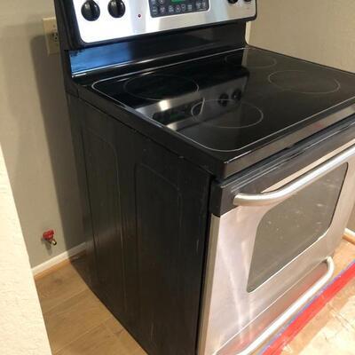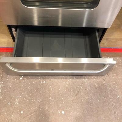 4 cooking spots. Stainless steel with black trim. Digital readout on control panel, self-cleaning, has bottom drawer for storing pans and baking sheets. Counter height, 30” wide. Pickup in La Habra by appt only.