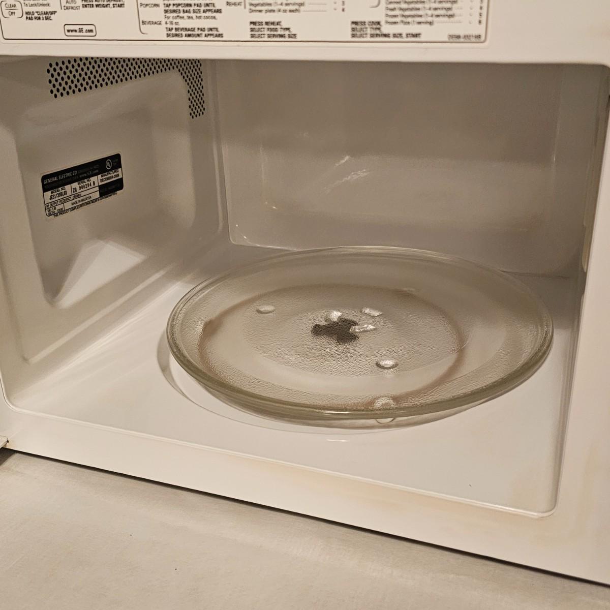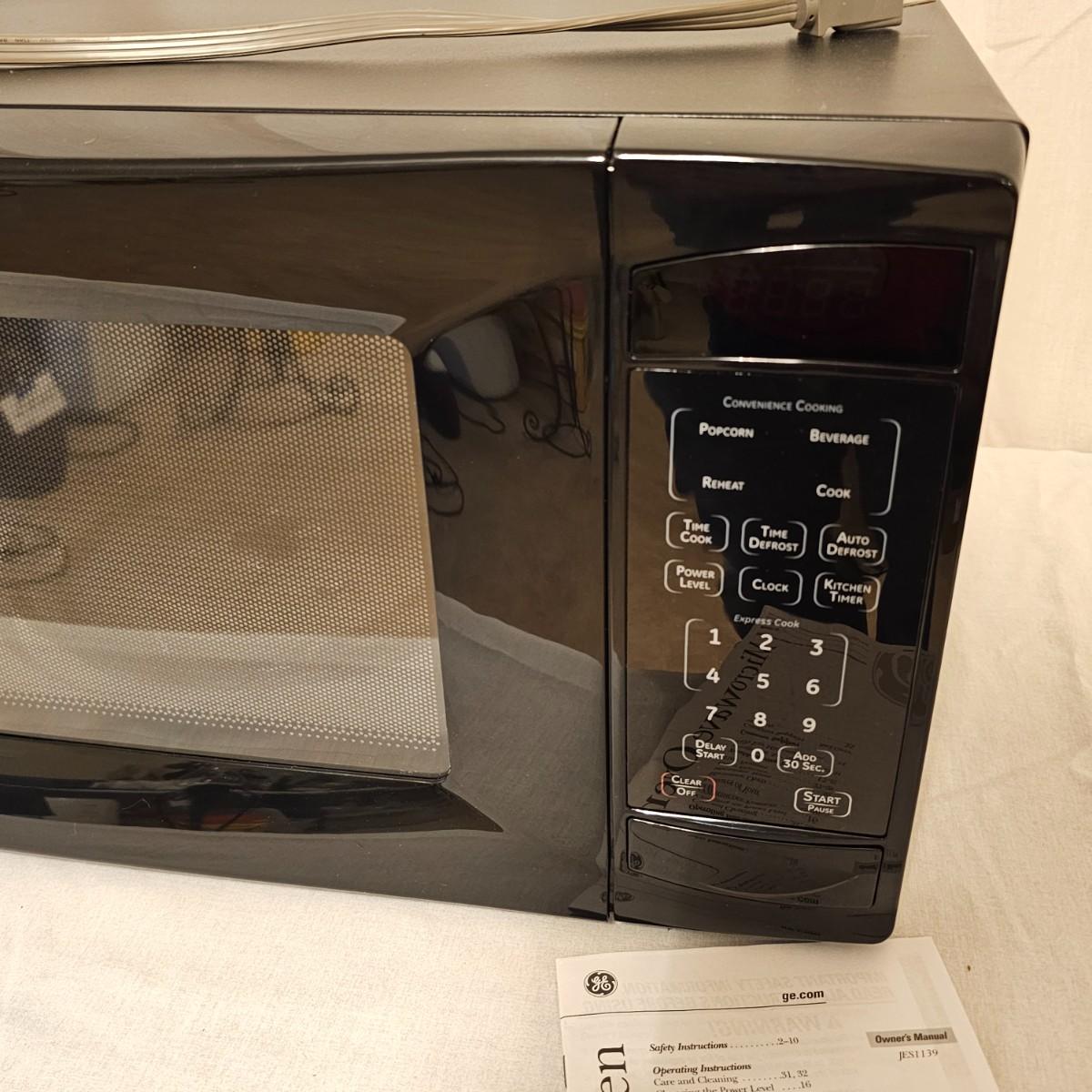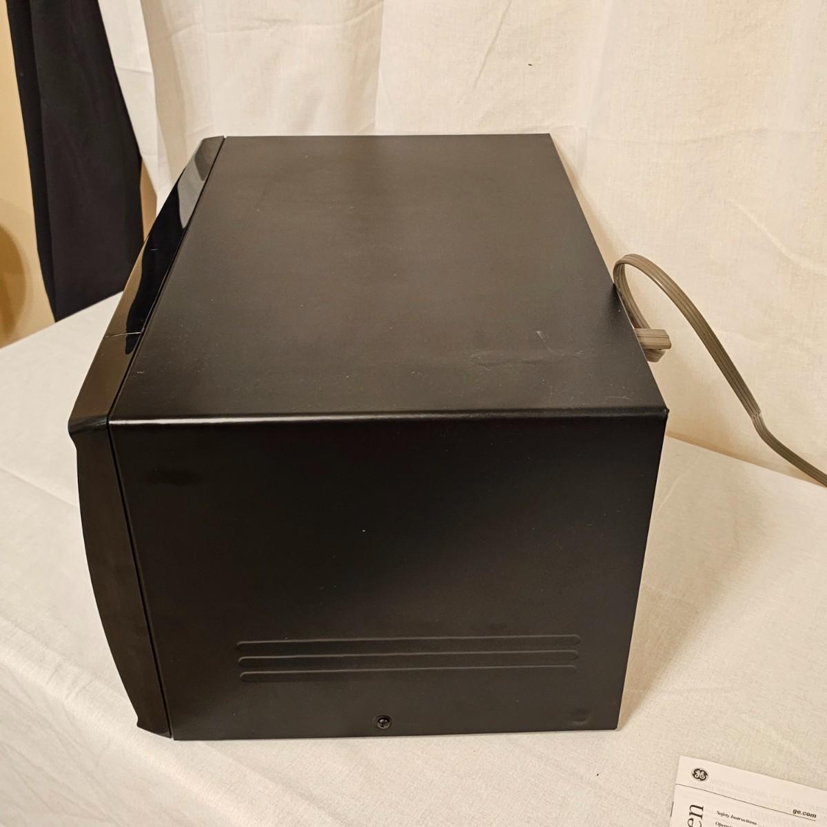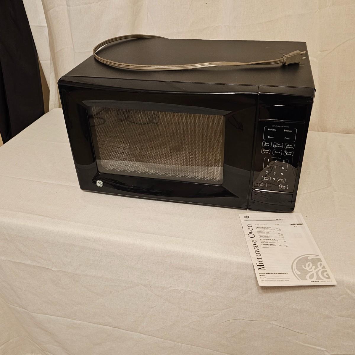 Compact tabletop size microwave oven by G.E. . Black with front control panel and manual. Unit measures 20.5" x 15.5" x 11.5"H and powered on when plugged in. Includes glass inside tray. See photos for details. Local pickup only.