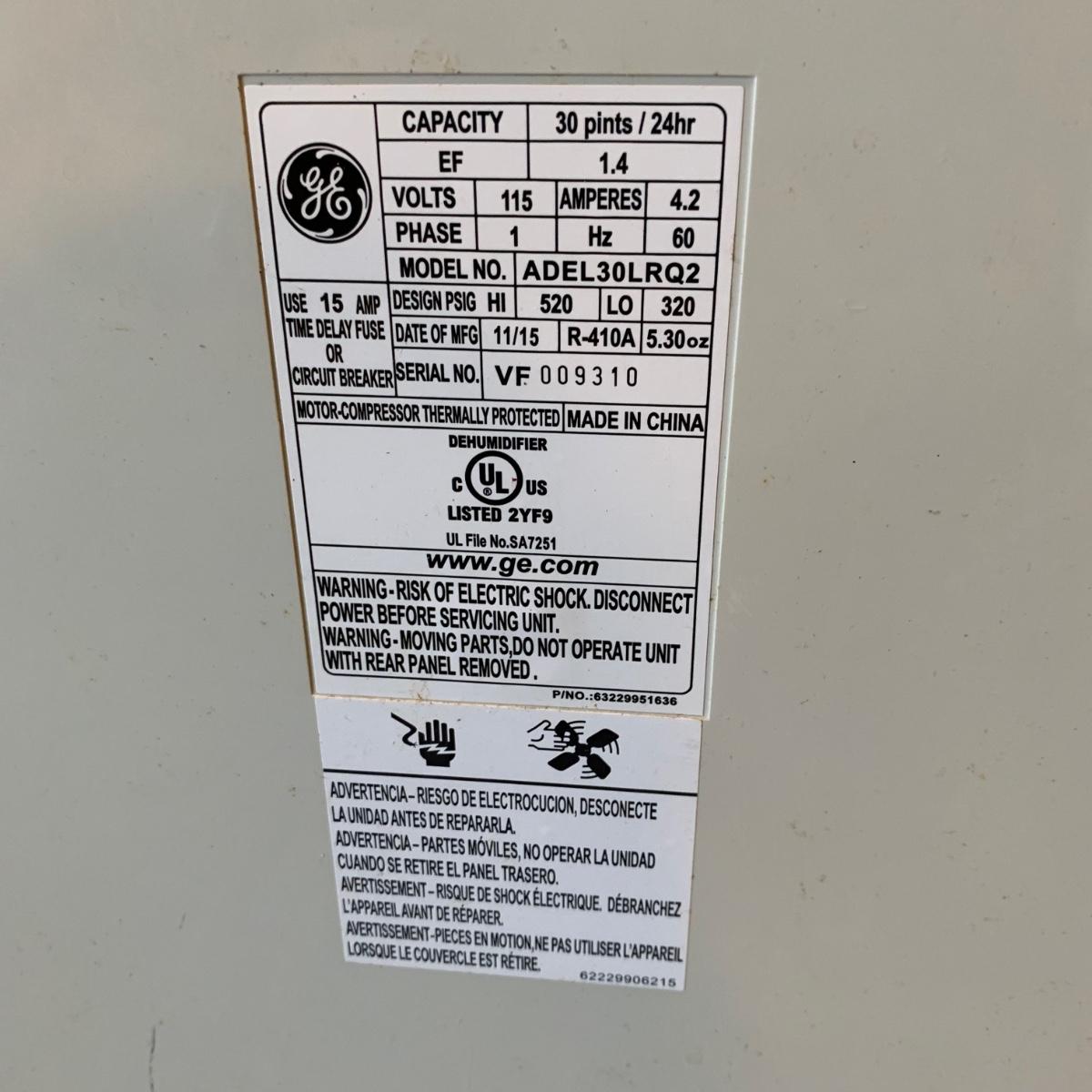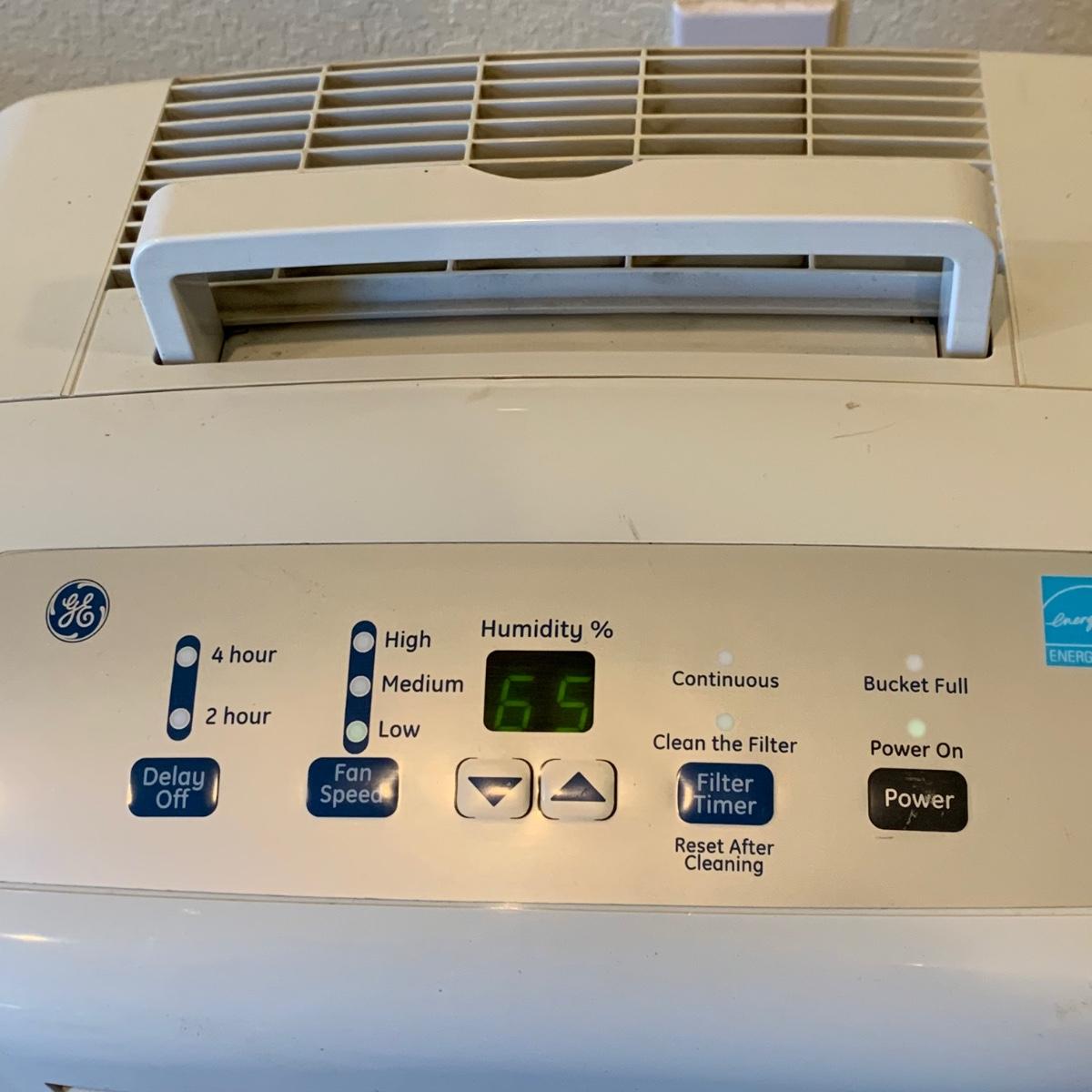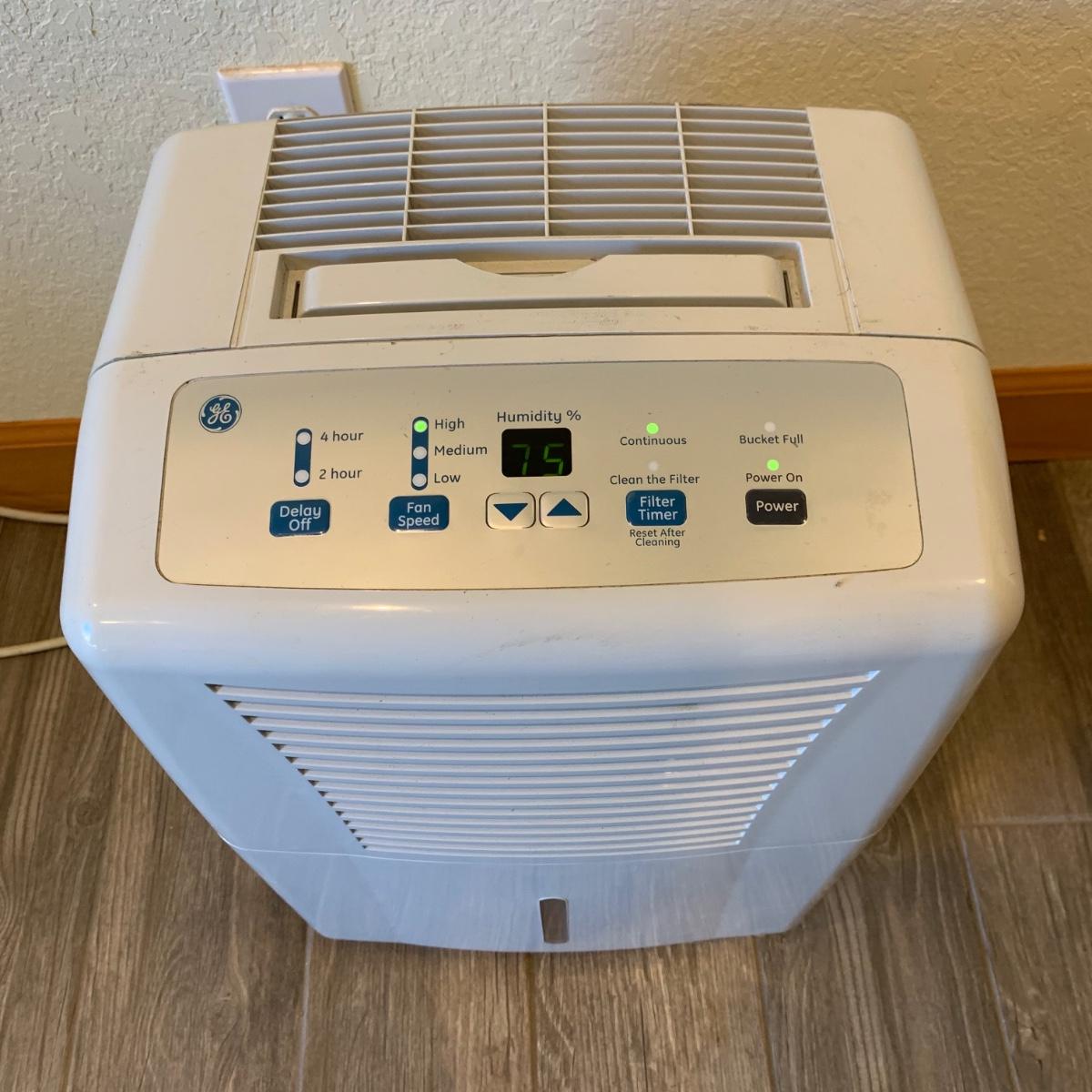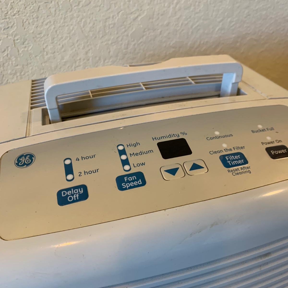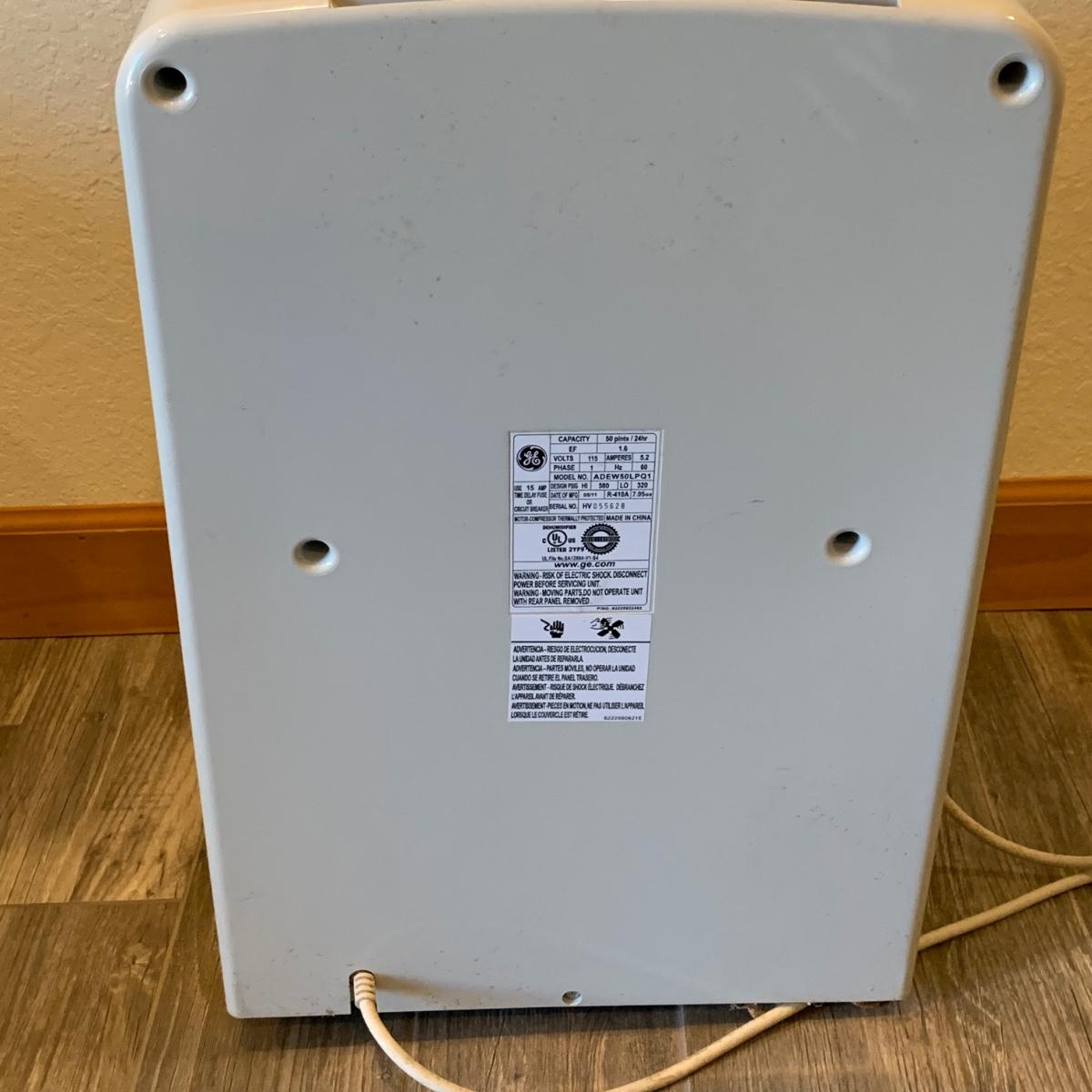 Three dehumidifiers, two are GE brand and one is Perfect Aire. All three powered on when plugged in. The largest GE dehumidifier measures 15” x 10.5” x 22.5”. The two GEs have retractable handles. Please see photos for model numbers. All three have casters, but the bigger GE is missing one.