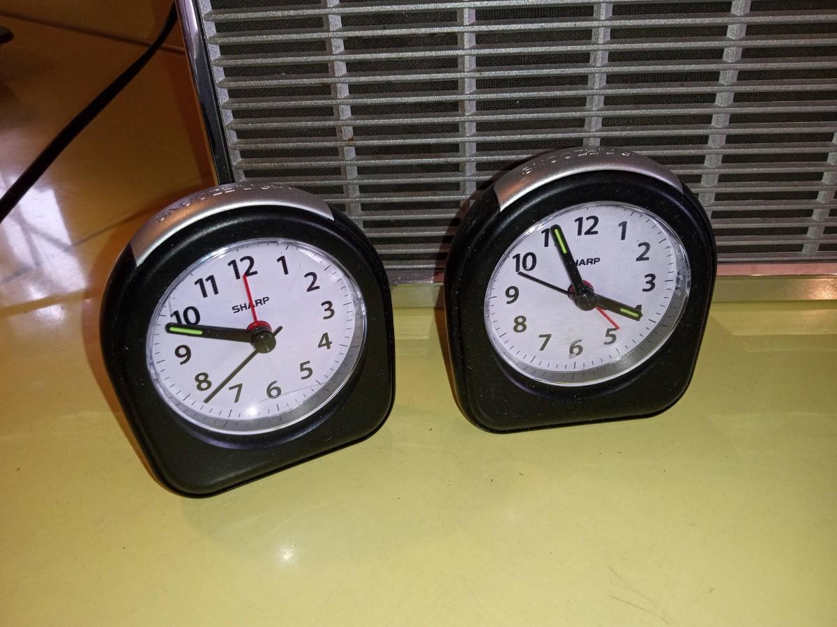 2 TRAVEL ALARM CLOCKS, WOODEN TOY TOP AND A BAROMETER