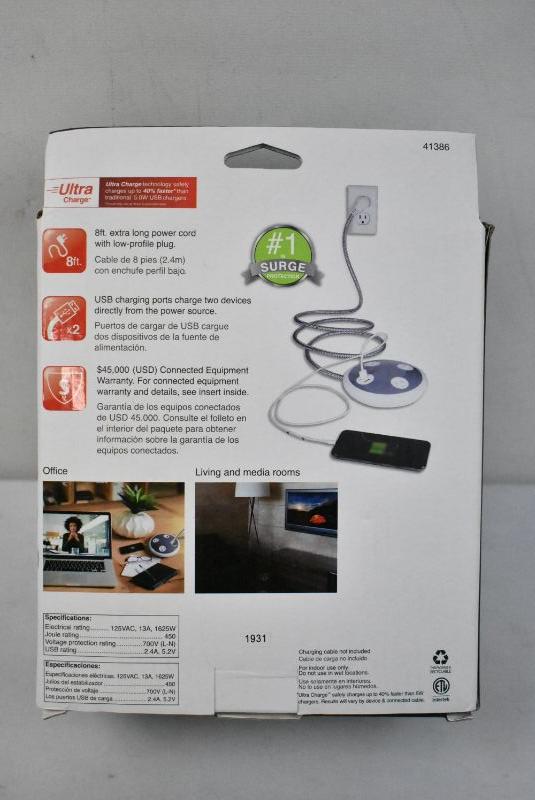 GE Pro 3-Outlet Power Center Extension Cord, 2-Port USB Charging, 8-Foot Cord, Surge Protection - New