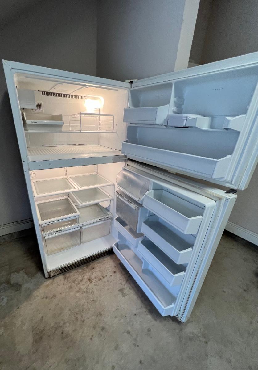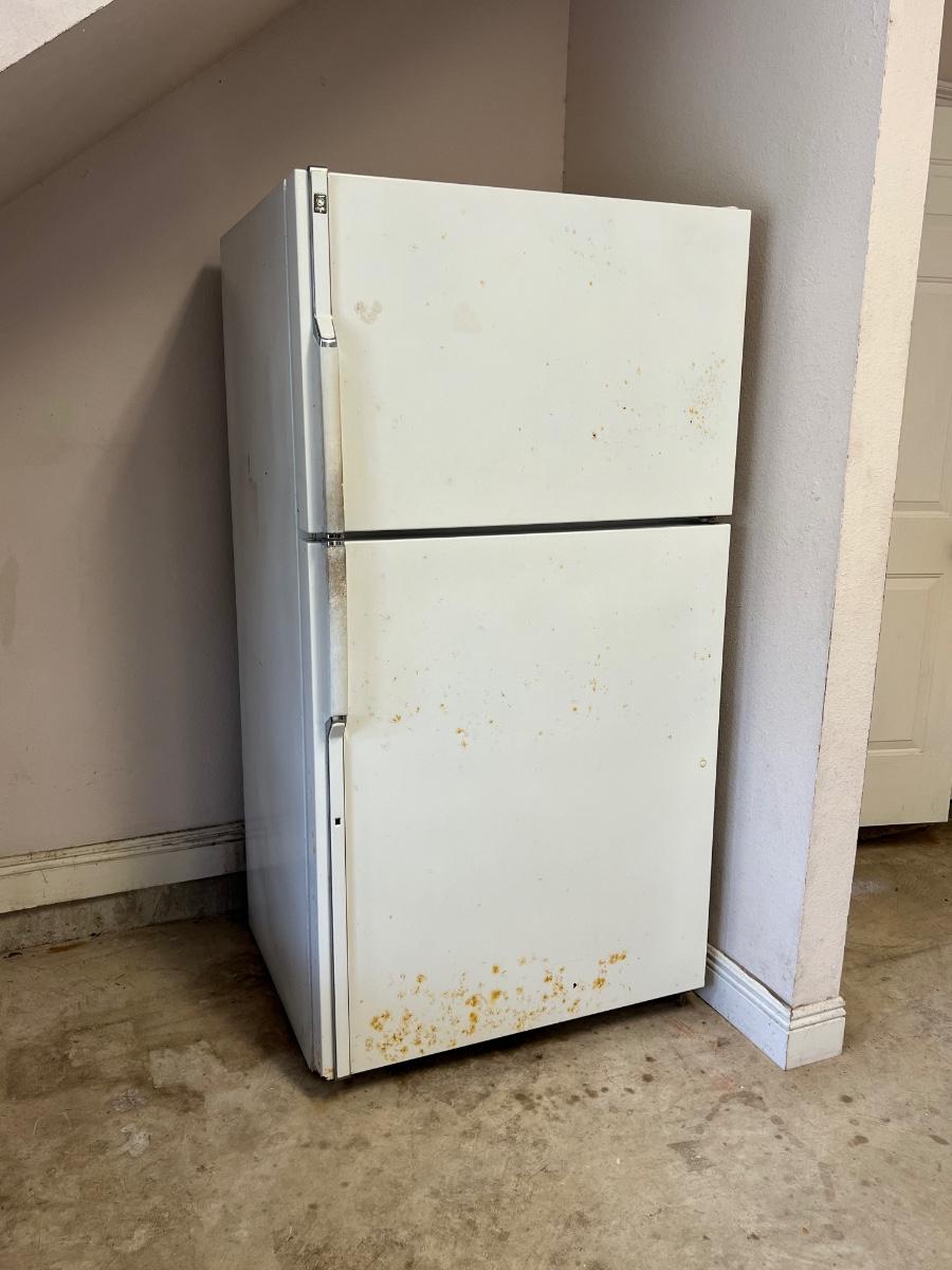Fridge has been kept in the garage ~ Ice maker does not work ~ Old, surface rust & needs additional cleaning. She is still running! ~ 67.5” H x 35” W x 32” D
