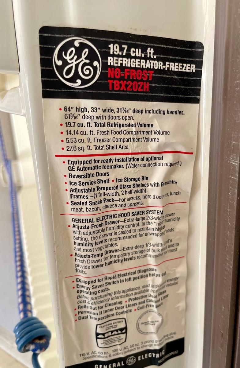 GE Refrigerator model TBX29ZH. Freezer on top. 19.7 cubic ft. In refrigerator, 5.5 cubic ft freezer. Measures 64” tall, 33” wide and 32” deep. Note: does not include ice maker.