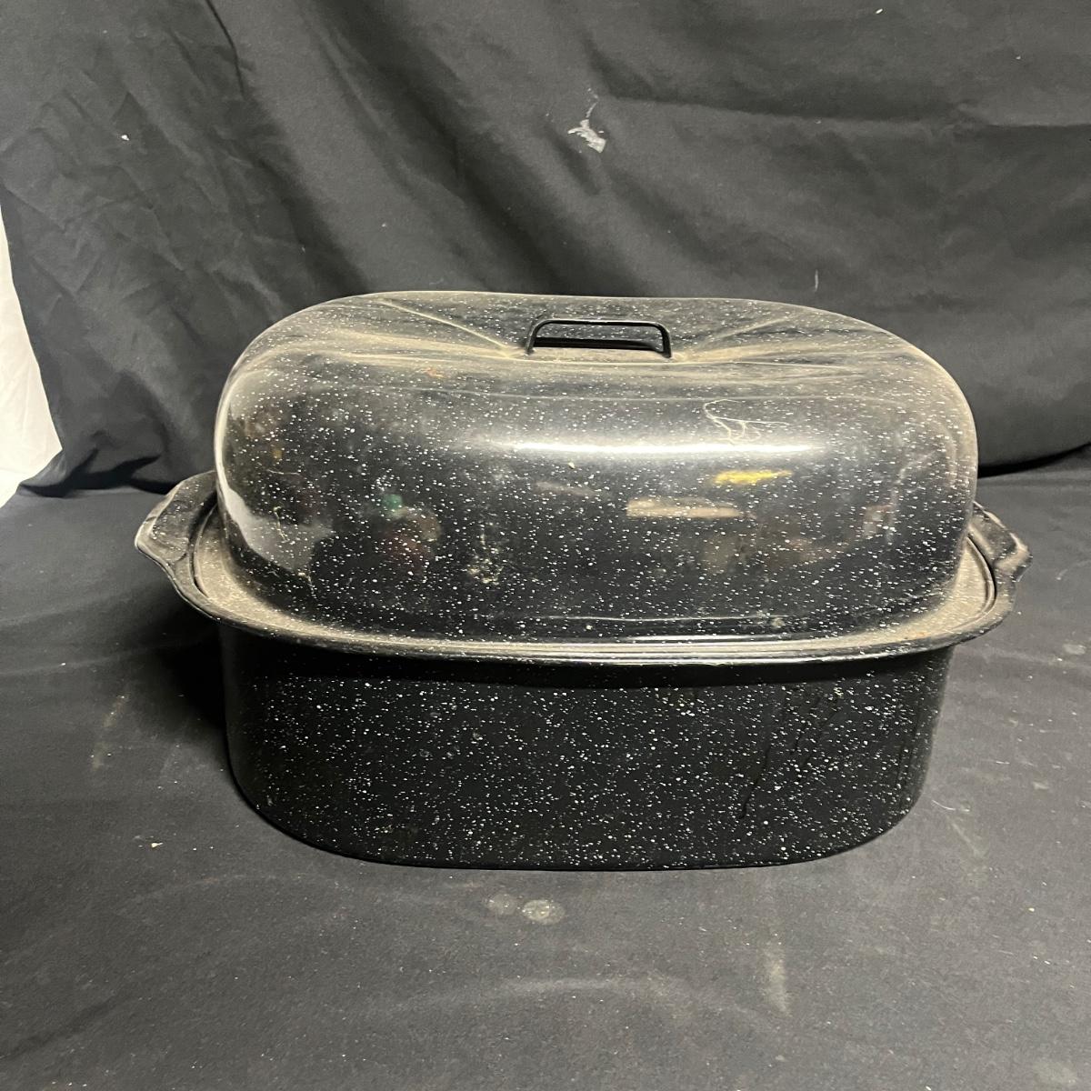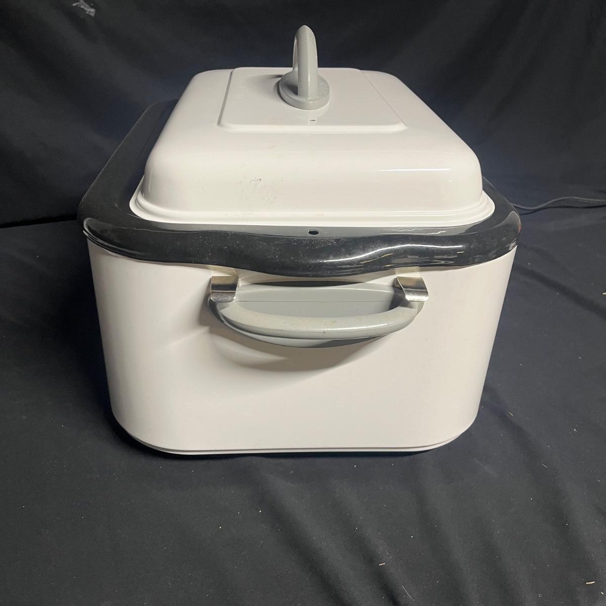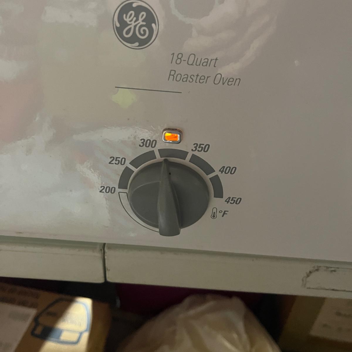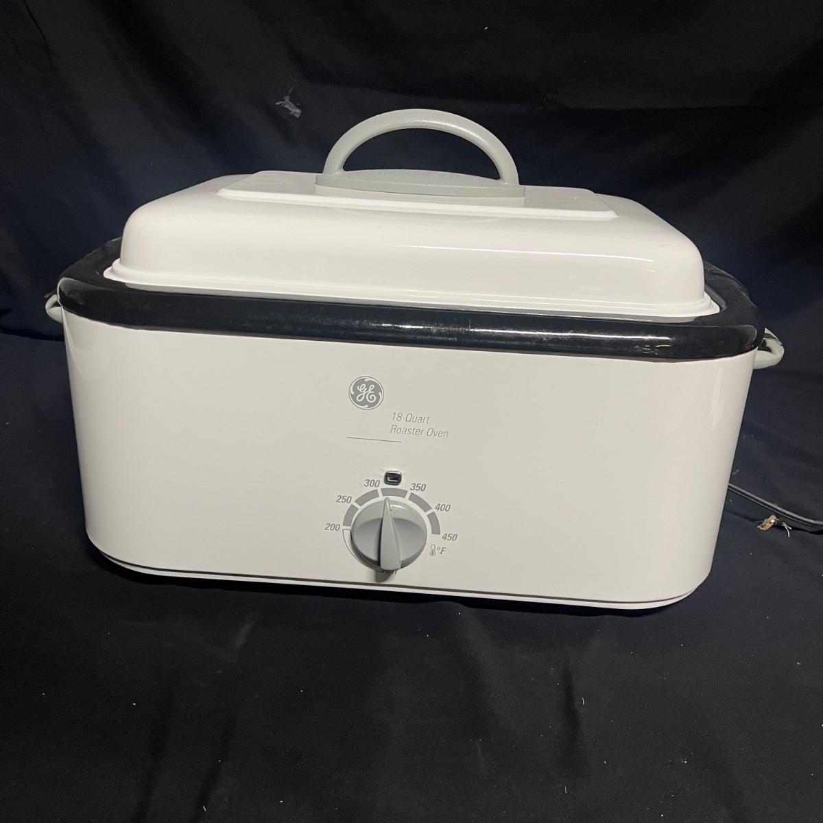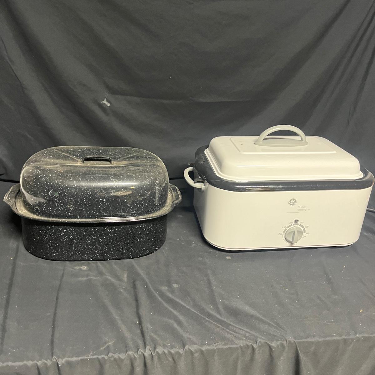 Lot includes a GE electric 18 quart roaster oven and a roasting pan with lid. GE oven measures 15” x 26” x 15”H and powered on when plugged in.