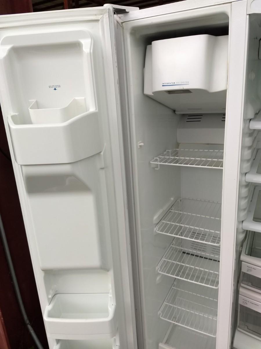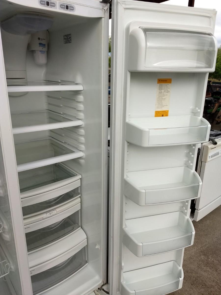 GE Side by Side Refrigerator with Ice Maker 36"x32"x69" clean and was in working condition before it was moved to the auction house