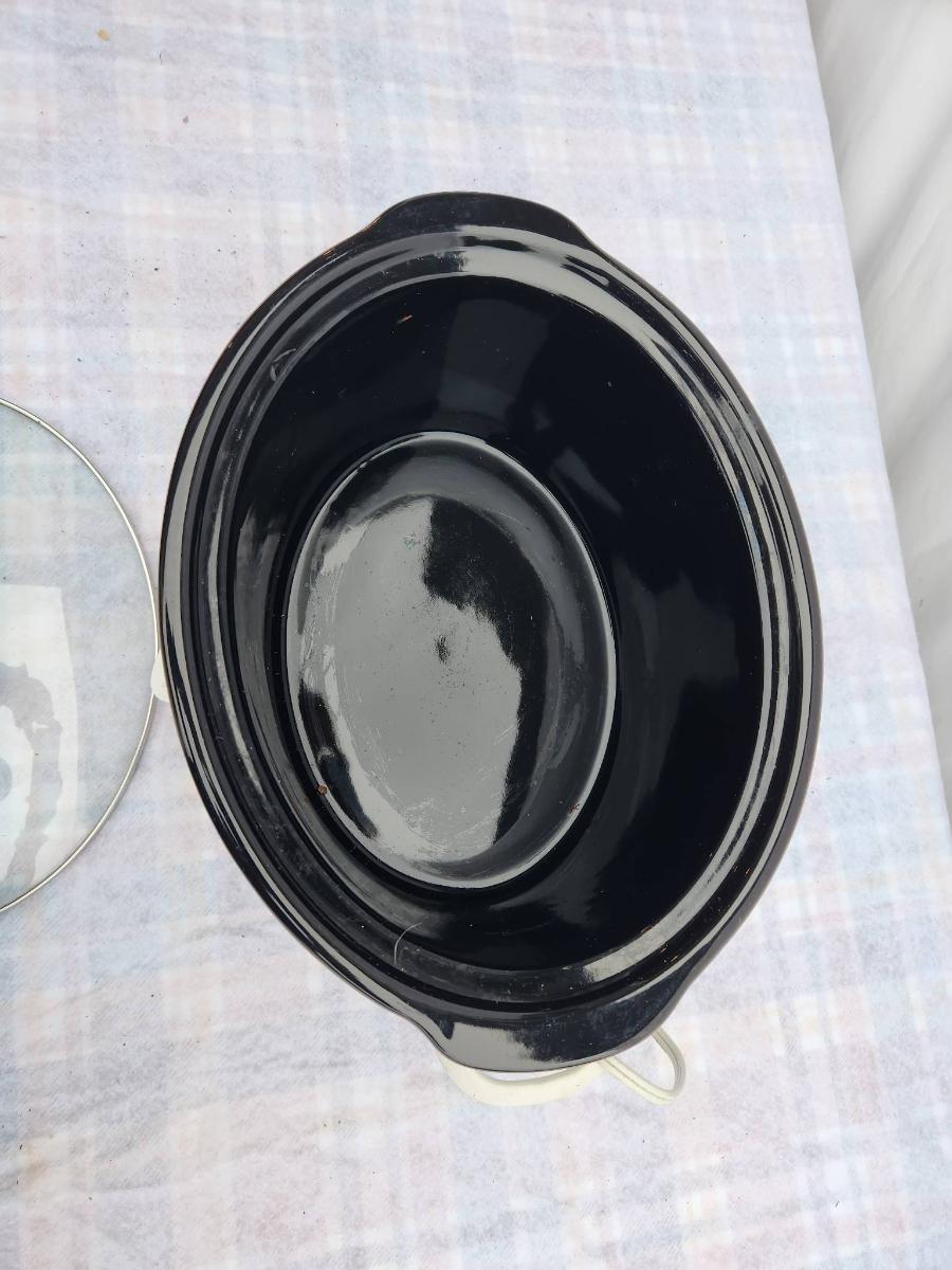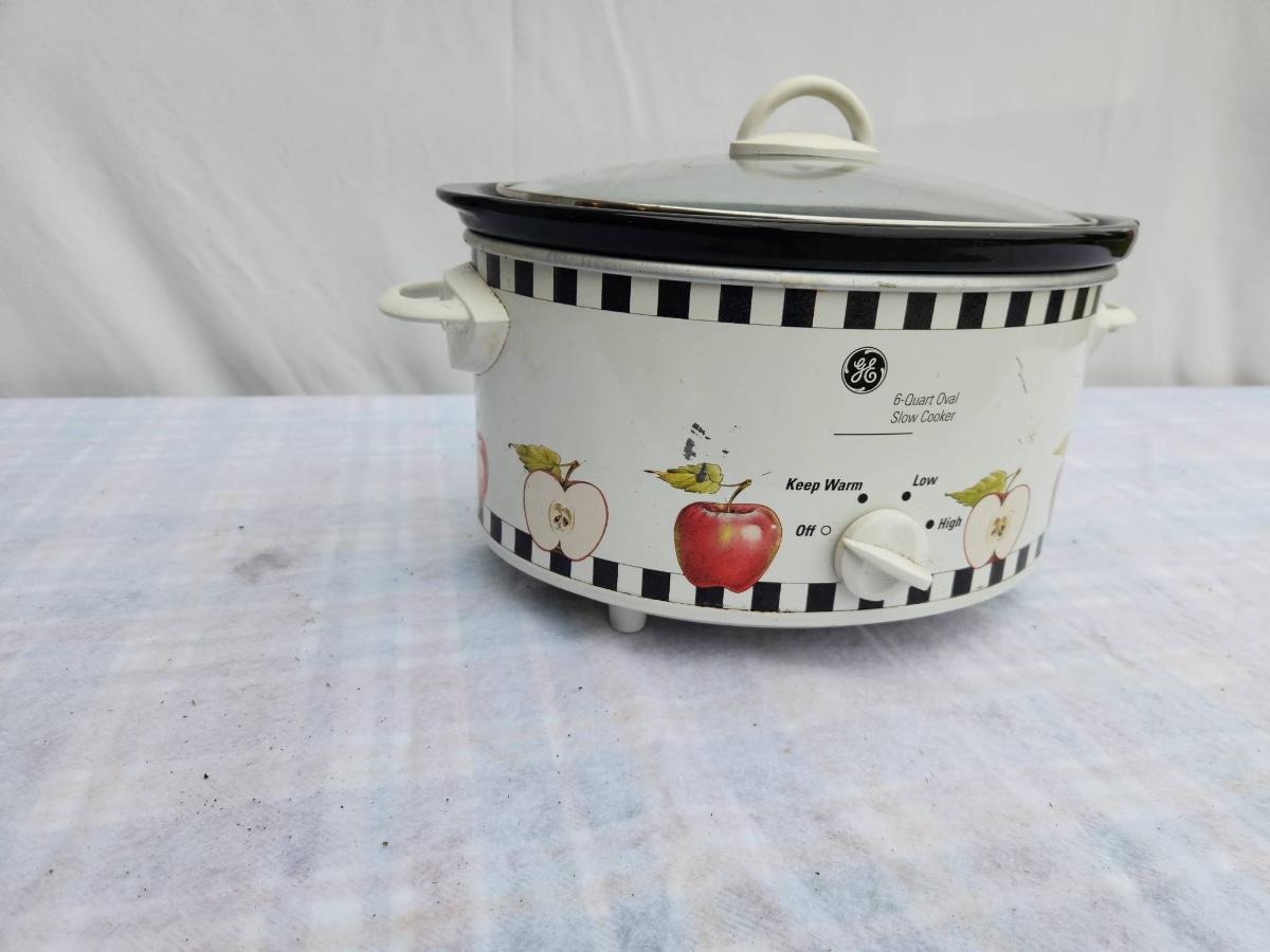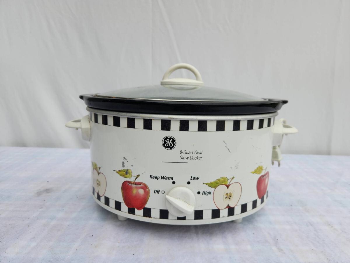 General Electric (GE) slow cooker featuring an apple design with black-and-white checkered trim. Includes a removable ceramic inner pot, glass lid with handle, and a dial for settings (off, warm, low, and high). Appears intact with visible use. Suitable for small to medium cooking tasks.