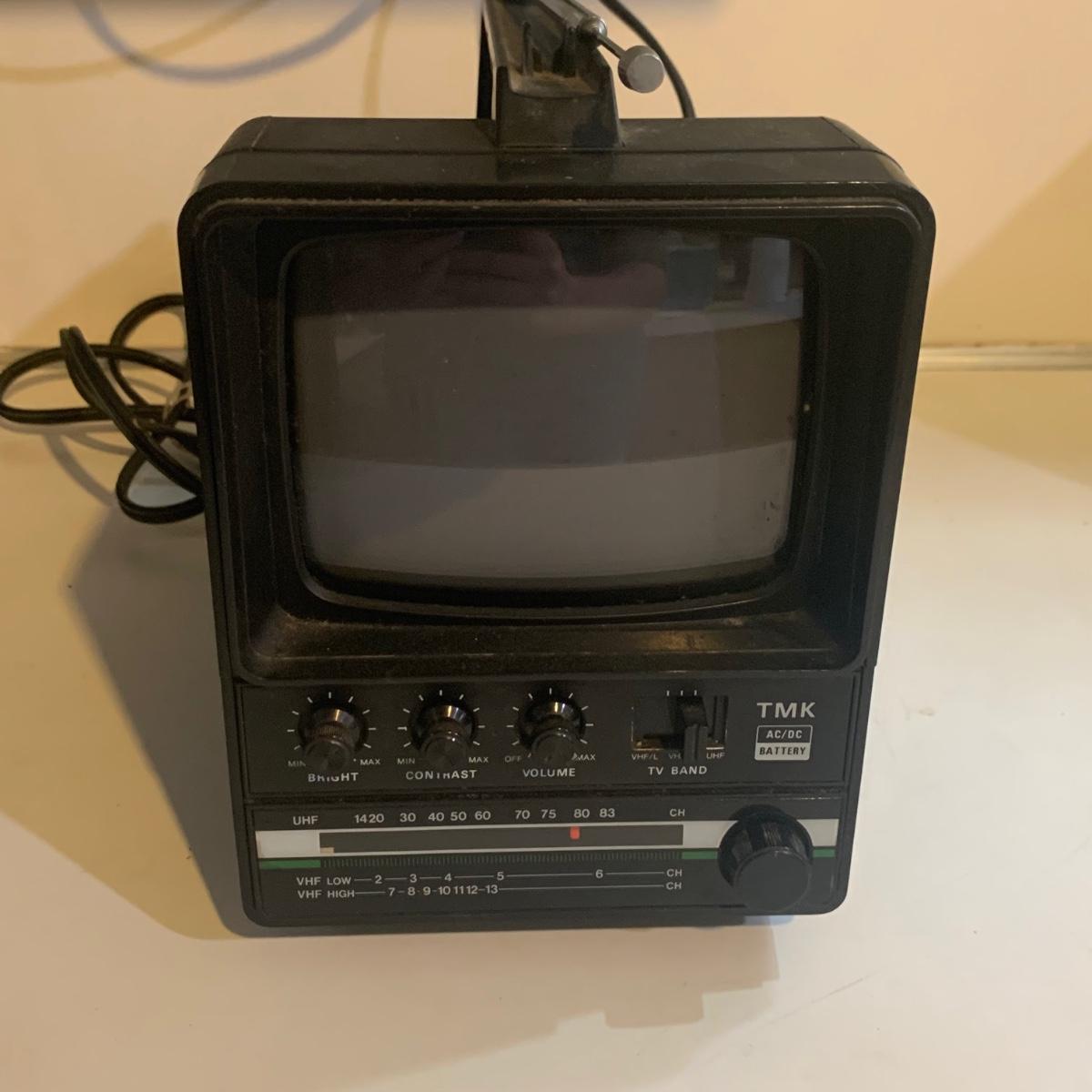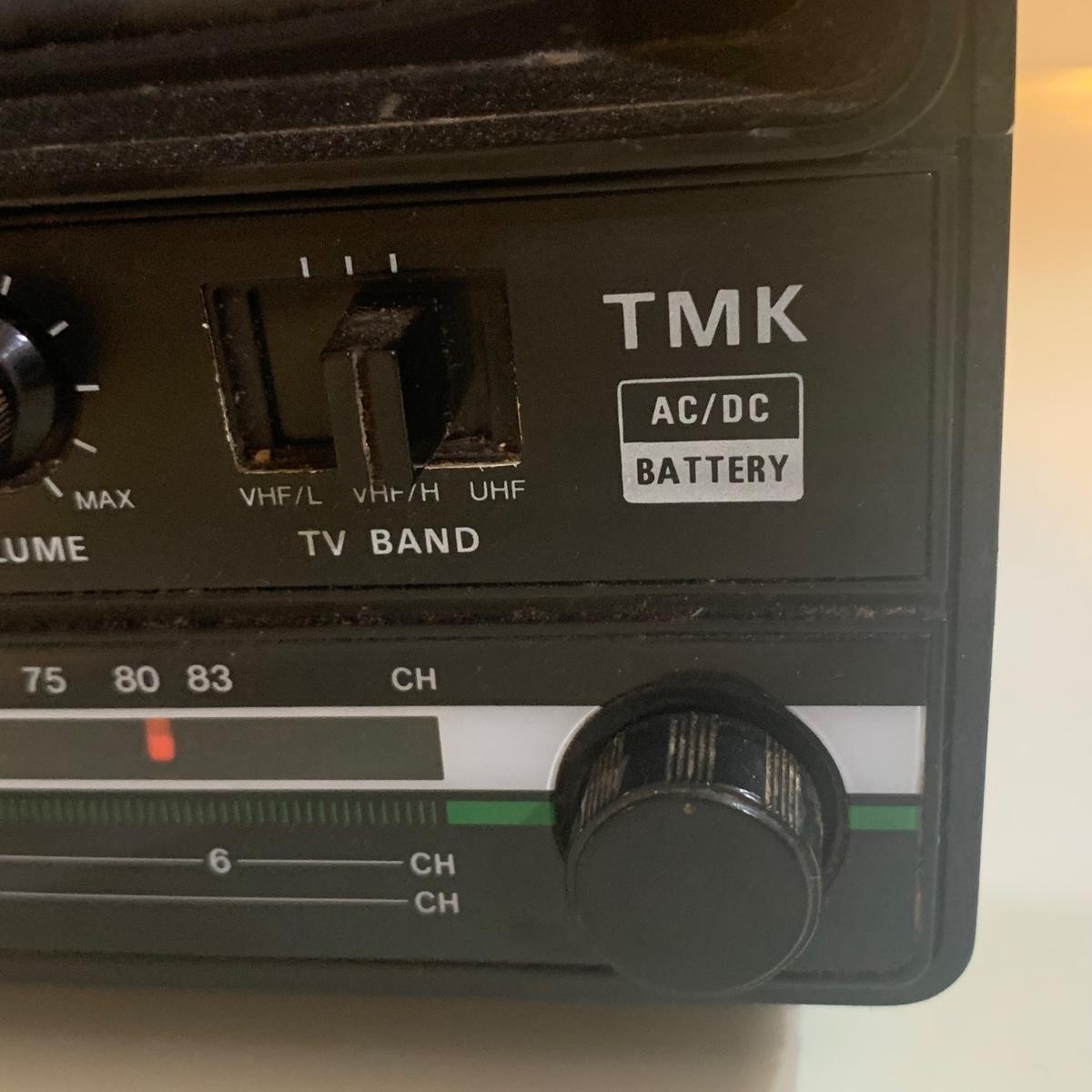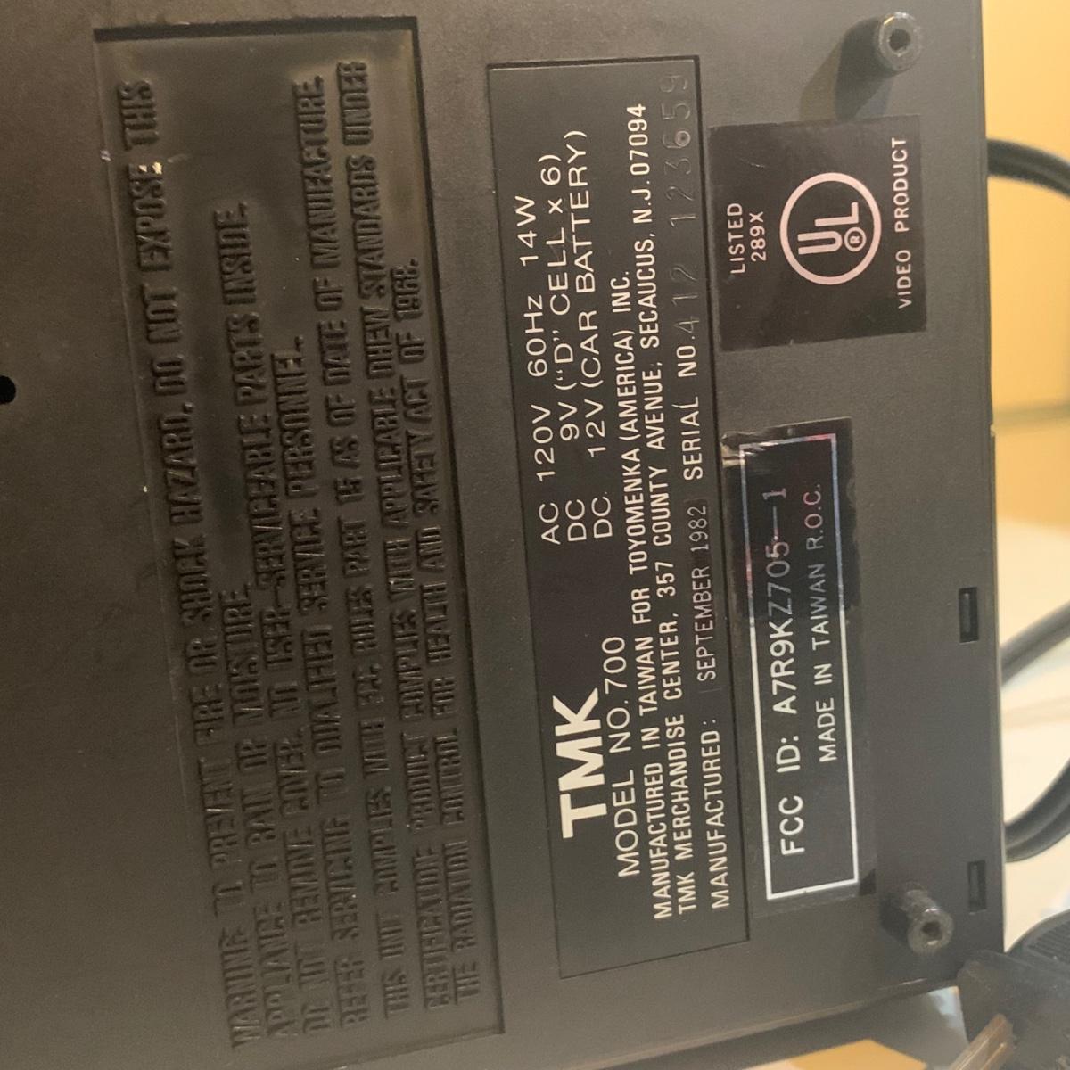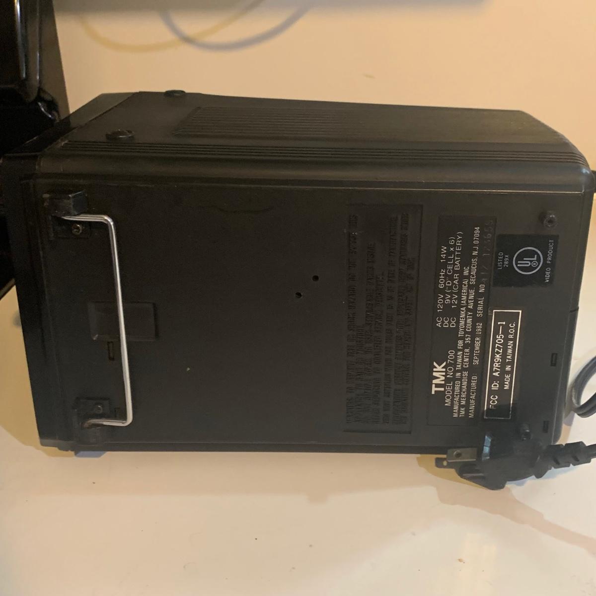 TMK Model 700 portable TV measures approximately 6” x 10” x 7.5”H. Unit powered on when plugged in.
